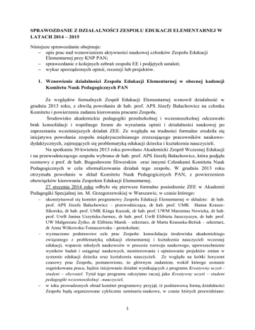 SPRAWOZDANIE Z DZIAŁALNOŚCI ZESPOŁU EDUKACJI ELEMENTARNEJ W LATACH 2014 – 2015 Niniejsze sprawozdanie obejmuje: opis prac nad wznowieniem aktywności naukowej członków Zespołu Edukacji Elementarnej przy KNP PAN; sprawozdanie z kolejnych zebrań zespołu EE i podjętych ustaleń; wykaz sporządzonych opinii, recenzji lub projektów. 1. Wznowienie działalności Zespołu Edukacji Elementarnej w obecnej kadencji Komitetu Nauk Pedagogicznych PAN Ze względów formalnych Zespół Edukacji Elementarnej wznowił działalność w grudniu 2013 roku, z chwilą powołaniu dr hab. prof. APS Józefy Bałachowicz na członka Komitetu i powierzenia zadania kierowania pracami Zespołu. Środowisko akademickie pedagogiki przedszkolnej i wczesnoszkolnej odczuwało brak konsolidacji i wspólnego forum do wyrażania opinii i działalności naukowej po zaprzestaniu wcześniejszych działań ZEE. Ze względu na trudności formalne zrodziła się inicjatywa powołania zespołu międzyuczelnianego zrzeszającego pracowników naukowodydaktycznych, zajmujących się problematyką edukacji dziecka i kształcenia nauczycieli. Na spotkaniu 30 kwietnia 2013 roku powołano Akademicki Zespół Wczesnej Edukacji i na przewodniczącego zespołu wybrano dr hab. prof. APS Józefę Bałachowicz, która podjęła rozmowy z prof. dr hab. Bogusławem Śliwerskim oraz innymi Członkami Komitetu Nauk Pedagogicznych w celu sformalizowania działań tego zespołu. W grudniu 2013 roku otrzymała powołanie w skład Komitetu Nauk Pedagogicznych PAN, z powierzeniem obowiązków kierowania Zespołem Edukacji Elementarnej. 27 stycznia 2014 roku odbyło się pierwsze formalne posiedzenie ZEE w Akademii Pedagogiki Specjalnej im. M. Grzegorzewskiej w Warszawie, w czasie którego: ukonstytuował się komitet programowy Zespołu Edukacji Elementarnej w składzie: dr hab. prof. APS Józefa Bałachowicz – przewodnicząca, dr hab. prof. UMK Hanna KrauzeSikorska, dr hab. prof. UMK Kinga Kuszak, dr hab. prof. UWM Marzenna Nowicka, dr hab. prof. UwB Janina Uszyńska-Jarmoc, dr hab. prof. UwB Elżbieta Jaszczyszyn, dr hab. prof. UW Małgorzata Żytko, dr Elżbieta Marek – sekretarz, dr Marta Krasuska-Betiuk – sekretarz, dr Anna Witkowska-Tomaszewska – protokolant; wyznaczono podstawowe cele prac Zespołu: konsolidacja środowiska akademickiego związanego z problematyką edukacji elementarnej i kształcenia nauczycieli wczesnej edukacji, wsparcie młodych naukowców w procesie rozwoju naukowego, upowszechnienie wyników badań i osiągnięć naukowych, monitorowanie i opiniowanie projektów zmian w systemie edukacji dziecka oraz kształcenia nauczycieli. Ze względu na krótki horyzont czasowy prac Zespołu, postanowiono, że głównym zadaniem, wokół którego zostanie zogniskowana praca, będzie inicjowanie działań wynikających z programu Kreatywny uczeń student – obywatel. Tytuł tego programu odczytano raczej jako Kreatywny uczeń – student pedagogiki wczesnoszkolnej –nauczyciel; w toku prowadzonych obrad komitet programowy przyjął, iż podstawową formą działalności Zespołu będą organizowane cyklicznie seminaria naukowe, w czasie których przewidziano: 1 tematyczne wystąpienia, dyskusje naukowe, przegląd nowości wydawniczych oraz seminaria robocze zespołów problemowych i zespołów badawczych; podczas obrad wypracowano procedurę powołania członków Zespołu Edukacji Elementarnej oraz ustalono terminarz posiedzeń plenarnych ZEE. Jako główne miejsce posiedzeń uczyniono Akademię Pedagogiki Specjalnej w Warszawie. 2. Terminarz posiedzeń plenarnych ZEE, program i najważniejsze ustalenia Od stycznia 2014 roku odbyło się siedem posiedzeń plenarnych (i wcześniej jedno programowo-organizacyjne) 24 lutego 2014 roku, w programie: wykład prof. dr hab. Stanisława Dylaka, UAM pt. Architektura wiedzy w szkole – Gość zaprezentował najnowsze wyniki nad funkcjonowaniem mózgu i płynące z nich wnioski do systemu edukacji - perspektywy implementacji neurodydaktyki na grunt praktyki szkolnej. Prof. dr hab. Heleny Siwek przedstawiła wyniki badań umiejętności matematycznych trzecioklasistów w świetle poziomu aktywności występujących w procesie rozwiązywania zadań z podręczników do kształcenia zintegrowanego. Wyniki badań pokazują, iż autorzy podręczników dostępnych na rynku wydawniczym skupiają się przede wszystkim na strategiach: (a) rozróżnienia – dostrzeganie w przedmiotach cech wspólnych bądź odmiennych; (b) tworzenia pojęć konkretnych – tworzenie klas konkretnych przedmiotów o wspólnych własnościach natomiast marginalnie traktują. Natomiast marginalnie traktują: (a) pojęcia abstrakcyjne i reguły proste – konstruowanie opisu słownego; (b) reguły złożone – budowanie reguł będących kombinacją prostszych reguł; (c) rozwiązywanie problemu – „odkrycie” lub wynalezienie przez ucznia rozwiązania. Dr Anna Witkowska-Tomaszewska przedstawiła perspektywę finansowania edukacji w latach 2014-2020 przez Ministerstwo Nauki i Szkolnictwa Wyższego oraz Ministerstwo Edukacji Narodowej w obszarze projektów edukacyjnych oraz grantów badawczych. Podczas spotkania zaprezentowane zostały główne założenia programu Kreatywny uczeństudent – obywatel, wokół którego zogniskowana miała zostać praca Zespołu Edukacji Elementarnej w roku 2014 roku. Dr hab. prof. UwB Janina Uszyńska-Jarmoc zaproponowała obszary ewentualnych prac koncepcyjnych i badawczych Zespołu: badania obejmujące predyspozycje twórcze/potencjał twórczy dzieci w wieku przedszkolnym i młodszym wieku szkolnym; badania obejmujące predyspozycje twórcze studentów pedagogiki przedszkolnej i wczesnoszkolnej – przyszłych nauczycieli oraz czynnych nauczycieli, doskonalących się na studiach podyplomowych; opracowanie programu rozwijania kreatywności kandydatów na nauczycieli, opracowanie nowych (propozycje zmian) standardów kształcenia nauczycieli przedszkoli i klas I-III i