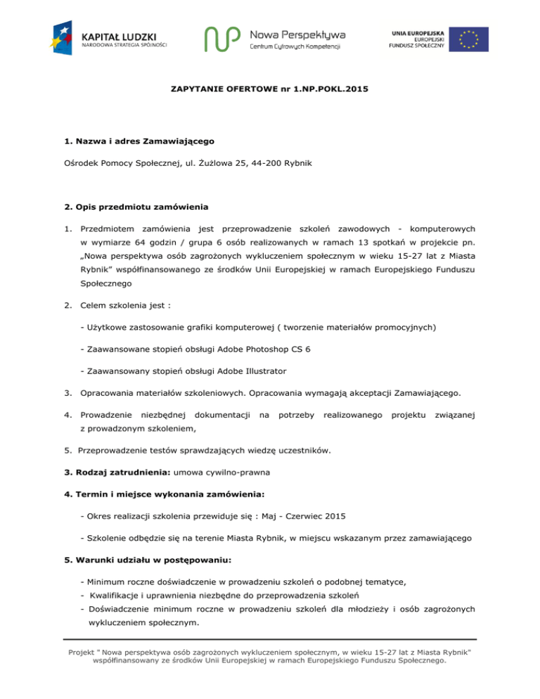 ZAPYTANIE OFERTOWE nr 1.NP.POKL.2015 1. Nazwa i adres Zamawiającego Ośrodek Pomocy Społecznej, ul. Żużlowa 25, 44-200 Rybnik 2. Opis przedmiotu zamówienia 1. Przedmiotem zamówienia jest przeprowadzenie szkoleń zawodowych - komputerowych w wymiarze 64 godzin / grupa 6 osób realizowanych w ramach 13 spotkań w projekcie pn. „Nowa perspektywa osób zagrożonych wykluczeniem społecznym w wieku 15-27 lat z Miasta Rybnik” współfinansowanego ze środków Unii Europejskiej w ramach Europejskiego Funduszu Społecznego 2. Celem szkolenia jest : - Użytkowe zastosowanie grafiki komputerowej ( tworzenie materiałów promocyjnych) - Zaawansowane stopień obsługi Adobe Photoshop CS 6 - Zaawansowany stopień obsługi Adobe Illustrator 3. Opracowania materiałów szkoleniowych. Opracowania wymagają akceptacji Zamawiającego. 4. Prowadzenie niezbędnej dokumentacji na potrzeby realizowanego projektu związanej z prowadzonym szkoleniem, 5. Przeprowadzenie testów sprawdzających wiedzę uczestników. 3. Rodzaj zatrudnienia: umowa cywilno-prawna 4. Termin i miejsce wykonania zamówienia: - Okres realizacji szkolenia przewiduje się : Maj - Czerwiec 2015 - Szkolenie odbędzie się na terenie Miasta Rybnik, w miejscu wskazanym przez zamawiającego 5. Warunki udziału w postępowaniu: - Minimum roczne doświadczenie w prowadzeniu szkoleń o podobnej tematyce, - Kwalifikacje i uprawnienia niezbędne do przeprowadzenia szkoleń - Doświadczenie minimum roczne w prowadzeniu szkoleń dla młodzieży i osób zagrożonych wykluczeniem społecznym. Projekt " Nowa perspektywa osób zagrożonych wykluczeniem społecznym, w wieku 15-27 lat z Miasta Rybnik" współfinansowany ze środków Unii Europejskiej w ramach Europejskiego Funduszu Społecznego. 6. Oferta powinna zawierać: 1. CV / informacja o profilu firmy z informacją o wyrażeniu zgody na przetwarzanie danych osobowych oraz dokumenty potwierdzające kwalifikacje i doświadczenie zawodowe (w tym rekomendacje) 2. Cenę w PLN za wykonanie usługi w przeliczeniu na 1 godzinę 3. W przypadku osób ubiegających się o zatrudnienie w ramach umowy cywilno – prawnej oświadczenie o osiąganiu bądź nie osiąganiu min. najniższego wynagrodzenia ze stosunku pracy tj. 1750 zł brutto. 4. W przypadku gdy ofertę składa firma aktualny wpis (ważny 6 m-cy) do odpowiedniego rejestru i wykaz osób upoważnionych do podpisywania zobowiązań. 7. Opis sposobu przygotowania oferty: 1. 2. Oferta może być złożona w formie pisemnej, elektronicznej lub faksowej. Zamawiający może żądać przedstawienia oryginału lub notarialnie poświadczonej kopii dokumentu . 8. Kryteria oceny ofert 1. Zamawiający oceni i porówna jedynie te oferty, które nie zostaną odrzucone przez Zamawiającego. 2. Oferty zostaną ocenione przez Zamawiającego w oparciu o następujące kryteria: -Cena ofertowa – 90% - Doświadczenie Wykonawcy – 10% 9. Informacje dodatkowe. 1. W toku badania i oceny ofert Zamawiający może żądać od Wykonawców wyjaśnień dotyczących treści złożonych ofert oraz ich uzupełnień (jeżeli nie naruszy to zasad uczciwej konkurencji). 2. Zamawiający zastrzega sobie prawo sprawdzania w toku oceny oferty wiarygodności przedstawionych przez Wykonawców dokumentów. 3. Zamawiający odrzuca ofertę: Projekt " Nowa perspektywa osób zagrożonych wykluczeniem społecznym, w wieku 15-27 lat z Miasta Rybnik" współfinansowany ze środków Unii Europejskiej w ramach Europejskiego Funduszu Społecznego. - w przypadku nie spełniania warunków udziału w postępowaniu; - w przypadku niezgodności oferty z niniejszym zapytaniem; - w przypadku przedstawienia przez Wykonawcę informacji nieprawdziwych. 4. Każdy Wykonawca może złożyć tylko jedną ofertę. 5. Wykonawca ponosi wszelkie koszty związane z przygotowaniem i złożeniem oferty. 10. Osoby uprawnione do porozumiewania się z Wykonawcami Osobami upoważnionymi przez Zamawiającego do kontaktowania się z Wykonawcami są: Justyna Kluger, [email protected] , tel. 32 439 93 31 Mirosław Górka, [email protected] tel. 32 439 93 31 11. Miejsce, termin i sposób złożenia oferty: Ofertę należy złożyć w nieprzekraczalnym terminie do dnia 26.05.2015 r.: do godziny 15:00 na adres mailowy [email protected] lub adres: Ośrodek Pomocy Społecznej ul. Żużlowa 25 44-200 Rybnik tel.32 439 93 17; fax. 32 42 601 21 Projekt " Nowa perspektywa osób zagrożonych wykluczeniem społecznym, w wieku 15-27 lat z Miasta Rybnik" współfinansowany ze środków Unii Europejskiej w ramach Europejskiego Funduszu Społecznego.