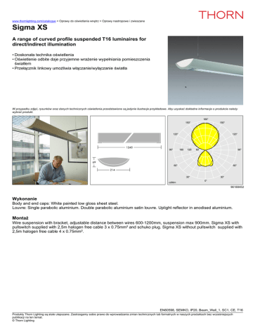 www.thornlighting.com/catalogue > Oprawy do oświetlania wnętrz > Oprawy nastropowe i zwieszane Sigma XS A range of curved profile suspended T16 luminaires for direct/indirect illumination • Doskonała technika oświetlenia • Oświetlenie odbite daje przyjemne wrażenie wypełniania pomieszczenia światłem • Przełącznik linkowy umożliwia włączanie/wyłączanie światła W przypadku zdjęć, rysunków oraz danych technicznych oświetlenia przedstawione są jedynie ilustracje przykładowe. Aby uzyskać dokładne informacje o produkcie należy wybrać produkt. 180° 150° 150° 120° 90° 120° 180 120 60 90° 60° 60° 30° cd/klm 30° 0° 96188452 Wykonanie Body and end caps: White painted low gloss sheet steel. Louvre: Single parabolic aluminium. Double parabolic aluminium satin louvre. Uplight reflector in anodised aluminium. Montaż Wire suspension with bracket, adjustable distance between wires 600-1200mm, suspension max 900mm. Sigma XS with pullswitch supplied with 2,5m halogen free cable 3 x 0.75mm² and schuko plug. Sigma XS without pullswitch supplied with 2,5m halogen free cable 4 x 0.75mm². EN60598, SEMKO, IP20, Beam_Wall_1, SC1, CE, T16 Produkty Thorn Lighting są stale ulepszane. Zastrzegamy sobie prawo do wprowadzania zmian technicznych lub formalnych w naszych produktach bez wcześniejszych publikacji na ten temat. © Thorn Lighting www.thornlighting.com/catalogue > Oprawy do oświetlania wnętrz > Oprawy nastropowe i zwieszane Sigma XS Opis typów Supplied complete with lamps, uplight reflectors, suspension kit and connecting cable. Opis Kod ILCOS Trzonek Waga (kg) Kod SAP SIGMAPAK 3X28W DSB L830 FDH G5 4,8 96188452 SIGMAPAK 3X28W DSB 2SW FDH G5 4,8 96188455 SIGMAPAK 3X35W DSB 2SW FDH G5 5,3 96189083 SIGMAPAK 3X28W HF/HFI SW/SWD DSB FDH G5 4,9 96209811 SIGMAPAK 3X28W PSB 2SW FDH G5 4,8 96188453 SIGMAPAK 3X28W PSB FDH G5 4,8 96010300 SIGMAPAK 3X28W PSB SW FDH G5 4,8 96188473 SIGMAPAK 3X28W HFI SWD PSB FDH G5 4,9 96209814 0,005 96188478 Sigma XS, raster podwójny, Satinbrite Sigma XS, raster paraboliczny, Satinbrite Sigma XS Attachments SIGMAPAK DUST COVER 28W/54W CL AC Produkty Thorn Lighting są stale ulepszane. Zastrzegamy sobie prawo do wprowadzania zmian technicznych lub formalnych w naszych produktach bez wcześniejszych publikacji na ten temat. © Thorn Lighting