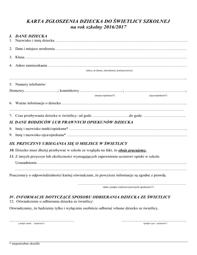 KARTA ZGŁOSZENIA DZIECKA DO ŚWIETLICY SZKOLNEJ na rok szkolny 2016/2017 I. DANE DZIECKA 1. Nazwisko i imię dziecka ………………………………………………………………………………………. 2. Data i miejsce urodzenia………………………………………………………………………………………. 3. Klasa…………………………………………………………………………………………………………… 4. Adres zamieszkania …………………………………………………………………………………………… (ulica, nr domu, mieszkania, kod pocztowy) ……………………………………………………………………………………………………………………... 5. Numery telefonów: Domowy……………………..; komórkowy …………………………...; ……………………………………….; (mamy/opiekuna*) (ojca/opiekuna*) 6. Ważne informacje o dziecku ………………………………………………………………………………….. …………………………………………………………………………………………………………………… 7. Czas przebywania dziecka w świetlicy: od godz. ………………………do godz. ………………………….. II. DANE RODZICÓW LUB PRAWNYCH OPIEKUNÓW DZIECKA 8. Imię i nazwisko matki/opiekuna* ……………………………………………………………………………... 9. Imię i nazwisko ojca/opiekuna* ………………………………………………………………………………. III. PRZYCZYNY UBIEGANIA SIĘ O MIEJSCE W ŚWIETLICY 10. Dziecko musi dłużej przebywać w szkole ze względu na fakt, że oboje pracujemy. 11. Z innych przyczyn lub okoliczności wymagających zapewnienia uczniowi opieki w szkole. Uzasadnienie…………………………………………………………………………………………………... .………………………………………………………………………………………………………………… Pouczona/y o odpowiedzialności karnej oświadczam, że powyższe informacje są zgodne z prawdą ………………………………………………………………………. (data i podpis rodziców/prawnych opiekunów*) IV. INFORMACJE DOTYCZĄCE SPOSOBU ODBIERANIA DZIECKA ZE ŚWIETLICY 12. Oświadczenie o odbieraniu dziecka ze świetlicy: Oświadczamy, że będziemy tylko i wyłącznie osobiście odbierać własne dziecko ze świetlicy. …………………………………… ( podpis matki / opiekuna*) * niepotrzebne skreślić …………………………………… (podpis ojca / opiekuna*) 13. Oświadczenie o samodzielnym opuszczeniu świetlicy: Oświadczamy, że wyrażamy zgodę na samodzielne opuszczenie przez nasze Dziecko świetlicy szkolnej o godz…………………. i ponosimy za nie pełną odpowiedzialność. ……………………………………… ……………………………………… (podpis matki / opiekuna* ) (podpis ojca / opiekuna*) 14. Osoby upoważnione przez rodziców do odbioru dziecka ze świetlicy: (Wypełniają rodzice, którzy nie złożyli oświadczenia w pkt. 12 i 13 Upoważnić można tylko osobę pełnoletnią) ……………………………………………………………………………………………………. ( imię i nazwisko oraz nr dowodu osobistego) ……………………………………………………………………………………………………. ( imię i nazwisko oraz nr dowodu osobistego) ……………………………………………………………………………………………………. ( imię i nazwisko oraz nr dowodu osobistego) ……………………………………………………………………………………………………. ( imię i nazwisko oraz nr dowodu osobistego) ……………………………………………………………………………………………………. Bierzemy na siebie pełną odpowiedzialność prawną za bezpieczeństwo odebranego dziecka od momentu jego odbioru przez wskazaną powyżej upoważnioną przez nas osobę. (Jednorazowe upoważnienia czy zezwolenia należy przekazywać w formie pisemnej) V. FORMY POMOCY 16. Prosimy podać, jaką kwotę mogą Państwo wpłacać co miesiąc na bieżące potrzeby świetlicy ……………………………………………. (Wpłaty na konto świetlicy są dobrowolne) 17. Inne formy pomocy na rzecz świetlicy…………………………………………………… ……………………………………………………………………………………………………. Oświadczam, iż wyrażam zgodę na zbieranie i przetwarzanie danych osobowych moich i mojego dziecka uczęszczającego do Szkoły Podstawowej nr 215 w Warszawie przy ul. Kwatery Głównej 13 w zakresie dydaktyczno – wychowawczo – opiekuńczej działalności szkoły zgodnie z ustawą z dnia 29 sierpnia 1997r. o ochronie danych osobowych. Mamy świadomość, iż świetlica szkolna odpowiada za bezpieczeństwo dziecka w godzinach 00 00 swojej pracy czyli od godziny 7 do godziny 18 Warszawa, dn ………………………. ……………………………………………… (podpisy rodziców / prawnych opiekunów*)