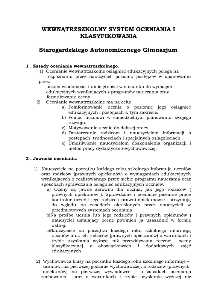 WEWNĄTRZSZKOLNY SYSTEM OCENIANIA I KLASYFIKOWANIA Starogardzkiego Autonomicznego Gimnazjum 1 . Zasady oceniania wewnątrzszkolnego. 1) Ocenianie wewnątrzszkolne osiągnięć edukacyjnych polega na rozpoznaniu przez nauczycieli poziomu postępów w opanowaniu przez ucznia wiadomości i umiejętności w stosunku do wymagań edukacyjnych wynikających z programów nauczania oraz formułowaniu oceny. 2) Ocenianie wewnątrzszkolne ma na celu: a) Poinformowanie ucznia o poziomie jego osiągnięć edukacyjnych i postępach w tym zakresie. b) Pomoc uczniowi w samodzielnym planowaniu swojego rozwoju. c) Motywowanie ucznia do dalszej pracy. d) Dostarczanie rodzicom i nauczycielom informacji o postępach, trudnościach i specjalnych osiągnięciach. e) Umożliwienie nauczycielom doskonalenia organizacji i metod pracy dydaktyczno-wychowawczej. 2 . Jawność oceniania. 1) Nauczyciele na początku każdego roku szkolnego informują uczniów oraz rodziców (prawnych opiekunów) o wymaganiach edukacyjnych wynikających z realizowanego przez siebie programu nauczania oraz sposobach sprawdzania osiągnięć edukacyjnych uczniów. a) Oceny są jawne zarówno dla ucznia, jak jego rodziców ( prawnych opiekunów ). Sprawdzone i ocenione pisemne prace kontrolne uczeń i jego rodzice ( prawni opiekunowie ) otrzymują do wglądu na zasadach określonych przez nauczycieli w przedmiotowych systemach oceniania. b)Na prośbę ucznia lub jego rodziców ( prawnych opiekunów ) nauczyciel ustalający ocenę powinien ją uzasadnić w formie ustnej. c)Nauczyciele na początku każdego roku szkolnego informują uczniów oraz ich rodziców (prawnych opiekunów) o warunkach i trybie uzyskania wyższej niż przewidywana rocznej oceny klasyfikacyjnej z obowiązkowych i dodatkowych zajęć edukacyjnych. 2) Wychowawca klasy na początku każdego roku szkolnego informuje – uczniów, na pierwszej godzinie wychowawczej, a rodziców (prawnych opiekunów) na pierwszej wywiadówce – o zasadach oceniania zachowania oraz o warunkach i trybie uzyskania wyższej niż przewidywana rocznej oceny klasyfikacyjnej zachowania oraz skutkach ustalenia uczniowi nagannej rocznej oceny klasyfikacyjnej zachowania. Należy w dzienniku lekcyjnym odnotować powyższa informację. 3 . Dostosowanie wymagań. 1) Nauczyciel jest zobowiązany, na podstawie pisemnej opinii lub orzeczenia poradni psychologiczno-pedagogicznej lub innej poradni specjalistycznej, dostosować wymagania edukacyjne, w stosunku do ucznia, u którego stwierdzono trudności w uczeniu się lub deficyty rozwojowe, uniemożliwiające sprostanie wymaganiom edukacyjnym wynikającym z programu nauczania. 2) Przy ustaleniu ocen z wychowania fizycznego należy w szczególności brać pod uwagę wysiłek wkładany przez ucznia w wywiązywanie się z obowiązków wynikających ze specyfiki tych zajęć. 3) W uzasadnionych przypadkach uczeń może być zwolniony na czas określony z zajęć wychowania fizycznego, informatyki, lub drugiego języka obcego. a) Decyzję o zwolnieniu ucznia podejmuje dyrektor szkoły na podstawie opinii o ograniczonych możliwościach uczestnictwa w tych zajęciach, wydanej przez lekarza, na czas określony w tej opinii. b) W przypadku zwolnienia ucznia z zajęć w dokumentacji przebiegu nauczania zamiast oceny klasyfikacyjnej wpisuje się „zwolniony”. 4 . Tryb oceniania i skala ocen. 1) Nauczyciele każdego przedmiotu na początku każdego roku szkolnego tworząc przedmiotowy system oceniania zobowiązani są do: a) Sformułowania wymagań edukacyjnych wynikających z realizowanego przez siebie programu. b) Opracowania szczegółowych kryteriów oceniania z podaniem sposobu i form sprawdzania wiadomości i umiejętności. c) Poinformowania uczniów o przyjętych zamierzeniach. Ww. wymagania i kryteria zostają wpisanie na pierwszej lekcji w roku szkolnym do zeszytu uczniowskiego; rodzice (prawni opiekunowie) potwierdzają w formie podpisu pod wpisem w zeszycie przyjęcie ich do wiadomości. d) Fakt zaznajomienia uczniów i rodziców o obowiązujących wymaganiach i kryteriach ocen nauczyciel odnotowuje w dzienniku lekcyjnym przy zapisie pierwszej lekcji. 2) W ciągu semestru nauczyciel zobowiązany systematycznego oceniania postępów ucznia. jest do bieżącego, 3) Oceny klasyfikacyjne śródroczna i roczna nie są średnią arytmetyczną ocen bieżących. Przy ocenie klasyfikacyjnej rocznej uwzględnia się osiągnięcia ucznia z pierwszego semestru. 4)Wystawione oceny, zarówno bieżące jak i klasyfikacyjne śródroczne i roczne, muszą wyrażać się stopniem wg. następującej skali : celujący - 6 bardzo dobry - 5 dobry - 4 dostateczny - 3 dopuszczający - 2 niedostateczny – 1 5) Punkty uzyskane przez ucznia z prac pisemnych przelicza się na oceny szkolne wg. skali procentowej, którą ustalają nauczyciele przedmiotowi. Ramowym przelicznikiem jest: 0-29% - niedostateczny 30-49% - dopuszczający 50-74% - dostateczny 75-84% - dobry 85-94% - bardzo dobry 95-100% - celujący W zależności od specyfiki przedmiotu, predyspozycji uczniów czy trudności pracy pisemnej, nauczyciel ma możliwość zmiany (podniesienia, obniżenia ) progów punktowych. Oceny bieżące mogą być oznaczone znakiem (+) - plus lub znakiem (-) minus . 6) Ocenę a)celującą otrzymuje uczeń, który biegle posługuje się zdobytymi wiadomościami w rozwiązywaniu problemów teoretycznych lub praktycznych z programu nauczania danej klasy, proponuje rozwiązania nietypowe, samodzielnie i twórczo rozwija własne uzdolnienia . c) bardzo dobrą otrzymuje uczeń, który opanował zakres wiedzy i umiejętności określony programem nauczania przedmiotu w danej klasie, sprawnie posługuje się zdobytymi wiadomościami, rozwiązuje samodzielnie problemy teoretyczne i praktyczne ujęte programem nauczania, potrafi zastosować poznana wiedzę do rozwiązywania zadań i problemów w nowych sytuacjach, d) dobrą otrzymuje uczeń, który opanował wiadomości i umiejętności w zakresie 