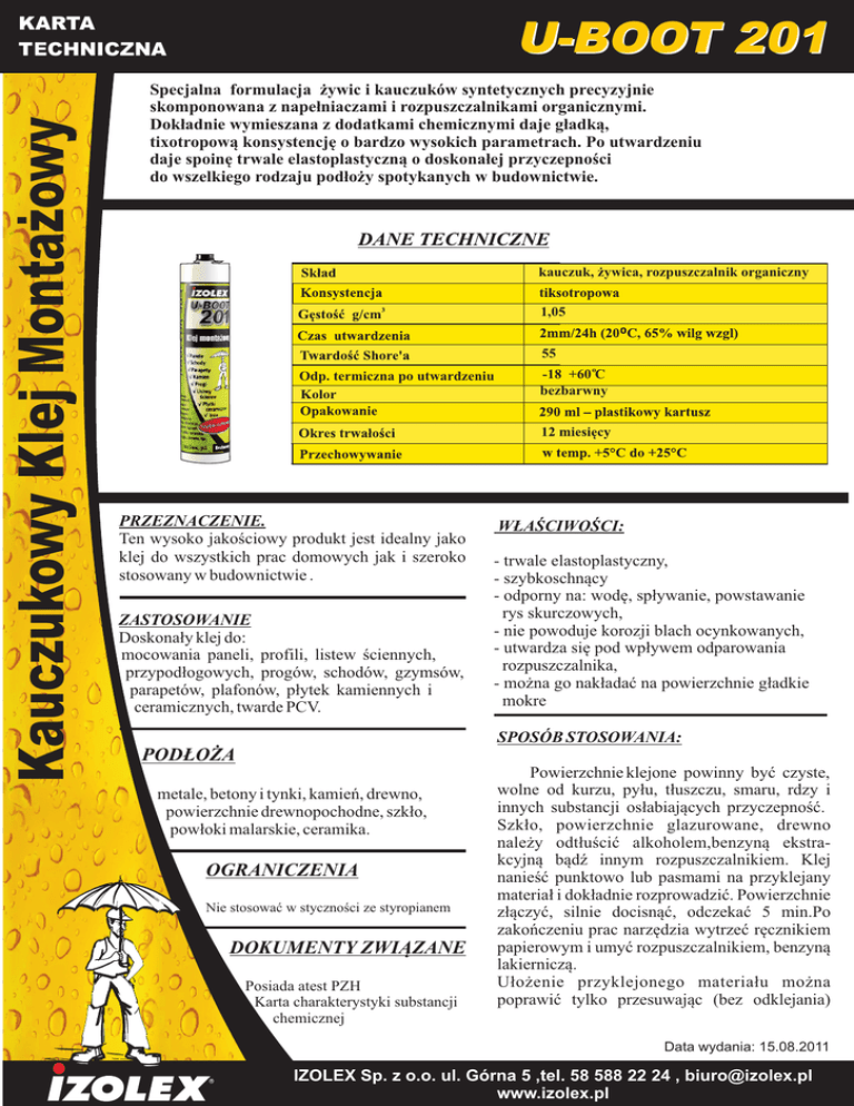 Kauczukowy Klej Monta¿owy KARTA TECHNICZNA U-BOOT 201 Specjalna formulacja ¿ywic i kauczuków syntetycznych precyzyjnie skomponowana z nape³niaczami i rozpuszczalnikami organicznymi. Dok³adnie wymieszana z dodatkami chemicznymi daje g³adk¹, tixotropow¹ konsystencjê o bardzo wysokich parametrach. Po utwardzeniu daje spoinê trwale elastoplastyczn¹ o doskona³ej przyczepnoœci do wszelkiego rodzaju pod³o¿y spotykanych w budownictwie. kauczuk, ¿ywica, rozpuszczalnik organiczny 1,05 55 Odp. termiczna po utwardzeniu PRZEZNACZENIE. Ten wysoko jakoœciowy produkt jest idealny jako klej do wszystkich prac domowych jak i szeroko stosowany w budownictwie . ZASTOSOWANIE Doskona³y klej do: mocowania paneli, profili, listew œciennych, przypod³ogowych, progów, schodów, gzymsów, parapetów, plafonów, p³ytek kamiennych i ceramicznych, twarde PCV. 0 -18 +60 C bezbarwny W£AŒCIWOŒCI: - trwale elastoplastyczny, - szybkoschn¹cy - odporny na: wodê, sp³ywanie, powstawanie rys skurczowych, - nie powoduje korozji blach ocynkowanych, - utwardza siê pod wp³ywem odparowania rozpuszczalnika, - mo¿na go nak³adaæ na powierzchnie g³adkie mokre SPOSÓB STOSOWANIA: POD£O¯A metale, betony i tynki, kamieñ, drewno, powierzchnie drewnopochodne, szk³o, pow³oki malarskie, ceramika. OGRANICZENIA Nie stosowaæ w stycznoœci ze styropianem DOKUMENTY ZWI¥ZANE - Posiada atest PZH Karta charakterystyki substancji chemicznej Powierzchnie klejone powinny byæ czyste, wolne od kurzu, py³u, t³uszczu, smaru, rdzy i innych substancji os³abiaj¹cych przyczepnoœæ. Szk³o, powierzchnie glazurowane, drewno nale¿y odt³uœciæ alkoholem,benzyn¹ ekstrakcyjn¹ b¹dŸ innym rozpuszczalnikiem. Klej nanieœæ punktowo lub pasmami na przyklejany materia³ i dok³adnie rozprowadziæ. Powierzchnie z³¹czyæ, silnie docisn¹æ, odczekaæ 5 min.Po zakoñczeniu prac narzêdzia wytrzeæ rêcznikiem papierowym i umyæ rozpuszczalnikiem, benzyn¹ lakiernicz¹. U³o¿enie przyklejonego materia³u mo¿na poprawiæ tylko przesuwaj¹c (bez odklejania) Data wydania: 15.08.2011 IZOLEX Sp. z o.o. ul. Górna 5 ,tel. 58 588 22 24 , [email protected] www.izolex.pl