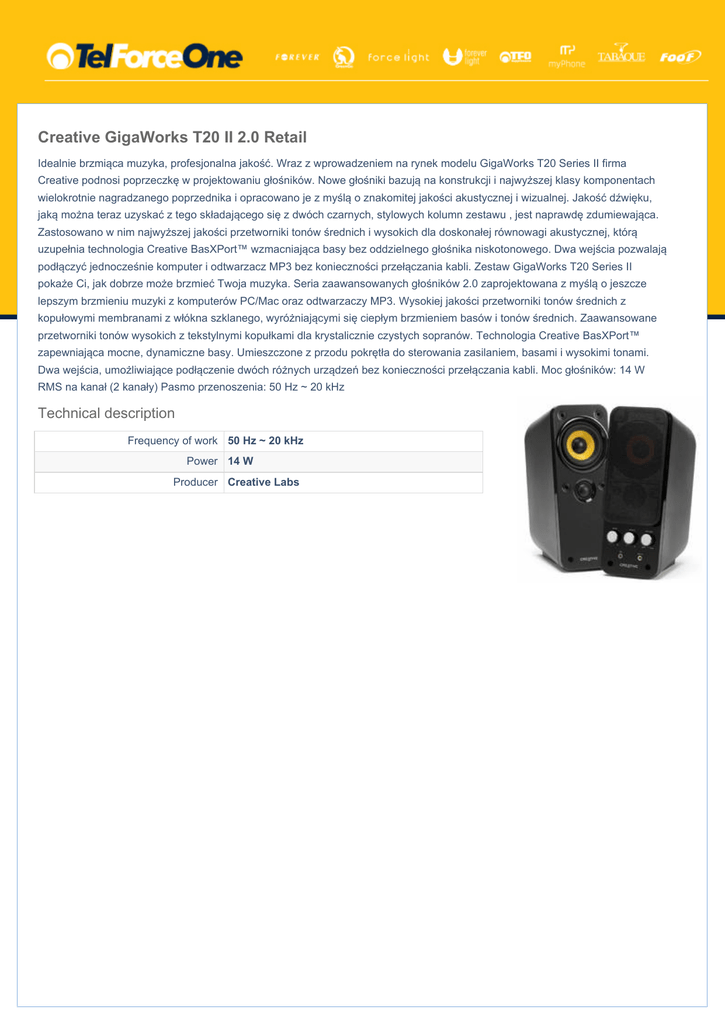 Creative GigaWorks T20 II 2.0 Retail Idealnie brzmiąca muzyka, profesjonalna jakość. Wraz z wprowadzeniem na rynek modelu GigaWorks T20 Series II firma Creative podnosi poprzeczkę w projektowaniu głośników. Nowe głośniki bazują na konstrukcji i najwyższej klasy komponentach wielokrotnie nagradzanego poprzednika i opracowano je z myślą o znakomitej jakości akustycznej i wizualnej. Jakość dźwięku, jaką można teraz uzyskać z tego składającego się z dwóch czarnych, stylowych kolumn zestawu , jest naprawdę zdumiewająca. Zastosowano w nim najwyższej jakości przetworniki tonów średnich i wysokich dla doskonałej równowagi akustycznej, którą uzupełnia technologia Creative BasXPort™ wzmacniająca basy bez oddzielnego głośnika niskotonowego. Dwa wejścia pozwalają podłączyć jednocześnie komputer i odtwarzacz MP3 bez konieczności przełączania kabli. Zestaw GigaWorks T20 Series II pokaże Ci, jak dobrze może brzmieć Twoja muzyka. Seria zaawansowanych głośników 2.0 zaprojektowana z myślą o jeszcze lepszym brzmieniu muzyki z komputerów PC/Mac oraz odtwarzaczy MP3. Wysokiej jakości przetworniki tonów średnich z kopułowymi membranami z włókna szklanego, wyróżniającymi się ciepłym brzmieniem basów i tonów średnich. Zaawansowane przetworniki tonów wysokich z tekstylnymi kopułkami dla krystalicznie czystych sopranów. Technologia Creative BasXPort™ zapewniająca mocne, dynamiczne basy. Umieszczone z przodu pokrętła do sterowania zasilaniem, basami i wysokimi tonami. Dwa wejścia, umożliwiające podłączenie dwóch różnych urządzeń bez konieczności przełączania kabli. Moc głośników: 14 W RMS na kanał (2 kanały) Pasmo przenoszenia: 50 Hz ~ 20 kHz Technical description Frequency of work 50 Hz ~ 20 kHz Power 14 W Producer Creative Labs