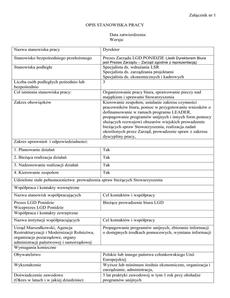 Załącznik nr 1 OPIS STANOWISKA PRACY Data zatwierdzenia: Wersja: Nazwa stanowiska pracy Dyrektor Stanowisko bezpośredniego przełożonego Prezes Zarządu LGD PONIDZIE (Jeśli Dyrektorem Biura jest Prezes Zarządu – Zarząd zgodnie z reprezentacją) Stanowiska podległe Liczba osób podległych pośrednio lub bezpośrednio Cel istnienia stanowiska pracy: Zakres obowiązków Specjalista ds. wdrażania LSR Specjalista ds. zarządzania projektami Specjalista ds. ekonomicznych i kadrowych 3 Organizowanie pracy biura, sprawowanie pieczy nad majątkiem i sprawami Stowarzyszenia Kierowanie zespołem, ustalanie zakresu czynności pracowników biura, pomoc w przygotowaniu wniosków o dofinansowanie w ramach programu LEADER, propagowanie programów unijnych i innych form pomocy służących rozwojowi obszarów wiejskich prowadzenie bieżących spraw Stowarzyszenia, realizacja zadań określonych przez Zarząd, prowadzenie spraw z zakresu dyscypliny pracy, Zakres uprawnień i odpowiedzialności: 1. Planowanie działań Tak 2. Bieżąca realizacja działań Tak 3. Nadzorowanie realizacji działań Tak 4. Kierowanie zespołem Tak Udzielone stałe pełnomocnictwa: prowadzenia spraw bieżących Stowarzyszenia Współpraca i kontakty wewnętrzne Nazwa stanowisk współpracujących Cel kontaktów i współpracy Prezes LGD Ponidzie Wiceprezes LGD Ponidzie Współpraca i kontakty zewnętrzne Bieżące prowadzenie biura LGD Nazwa instytucji współpracujących Cel kontaktów i współpracy Urząd Marszałkowski, Agencja Restrukturyzacji i Modernizacji Rolnictwa, organizacje pozarządowe, organy administracji państwowej i samorządowej Wymagania konieczne Propagowanie programów unijnych, zbieranie informacji o dostępnych środkach pomocowych, wymiana informacji Obywatelstwo Polskie lub innego państwa członkowskiego Unii Europejskiej Wyższe lub minimum średnie ekonomiczne, organizacja i zarządzanie, administracja, 5 lat praktyki zawodowej w tym 1 rok przy obsłudze programów unijnych Wykształcenie Doświadczenie zawodowe (Okres w latach i w jakiej dziedzinie) Znajomość obsługi komputera Edytor tekstu, arkusz kalkulacyjny niekaralność stan zdrowia pozwalający na zatrudnienie na stanowisku kierowniczym Wymagania pożądane Znajomość przepisów Predyspozycje osobowościowe Doświadczenie Kodeksu Postępowania Administracyjnego, ustawy Prawo o Stowarzyszeniach, Ustaw i rozporządzeń w zakresie działania „wsparcie dla rozwoju lokalnego w ramach inicjatywy LEADER” asertywność , łatwość podejmowania decyzji, łatwość nawiązywania kontaktów, wysoka kultura osobista, dokładność, terminowość, komunikatywność doświadczenie w pozyskiwaniu funduszy, Kursy i szkolenia niezbędne na stanowisku, certyfikaty Dodatkowe kompetencje kursy i szkolenia w zakresie funduszy unijnych Znajomość języków obcych j. niemiecki, francuski lub angielski Inne umiejętności Umiejętność logicznego myślenia, umiejętność kierowania zespołem ludzkim, Wymiar czasu pracy: system pracy - 8 godzinny, jednozmianowy Powierzony sprzęt 1. Zestaw komputerowy z oprogramowaniem: pakiet biurowy MS Office ………………………………….. data i podpis pracownika ………………………………….. data i podpis przełożonego