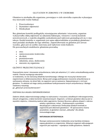 GLUTATION W ZDROWIU I W CHOROBIE Glutation to niezbędna dla organizmu, powstająca w ciele niewielka cząsteczka wykazująca trzy niezwykle ważne funkcje: 1. Przeciwutleniacz 2. Stymulator odporności 3. Detoksykant Bez glutationu komórki podlegałyby nieustającemu utlenianiu i niszczeniu, organizm wykazywałby słabą odporność na zakażenia bakteryjne, wirusowe i rozwój komórek nowotworowych, a wątroba ulegałaby uszkodzeniu pod wpływem gromadzących się w niej toksyn. Każda komórka w organizmie jest sama odpowiedzialna za produkcję glutationu i musi posiadać niezbędne do tego substraty. Zapotrzebowanie na glutation jest zawsze wysokie, gdyż jest on szybko zużywany pod wpływem wielu bodźców. Do powszechnych niedoborów glutationu prowadzą: stres zanieczyszczenie środowiska zła dieta promieniowanie zakażenia, urazy, skaleczenia starzenie się organizmu GŁÓWNY PRZECIWUTLENIACZ Powszechnie znane i stosowane antyutleniacze, takie jak witamina C, E i selen unieszkodliwiają wolne rodniki. Chociaż występują naturalnie w środowisku, to nie stanowią składnika komórkowego i dlatego też muszą byd dostarczane organizmowi w zbilansowanej diecie. Biorąc pod uwagę podstawowe znaczenie antyutleniaczy w zachowaniu zdrowia, nie dziwi fakt, że organizm sam je wytwarza. Najważniejszym z nich jest glutation. To właśnie od niego zależy prawidłowe funkcjonowanie innych antyutleniaczy i dlatego naukowcy nazywają go „głównym przeciwutleniaczem”. ODŻYWKA DLA UKŁADU ODPORNOŚCIOWEGO Zadanie układu odpornościowego polega na wykrywaniu i niszczeniu szkodliwych mikroorganizmów, obcych antygenów, a także komórek nowotworowych. Organizm, w którym glutation obecny jest w wysokim stężeniu, z łatwością zwalcza takie zagrożenia. Gustavo Bounous, główny ekspert z zakresu wiedzy o glutatione, mówi: „Podstawowym czynnikiem decydującym o aktywności limfocytów (białych krwinek) w organizmie jest obecnośd glutationu”. W uproszczeniu można powiedzied, że glutation stanowi „odżywkę” dla układu immunologicznego. NATURALNA DETOKSYKACJA Rosnące zanieczyszczenie środowiska coraz bardziej zmniejsza zapasy glutationu w organizmie. Głównym organem odtruwającym organizm jest wątroba – największe źródło glutationu. Badania pokazują, że niskie stężenie glutationu upośledza funkcjonowanie wątroby, a w rezultacie sprzyja kumulacji toksyn w organizmie oraz uszkadzaniu pojedynczych komórek i całych organów. Jako dowód należy przytoczyd, że w codziennej praktyce do odtruwania niektórych pacjentów, którzy przedawkowali np. paracetamol, lekarze stosują właśnie leki pobudzające produkcję glutationu. Glutation jest związkiem tiolowym, który odgrywa bardzo ważne funkcje w organizmach roślin i ssaków. W komórkach roślin jest substancją wykorzystywaną przede wszystkim w obronie organizmu. Dzięki obecności reaktywnej grupy –SH w cząsteczce łatwo reaguje z wolnymi rodnikami i pełni rolę antyutleniacza. Jest prekursorem fitochelatyn (PC), których biosynteza jest indukowana przez jony metali ciężkich, przedostające się do cytoplazmy. Toksyczność tych jonów zależy od stężenia w komórkach, objawia się zaburzeniami w funkcjonowaniu błon komórkowych oraz inaktywacją wielu enzymów zaangażowanych w regulację metabolizmu komórek, co prowadzi do redukcji wzrostu roślin. W komórkach zwierzęcych zredukowany glutation pełni kluczową rolę w przenoszeniu reszt acylowych w transporcie aminokwasów w nerkach. W kontakcie z tlenem z powietrza łatwo ulega utlenieniu do odpowiedniego disiarczku. Ponieważ w takiej formie jest fizjologicznie nieaktywny, musi być redukowany na drodze enzymatycznej, katalizowanej przez reduktazę glutationową w reakcji: GSSG + 2 H+ + 2 e- ↔ 2 GSH GSSG - glutation utleniony GSH - glutation zredukowany W krwinkach czerwonych zredukowany glutation (GSH) pełni rolę buforu hydrosulfidowego, w stężeniu ok. 5 mmol∙l-1, utrzymującego reszty cysteinowe hemoglobiny i innych białek w formie zredukowanej. GSH odgrywa ważną rolę w detoksyfikacji organizmu, reaguje z nadtlenkiem wodoru i nadtlenkami organicznymi. Komórki krwinek, które zawierają niedostateczną ilość tej formy, łatwo ulegają hemolizie. Stosunek ilości zredukowanej formy glutationu (GSH) do formy utlenionej (GSSG) wynosi zwykle 500. Źródło: http://www.immunocal.net.pl/