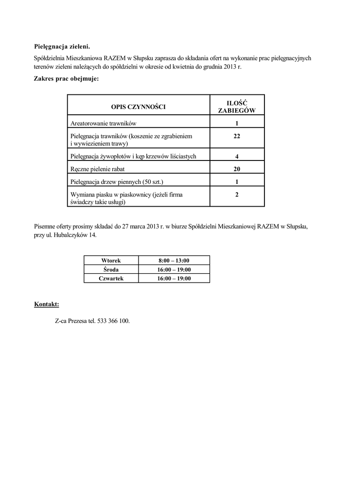 Pielęgnacja zieleni. Spółdzielnia Mieszkaniowa RAZEM w Słupsku zaprasza do składania ofert na wykonanie prac pielęgnacyjnych terenów zieleni należących do spółdzielni w okresie od kwietnia do grudnia 2013 r. Zakres prac obejmuje: OPIS CZYNNOŚCI ILOŚĆ ZABIEGÓW Areatorowanie trawników 1 Pielęgnacja trawników (koszenie ze zgrabieniem i wywiezieniem trawy) 22 Pielęgnacja żywopłotów i kęp krzewów liściastych 4 Ręczne pielenie rabat 20 Pielęgnacja drzew piennych (50 szt.) 1 Wymiana piasku w piaskownicy (jeżeli firma świadczy takie usługi) 2 Pisemne oferty prosimy składać do 27 marca 2013 r. w biurze Spółdzielni Mieszkaniowej RAZEM w Słupsku, przy ul. Hubalczyków 14. Wtorek Środa Czwartek Kontakt: Z-ca Prezesa tel. 533 366 100. 8:00 – 13:00 16:00 – 19:00 16:00 – 19:00