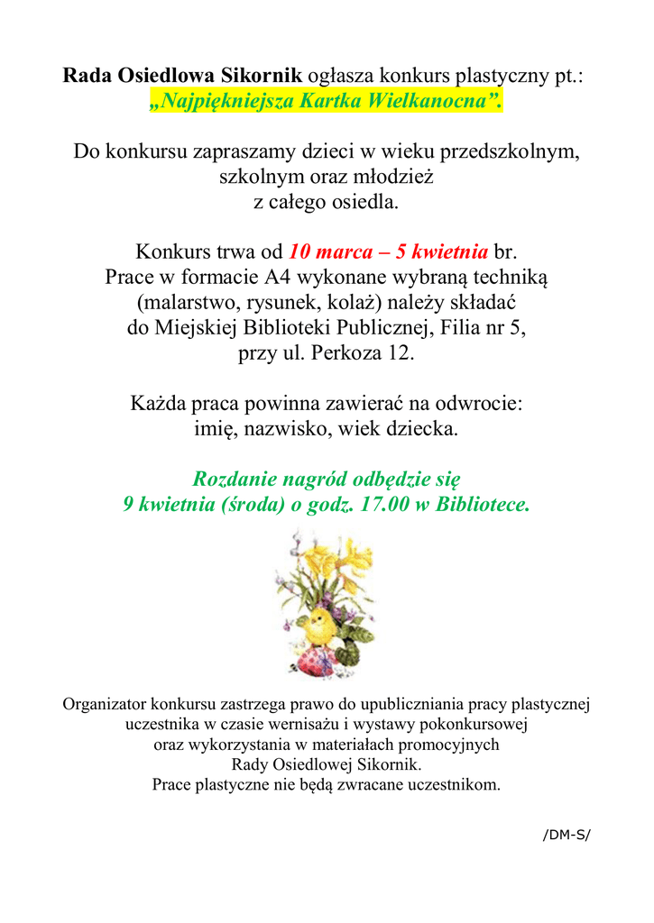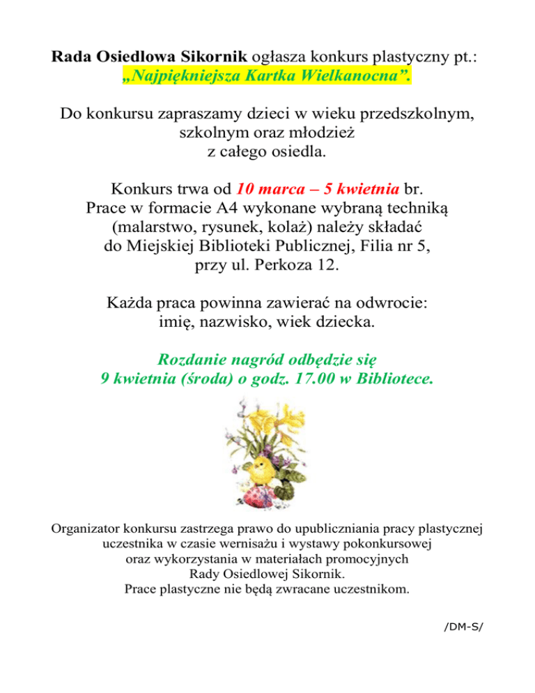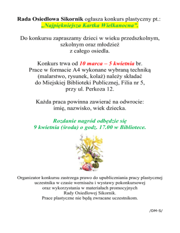 Rada Osiedlowa Sikornik ogłasza konkurs plastyczny pt.: „Najpiękniejsza Kartka Wielkanocna”. Do konkursu zapraszamy dzieci w wieku przedszkolnym, szkolnym oraz młodzież z całego osiedla. Konkurs trwa od 10 marca – 5 kwietnia br. Prace w formacie A4 wykonane wybraną techniką (malarstwo, rysunek, kolaż) należy składać do Miejskiej Biblioteki Publicznej, Filia nr 5, przy ul. Perkoza 12. Każda praca powinna zawierać na odwrocie: imię, nazwisko, wiek dziecka. Rozdanie nagród odbędzie się 9 kwietnia (środa) o godz. 17.00 w Bibliotece. Organizator konkursu zastrzega prawo do upubliczniania pracy plastycznej uczestnika w czasie wernisażu i wystawy pokonkursowej oraz wykorzystania w materiałach promocyjnych Rady Osiedlowej Sikornik. Prace plastyczne nie będą zwracane uczestnikom. /DM-S/