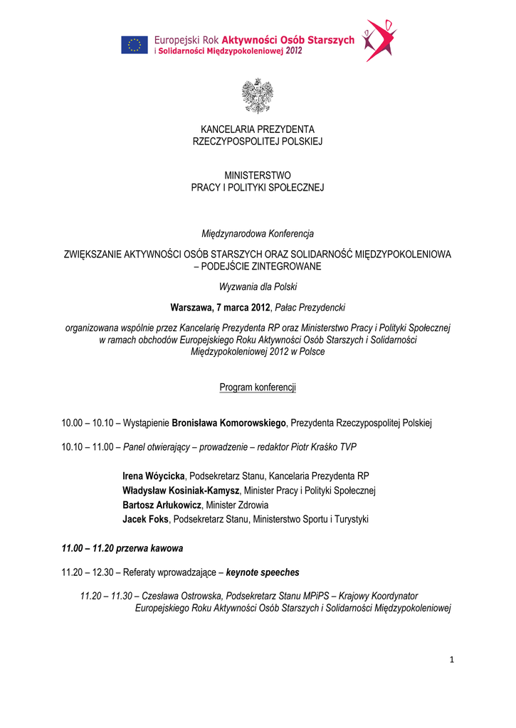 KANCELARIA PREZYDENTA RZECZYPOSPOLITEJ POLSKIEJ MINISTERSTWO PRACY I POLITYKI SPOŁECZNEJ Międzynarodowa Konferencja ZWIĘKSZANIE AKTYWNOŚCI OSÓB STARSZYCH ORAZ SOLIDARNOŚĆ MIĘDZYPOKOLENIOWA – PODEJŚCIE ZINTEGROWANE Wyzwania dla Polski Warszawa, 7 marca 2012, Pałac Prezydencki organizowana wspólnie przez Kancelarię Prezydenta RP oraz Ministerstwo Pracy i Polityki Społecznej w ramach obchodów Europejskiego Roku Aktywności Osób Starszych i Solidarności Międzypokoleniowej 2012 w Polsce Program konferencji 10.00 – 10.10 – Wystąpienie Bronisława Komorowskiego, Prezydenta Rzeczypospolitej Polskiej 10.10 – 11.00 – Panel otwierający – prowadzenie – redaktor Piotr Kraśko TVP Irena Wóycicka, Podsekretarz Stanu, Kancelaria Prezydenta RP Władysław Kosiniak-Kamysz, Minister Pracy i Polityki Społecznej Bartosz Arłukowicz, Minister Zdrowia Jacek Foks, Podsekretarz Stanu, Ministerstwo Sportu i Turystyki 11.00 – 11.20 przerwa kawowa 11.20 – 12.30 – Referaty wprowadzające – keynote speeches 11.20 – 11.30 – Czesława Ostrowska, Podsekretarz Stanu MPiPS – Krajowy Koordynator Europejskiego Roku Aktywności Osób Starszych i Solidarności Międzypokoleniowej 1 11.30 – 11.50 Europejski Rok 2012 – aktywne starzenie się - od teorii do praktyki - Lenia Samuel, doradca (Hors Classe Adviser), Dyrekcja Generalna Zatrudnienia, Spraw Społecznych i Włączenia Społecznego, Komisja Europejska 11.50 – 12.10 Zmiana demograficzna a krótkoterminowe i długoterminowe wyzwania dla rynku pracy - Anne Sonnet, ekonomista, Wydział ds. analiz i polityki zatrudnienia, Dyrekcja ds. Zatrudnienia i Spraw Społecznych, OECD 12.10 – 12.30 Aktywne starzenie poza pracą zarobkową – udział osób starszych w gospodarce oraz na rzecz społeczeństwa poza formalnym rynkiem pracy Eszter Zólyomi, analityk oraz koordynator projektu Mainstreaming Ageing: Indicators to Monitor Implementation oraz Katrin Gasior, analityk, Europejskie Centrum ds. polityki i badań nad sytuacją społeczną (afiliowane przy ONZ) 12.30 – 13.00 – Dyskusja 13.00 – 14.00 – lunch 14.00 – 15.45 – Równoległe panele tematyczne 1. Panel dyskusyjny: WYZWANIA DLA RYNKU PRACY – wprowadzenie i moderowanie panelu – prof. dr hab. Elżbieta Kryńska, Uniwersytet Łódzki Paneliści: dr Maciej Bukowski, Instytut Badań Strukturalnych dr Elwira Gross-Gołacka, Dyrektor Departamentu Analiz Ekonomicznych i Prognoz, MPiPS Adam Jasser, Podsekretarz Stanu, Kancelaria Prezesa Rady Ministrów Bogdan Grzybowski, OPZZ prof. dr hab. med. Danuta Koradecka, Centralny Instytut Ochrony Pracy Małgorzata Rusewicz, Dyrektor Departamentu Dialogu Społecznego i Stosunków Pracy, PKPP Lewiatan Tomasz Schimanek, Akademia Filantropii Dyskusja ok. 30 min 2. Panel dyskusyjny: WYZWANIA DLA SYSTEMU ZABEZPIECZENIA SPOŁECZNEGO – wprowadzenie i moderowanie panelu - prof. nadzw. dr Aleksandra Wiktorow, Rzecznik Ubezpieczonych Paneliści: Mieczysław Augustyn, Senator RP prof. SGH dr hab. Piotr Błędowski, Instytut Gospodarstwa Społecznego, Szkoła Główna Handlowa dr Agnieszka Chłoń-Domińczak, Instytut Badań Edukacyjnych, Szkoła Główna Handlowa dr Zofia Czepulis-Rutkowska, Instytut Pracy i Spraw Socjalnych Przedstawiciel MPiPS prof. dr hab. Tadeusz Szumlicz, Katedra Ubezpieczenia Społecznego, Szkoła Główna Handlowa 2 prof. UW dr hab. Gertruda Uścińska, Instytut Polityki Społecznej, Uniwersytet Warszawski Dyskusja ok. 30 min 3. Panel dyskusyjny: AKTYWNOŚĆ SPOŁECZNA - wprowadzenie i moderowanie panelu – dr Marek Rymsza, Instytut Stosowanych Nauk Społecznych, Uniwersytet Warszawski Paneliści: Michał Szczerba, Poseł na Sejm RP, Przewodniczący Parlamentarnego Zespołu ds. Uniwersytetów Trzeciego Wieku Krzysztof Więckiewicz, Dyrektor Departamentu Pożytku Publicznego, MPiPS prof. UW dr hab. Ewa Leś, Instytut Polityki Społecznej, Uniwersytet Warszawski, Instytut Studiów Politycznych PAN prof. UW, dr hab. Janusz Czapiński, Wydział Psychologii, Uniwersytet Warszawski Marek Szpunar, Prezes Zarządu Fundacja dla Uniwersytetu Jagiellońskiego dr Jolanta Perek-Białas, Szkoła Główna Handlowa, Uniwersytet Jagielloński dr Klaus Haberkern, Instytut Socjologii, Uniwersytet w Zurychu Dyskusja ok. 30 min 15.45 – 16.15 – Podsumowanie paneli z udziałem moderatorów – prowadzenie Czesława Ostrowska, Podsekretarz Stanu MPiPS – Krajowy Koordynator ER 2012 16.15 – 16.30 – Podsumowanie konferencji – Irena Wóycicka Podsekretarz Stanu, Kancelaria Prezydenta RP 3