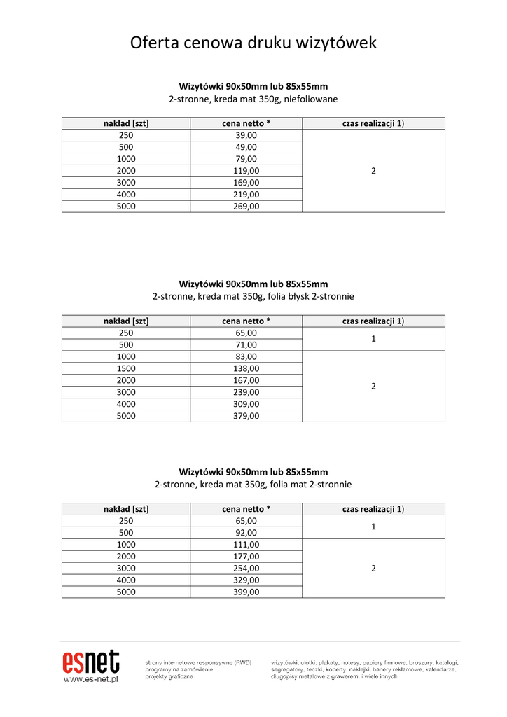 Oferta cenowa druku wizytówek Wizytówki 90x50mm lub 85x55mm 2-stronne, kreda mat 350g, niefoliowane nakład [szt] 250 500 1000 2000 3000 4000 5000 cena netto * 39,00 49,00 79,00 119,00 169,00 219,00 269,00 czas realizacji 1) 2 Wizytówki 90x50mm lub 85x55mm 2-stronne, kreda mat 350g, folia błysk 2-stronnie nakład [szt] 250 500 1000 1500 2000 3000 4000 5000 cena netto * 65,00 71,00 83,00 138,00 167,00 239,00 309,00 379,00 czas realizacji 1) 1 2 Wizytówki 90x50mm lub 85x55mm 2-stronne, kreda mat 350g, folia mat 2-stronnie nakład [szt] 250 500 1000 2000 3000 4000 5000 cena netto * 65,00 92,00 111,00 177,00 254,00 329,00 399,00 czas realizacji 1) 1 2 Wizytówki 90x50mm lub 85x55mm 2-stronne, kreda mat 350g, folia SOFT TOUCH 2-stronnie folia jest miła w dotyku nakład [szt] 250 500 1000 2000 3000 4000 5000 cena netto * 65,00 92,00 111,00 222,00 333,00 445,00 556,00 czas realizacji 1) 4 Wizytówki 90x50mm lub 85x55mm 2-stronne, kreda mat 350g, folia SOFT TOUCH 2-stronnie + lakier UV wybiórczo, 2-stronnie folia jest miła w dotyku, a błyszczącym lakierem można ładnie wyodrębnić niektóre elementy wizytówki (np.: logo, napisy, zdjęcie) nakład [szt] 250 500 1000 2000 3000 4000 5000 cena netto * 99,00 139,00 172,00 308,00 432,00 556,00 679,00 czas realizacji 1) 6 Wizytówki sztywniejsze – na kartonie Wizytówki 90x50mm lub 85x55mm 2-stronne, karton 300g, folia błysk 2-stronnie nakład [szt] 250 500 1000 2000 3000 4000 5000 cena netto * 74,00 80,00 98,00 149,00 209,00 269,00 329,00 czas realizacji 1) 1 4 Wizytówki 90x50mm lub 85x55mm 2-stronne, karton 300g, folia mat 2-stronnie nakład [szt] 250 500 1000 2000 3000 4000 5000 cena netto * 87,00 92,00 111,00 157,00 217,00 277,00 337,00 czas realizacji 1) 1 4 Możliwy jest również druk większej ilości wizytówek. * - do ceny należy doliczyć 23% VAT 1) Liczba dni roboczych przeznaczonych na realizację zamówienia. Przy zamówieniu i zaksięgowaniu wpłaty do godziny 10:00 danego dnia. Dzień zamówienia jest dniem zerowym. Np.: gdy czas realizacji wynosi 1 dzień, a zamówienie zostało skompletowane w poniedziałek do godziny 10:00. Wysyłka kurierem nastąpi we wtorek. Produkty wysyłane są bezpłatnie kurierem do dowolnego miejsca w Polsce. Projekty graficzne Koszt projektu graficznego wizytówki wyceniany jest indywidualnie, po określeniu wymagań i przesłaniu plików. ([email protected])