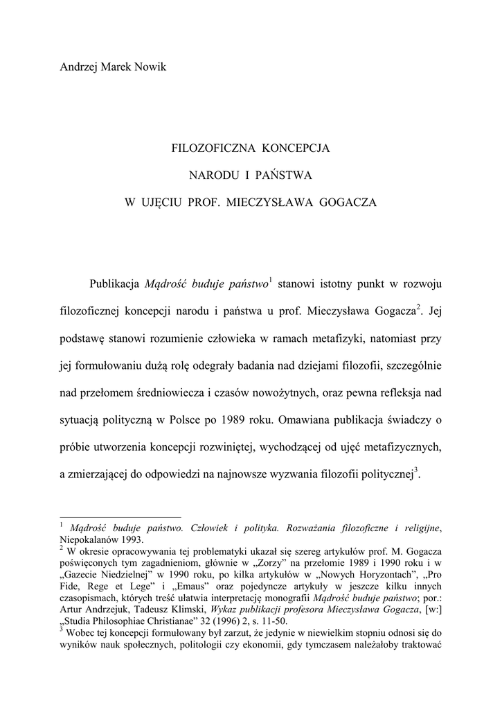 Andrzej Marek Nowik FILOZOFICZNA KONCEPCJA NARODU I PAŃSTWA W UJĘCIU PROF. MIECZYSŁAWA GOGACZA Publikacja Mądrość buduje państwo1 stanowi istotny punkt w rozwoju filozoficznej koncepcji narodu i państwa u prof. Mieczysława Gogacza 2. Jej podstawę stanowi rozumienie człowieka w ramach metafizyki, natomiast przy jej formułowaniu dużą rolę odegrały badania nad dziejami filozofii, szczególnie nad przełomem średniowiecza i czasów nowożytnych, oraz pewna refleksja nad sytuacją polityczną w Polsce po 1989 roku. Omawiana publikacja świadczy o próbie utworzenia koncepcji rozwiniętej, wychodzącej od ujęć metafizycznych, a zmierzającej do odpowiedzi na najnowsze wyzwania filozofii politycznej3. 1 Mądrość buduje państwo. Człowiek i polityka. Rozważania filozoficzne i religijne, Niepokalanów 1993. 2 W okresie opracowywania tej problematyki ukazał się szereg artykułów prof. M. Gogacza poświęconych tym zagadnieniom, głównie w „Zorzy” na przełomie 1989 i 1990 roku i w „Gazecie Niedzielnej” w 1990 roku, po kilka artykułów w „Nowych Horyzontach”, „Pro Fide, Rege et Lege” i „Emaus” oraz pojedyncze artykuły w jeszcze kilku innych czasopismach, których treść ułatwia interpretację monografii Mądrość buduje państwo; por.: Artur Andrzejuk, Tadeusz Klimski, Wykaz publikacji profesora Mieczysława Gogacza, [w:] „Studia Philosophiae Christianae” 32 (1996) 2, s. 11-50. 3 Wobec tej koncepcji formułowany był zarzut, że jedynie w niewielkim stopniu odnosi się do wyników nauk społecznych, politologii czy ekonomii, gdy tymczasem należałoby traktować 2 W aspekcie metafizycznym prof. Mieczysław Gogacz identyfikuje naród jako wspólnotę osób, które powiązane są głównie relacjami realnymi 4, a spośród tych relacji wyróżnia szczególnie relacje poznawcze i osobowe; relacje myślne jako wtórne mają rolę jedynie wspomagającą5. Naród obok rodziny należy do grupy wspólnot naturalnych6. Tym, co każdą wspólnotę w szczególny sposób jednoczy i konstytuuje, jest dobro wspólne tworzących ją osób, które może być realizowane właśnie przez tę wspólnotę. Z kolei państwo jest identyfikowane jako rodzaj instytucji, która ze względu na to, czym jest, rozpoznawana jest jako zespół relacji myślnych 7. Rozumienie bytu w ramach tomizmu egzystencjalnego odmawia państwu statusu bytu realnego i sprowadza jego strukturę do ujęć myślnych, wśród których zaliczone może być do zespołu relacji8. Spośród różnych wytworów człowieka ukonstytuowanych głównie przez relacje myślne państwo należy zaliczyć z kolei do instytucji. Takie ujęcie metafizyczne na samym początku rozważań ukazuje prymat człowieka jako osoby nad wszystkimi jego wytworami, w tym również nad to jako jej zaletę i skutek przestrzegania metodologicznej swoistości problematyki filozoficznej z jej uniwersalnym charakterem. 4 Charakterystyczne dla tej koncepcji jest odniesienie jej nie tyle do przypadłości, jak w większości ujęć klasycznych, ale do ludzkich relacji, których teorię prof. M. Gogacz rozwinął w ramach metafizyki; por.: M. Gogacz, Elementarz metafizyki, Warszawa 1987, s. 57-65. 5 M. Gogacz, Mądrość buduje państwo, s. 161. 6 Pojmowanie narodu jako wspólnoty osób, analogicznie jak rodziny, było stałym elementem nauczania Prymasa Tysiąclecia, a w problematyce filozoficznej poruszanej przez prof. M. Gogacza powiązane zostało z teorią osoby i relacji osobowych; por.: M. Gogacz, Człowiek i jego relacje (Materiały do filozofii człowieka), Warszawa 1985, s. 140-148, 169-170. 7 Koncepcja państwa jest konsekwencją rozumienia narodu jako wspólnoty osób. 8 M. Gogacz, Mądrość buduje państwo, s. 174-175. 3 instytucją państwa, i stanowi punkt wyjścia dla wszelkich ocen moralnych w zakresie filozofii politycznej. Ukazuje również prymat relacji realnych, które konstytuują wspólnoty, z jednej strony wspólnoty naturalne, którymi są rodzina i naród, z drugiej strony wspólnotę nadprzyrodzoną, którą jest Kościół, nad relacjami myślnymi, które budują państwo, i potrzebę dostosowywania struktur instytucjonalnych do zasad moralnych wynikających z natury człowieka9. Prymat narodu nad państwem w ujęciach metafizycznych i etycznych w szczególny sposób można zauważyć na przestrzeni dziejów Polski10, ponieważ w okresie zaborów istnieniu narodu jako realnej wspólnoty osób powiązanych relacjami, realizującej własne cele w ramach dobra wspólnego, nie towarzyszyła ochrona żadnego państwa, a jedynie instytucje państw zaborczych, których racja stanu była raczej ukierunkowana na zniszczenie niż na zachowanie polskiej wspólnoty narodowej11. Każdy wytwór człowieka, w tym również instytucja, ma wyznaczone cele, które konstytuują jej istotę jako bytu myślnego; w przypadku państwa cel ten jest określany jako racja stanu. Powyższe ujęcia instytucji państwa powodują ścisłe powiązanie racji stanu z dobrem osób; cele państwa jako instytucji wspomagającej relacje realne osób powinny być wyznaczone ich 9 Na podstawie rozstrzygnięć o charakterze metafizycznym w zakresie antropologii filozoficznej formułowane są zasady moralne, oparte na takim właśnie rozumieniu narodu i państwa, że dystansujące inne ujęcia; por.: M. Gogacz, Wprowadzenie do etyki chronienia osób, Warszawa 1998, s. 87-99. 10 M. Gogacz, Mądrość buduje państwo, s. 77. 11 W związku z tym można stwierdzić, że doświadczenie życia narodu w warunkach braku niepodległego państwa świadczy o braku tożsamości zasad konstytuujących naród oraz wtórnych w stosunku do nich zasad konstytuujących państwo. 4 dobrem indywidualnym i dobrem wspólnym, a wszelkie programy polityczne mogą jedynie odgrywać rolę służebną w ich realizacji12. Cele państwa można bliżej określić w ten sposób, że dotyczą życia codziennego człowieka w aspekcie wspólnotowym. Kluczową natomiast rol