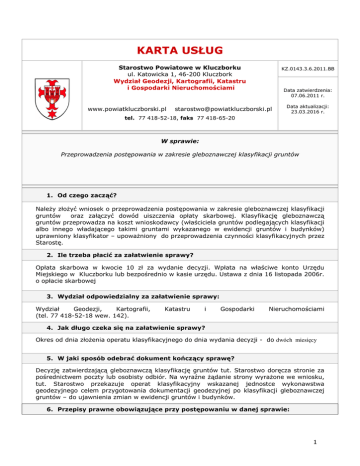 KARTA USŁUG Starostwo Powiatowe w Kluczborku ul. Katowicka 1, 46-200 Kluczbork Wydział Geodezji, Kartografii, Katastru i Gospodarki Nieruchomościami www.powiatkluczborski.pl KZ.0143.3.6.2011.BB Data zatwierdzenia: 07.06.2011 r. [email protected] Data aktualizacji: 23.03.2016 r. tel. 77 418-52-18, faks 77 418-65-20 W sprawie: Przeprowadzenia postępowania w zakresie gleboznawczej klasyfikacji gruntów 1. Od czego zacząć? Należy złożyć wniosek o przeprowadzenia postępowania w zakresie gleboznawczej klasyfikacji gruntów oraz załączyć dowód uiszczenia opłaty skarbowej. Klasyfikację gleboznawczą gruntów przeprowadza na koszt wnioskodawcy (właściciela gruntów podlegających klasyfikacji albo innego władającego takimi gruntami wykazanego w ewidencji gruntów i budynków) uprawniony klasyfikator – upoważniony do przeprowadzenia czynności klasyfikacyjnych przez Starostę. 2. Ile trzeba płacić za załatwienie sprawy? Opłata skarbowa w kwocie 10 zł za wydanie decyzji. Wpłata na właściwe konto Urzędu Miejskiego w Kluczborku lub bezpośrednio w kasie urzędu. Ustawa z dnia 16 listopada 2006r. o opłacie skarbowej 3. Wydział odpowiedzialny za załatwienie sprawy: Wydział Geodezji, Kartografii, (tel. 77 418-52-18 wew. 142). Katastru i Gospodarki Nieruchomościami 4. Jak długo czeka się na załatwienie sprawy? Okres od dnia złożenia operatu klasyfikacyjnego do dnia wydania decyzji - do dwóch miesięcy 5. W jaki sposób odebrać dokument kończący sprawę? Decyzję zatwierdzającą gleboznawczą klasyfikację gruntów tut. Starostwo doręcza stronie za pośrednictwem poczty lub osobisty odbiór. Na wyraźne żądanie strony wyrażone we wniosku, tut. Starostwo przekazuje operat klasyfikacyjny wskazanej jednostce wykonawstwa geodezyjnego celem przygotowania dokumentacji geodezyjnej po klasyfikacji gleboznawczej gruntów – do ujawnienia zmian w ewidencji gruntów i budynków. 6. Przepisy prawne obowiązujące przy postępowaniu w danej sprawie: 1 Ustawa z dnia 17 maja 1989r. – Prawo geodezyjne i kartograficzne oraz Rozporządzenie Rady Ministrów z dnia 12 września 2012r. w sprawie gleboznawczej klasyfikacji gruntów. 7. O czym wnioskodawca wiedzieć powinien? Decyzja ostateczna kończy sprawę w postępowaniu administracyjnym. Obowiązuje 14 – dniowy okres uprawomocnienia się decyzji (termin liczony jest od dnia otrzymania decyzji przez stronę – strony) 8. Co przysługuje wnioskodawcy? Odwołanie do Wojewódzkiego Inspektora Nadzoru Geodezyjnego i Kartograficznego w Opolu. 9. Wzór wniosku do pobrania: Brak wzoru wniosku DODATKOWE UWAGI: Brak uwag Godziny urzędowania Starostwa Powiatowego w Kluczborku: Poniedziałek godz. 8.00 – 16.00 Wtorek-Piątek godz. 7.00-15.00 Opracował: Beata Błaszczuk Zatwierdził: Rafał Gajek 2