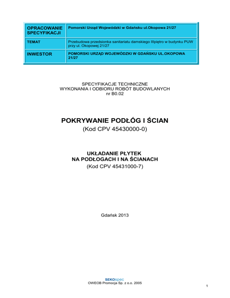 OPRACOWANIE SPECYFIKACJI Pomorski Urząd Wojewódzki w Gdańsku ul.Okopowa 21/27 TEMAT Przebudowa przedsionka sanitariatu damskiego IIIpiętro w budynku PUW przy ul. Okopowej 21/27 INWESTOR POMORSKI URZĄD WOJEWÓDZKI W GDAŃSKU UL.OKOPOWA 21/27 SPECYFIKACJE TECHNICZNE WYKONANIA I ODBIORU ROBÓT BUDOWLANYCH nr B0.02 POKRYWANIE PODŁÓG I ŚCIAN (Kod CPV 45430000-0) UKŁADANIE PŁYTEK NA PODŁOGACH I NA ŚCIANACH (Kod CPV 45431000-7) Gdańsk 2013 SEKOspec OWEOB Promocja Sp. z o.o. 2005 1 1. CZĘŚĆ OGÓLNA 1.1. Nazwa nadana zamówieniu przez zamawiającego Przebudowa przedsionka sanitariatu damskiego na III piętrze w budynku PUW Gdańsk ul. Okopowa 21/27 1.2. Przedmiot ST Przedmiotem niniejszej szczegółowejj specyfikacji technicznej (SST) są wymagania dotyczące wykonania i odbioru robót posadzkowych i okładzinowych z płytek przy użyciu kompozycji klejowych z mieszanek przygotowanych fabrycznie w budownictwie mieszkaniowym, użyteczności publicznej i budownictwie przemysłowym. 1.3. Zakres stosowania ST Szczegółowa specyfikacja techniczna (SST) stosowana jest jako dokument przetargowy i kontraktowy przy zlecaniu i realizacji robót wymienionych w pkt. 1.1. ..... Odstępstwa od wymagań podanych w niniejszej specyfikacji mogą mieć miejsce tylko w przypadkach prostych robót o niewielkim znaczeniu, dla których istnieje pewność, że podstawowe wymagania będą spełnione przy zastosowaniu metod wykonania wynikających z doświadczenia oraz uznanych reguł i zasad sztuki budowlanej oraz przy uwzględnieniu przepisów bhp. 1.4. Przedmiot i zakres robót objętych ST Roboty, których dotyczy specyfikacja, obejmują wszystkie czynności mające na celu wykonanie: – pokrycie podłóg płytkami (posadzki), które stanowią wierzchni element warstw podłogowych, – pokrycie ścian płytkami (okładziny), które stanowią warstwę ochronną i kształtującą formę architektoniczną okładanych elementów. Specyfikacja obejmuje wykonanie posadzek i okładzin przy użyciu kompozycji klejowych z mieszanek przygotowanych fabrycznie. Zakres opracowania obejmuje określenie wymagań odnośnie własności materiałów, wymagań i sposobów oceny podłoży, wykonanie posadzek i okładzin wewnętrznych i zewnętrznych z płytek, oraz ich odbiory. Specyfikacja nie obejmuje wykładzin i okładzin chemoodpornych oraz wykonywanych według metod opatentowanych lub innych zaprojektowanych indywidualnie dla konkretnego obiektu. 1.5. Określenia podstawowe, definicje Określenia podane w niniejszej Specyfikacji są zgodne z odpowiednimi normami oraz określeniami podanymi w ST „Wymagania ogólne” Kod CPV 45000000-7, pkt 1.4, a także podanymi poniżej: Podłoże – element budynku, na powierzchni którego wykonane będą roboty posadzkowe i okładzinowe z płytek. Warstwa wyrównawcza – warstwa wykonana w celu wyeliminowania nierówności lub różnic poziomów powierzchni podłoża. Warstwa wygładzająca – cienka warstwa wykonana dla uzyskania gładkiej powierzchni podłoża. Warstwa gruntująca – powłoka wzmacniająca i uszczelniająca podłoże oraz zwiększająca przyczepność powłoki ochronnej. Faseta – wyoblenie wykonane na połączeniu powierzchni poziomych i pionowych. 1.6. Ogólne wymagania dotyczące robót posadzkowych i okładzinowych Wykonawca robót jest odpowiedzialny za jakość ich wykonania oraz za zgodność z dokumentacją projektową, specyfikacjami technicznymi i poleceniami Inspektora nadzoru. SEKOspec OWEOB Promocja Sp. z o.o. 2005 2 Ogólne powszechnie stosowane wymagania dotyczące robót podano w OST „Wymagania ogólne” Kod CPV 45000000-7, pkt. 1.5. 1.7. Dokumentacja robót posadzkowych i okładzinowych Roboty posadzkowe i okładzinowe należy wykonać na podstawie dostarczonego przedmiaru i wizji lokalnej. Kolorystyka do uzgodnienia z Zamawiającym Dokumentacja wykonania robót posadzkowych i wykładzinowych powinna zawierać co najmniej następujące informacje i rozwiązania dotyczące: – materiałów do wykonywania posadzek i okładziny z płytek, – lokalizacji i warunków użytkowania, – rodzaju i stanu podłoży pod posadzki i okładziny. W projekcie powinny być zawarte: – wymagania dla podłoża, ewentualnie sposób jego wykonania lub naprawy, z wyszczególnieniem materiałów do napraw, – specyfikacje materiałów do wykonania posadzek i okładzin z powołaniem się na odpowiednie dokumenty odniesienia (normy, aprobaty techniczne), – sposoby wykonania posadzek i okładzin z płytek z uwzględnieniem szerokości spoin i sposobu wykończenia, – kolorystyka i wzornictwo układanych płytek, – wymagania i warunki odbioru wykonanej posadzki i okładziny, – zasady konserwacji posadzek i okładzin. 2. WYMAGANIA DOTYCZĄCE WŁAŚCIWOŚCI MATERIAŁÓW 2.1. Ogólne wymagania dotyczące właściwości materiałów, ich pozyskiwania i składowania podano w OST „Wymagania ogólne” Kod CPV 45000000-7, pkt 2 Wykonawca obowiązany jest posiadać na budowie pełną dokumentację dotyczącą składanych na budowie materiałów przeznaczonych do wykonania robót posadzkowych i okładzinowych. Atesty, aprobaty i inne dane na temat wbudowywanych materiałów, winny być okazane Inspektorowi przed wbudowaniem do akceptacji. 2.2. Rodzaje materiałów Wszystkie materiały do wykonania robót posadzkowych i okładzinowych z płytek powinny odpowiadać wymaganiom zawartym w dokumentach odniesienia (normach, aprobatach technicznych). 2.2.1.Płyty i płytki Płytki powinny odpowiadać następującej normie: – PN-EN 14411:2005 – Płytki i płyty ceramiczne – Definicja, klasyfikacja, charakterystyki i znakowanie. wymagania do plytek gresowych w węzłach sanitarnych - kolor do uzgodnienia z Inwestorem - wymiary 30x30 - klasa ścieralności 5 - klasa antypoślizgowości R10-11 na stopnie plytki z rowkami antypoślizgowymi - nasiąkliwość wodna % EŁ 0,5 -wytrzymalośc mna zginanie MPa min 35 - odporność na pęknięcia wloskowate -odporno