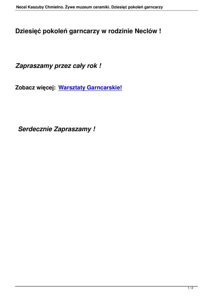 Necel Kaszuby Chmielno. Żywe muzeum ceramiki. Dziesięć pokoleń garncarzy Dziesięć pokoleń garncarzy w rodzinie Neclów ! Zapraszamy przez cały rok ! Zobacz więcej: Warsztaty Garncarskie! Serdecznie Zapraszamy ! 1/2 Necel Kaszuby Chmielno. Żywe muzeum ceramiki. Dziesięć pokoleń garncarzy Organizujemy zajęcia na naczynia kole garncarskim z2instruktorem, zarówno dla grup zorganizowanych, i osób indywidualnych. Każda ma możliwość stworzenia własnego naczynia na koleosoba garncarskim. Możliwość pozostawienia najak około tygodnie do wypalenia. Zobacz więcej: Warsztaty Garncarskie! O Muzeum Ceramiki Kaszubskiej w Chmielnie - archiwalna kronika PKF - Polska Kronika Filmowa: 2/2