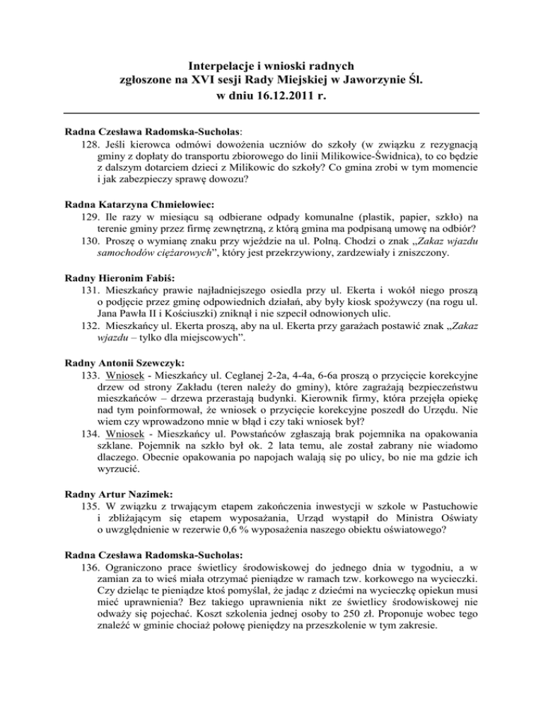 Interpelacje i wnioski radnych zgłoszone na XVI sesji Rady Miejskiej w Jaworzynie Śl. w dniu 16.12.2011 r. Radna Czesława Radomska-Sucholas: 128. Jeśli kierowca odmówi dowożenia uczniów do szkoły (w związku z rezygnacją gminy z dopłaty do transportu zbiorowego do linii Milikowice-Świdnica), to co będzie z dalszym dotarciem dzieci z Milikowic do szkoły? Co gmina zrobi w tym momencie i jak zabezpieczy sprawę dowozu? Radna Katarzyna Chmielowiec: 129. Ile razy w miesiącu są odbierane odpady komunalne (plastik, papier, szkło) na terenie gminy przez firmę zewnętrzną, z którą gmina ma podpisaną umowę na odbiór? 130. Proszę o wymianę znaku przy wjeździe na ul. Polną. Chodzi o znak „Zakaz wjazdu samochodów ciężarowych”, który jest przekrzywiony, zardzewiały i zniszczony. Radny Hieronim Fabiś: 131. Mieszkańcy prawie najładniejszego osiedla przy ul. Ekerta i wokół niego proszą o podjęcie przez gminę odpowiednich działań, aby były kiosk spożywczy (na rogu ul. Jana Pawła II i Kościuszki) zniknął i nie szpecił odnowionych ulic. 132. Mieszkańcy ul. Ekerta proszą, aby na ul. Ekerta przy garażach postawić znak „Zakaz wjazdu – tylko dla miejscowych”. Radny Antonii Szewczyk: 133. Wniosek - Mieszkańcy ul. Ceglanej 2-2a, 4-4a, 6-6a proszą o przycięcie korekcyjne drzew od strony Zakładu (teren należy do gminy), które zagrażają bezpieczeństwu mieszkańców – drzewa przerastają budynki. Kierownik firmy, która przejęła opiekę nad tym poinformował, że wniosek o przycięcie korekcyjne poszedł do Urzędu. Nie wiem czy wprowadzono mnie w błąd i czy taki wniosek był? 134. Wniosek - Mieszkańcy ul. Powstańców zgłaszają brak pojemnika na opakowania szklane. Pojemnik na szkło był ok. 2 lata temu, ale został zabrany nie wiadomo dlaczego. Obecnie opakowania po napojach walają się po ulicy, bo nie ma gdzie ich wyrzucić. Radny Artur Nazimek: 135. W związku z trwającym etapem zakończenia inwestycji w szkole w Pastuchowie i zbliżającym się etapem wyposażania, Urząd wystąpił do Ministra Oświaty o uwzględnienie w rezerwie 0,6 % wyposażenia naszego obiektu oświatowego? Radna Czesława Radomska-Sucholas: 136. Ograniczono prace świetlicy środowiskowej do jednego dnia w tygodniu, a w zamian za to wieś miała otrzymać pieniądze w ramach tzw. korkowego na wycieczki. Czy dzieląc te pieniądze ktoś pomyślał, że jadąc z dziećmi na wycieczkę opiekun musi mieć uprawnienia? Bez takiego uprawnienia nikt ze świetlicy środowiskowej nie odważy się pojechać. Koszt szkolenia jednej osoby to 250 zł. Proponuje wobec tego znaleźć w gminie chociaż połowę pieniędzy na przeszkolenie w tym zakresie. Radny Ireneusz Besser: 137. Wniosek – Dot. wycięcia wszystkich krzewów i krzaków na drodze gminnej do Nowic – chodzi o odcinek pomiędzy ogródkami działkowymi a Skansenem. Mieszkańcy spacerujący i uprawiający Nordic Walking, rowerzyści i mieszkańcy Nowic, zwracają uwagę, że w okresie letnim nie mogą się swobodnie poruszać, gdyż gałęzie i liście zarastają drogę. 138. Proszę o podanie szczegółowej informacji o wydatkach rzeczowych środków przyznanych na szkoły podstawowe, gimnazjum i przedszkole oraz stołówki szkolne w 2012 r.