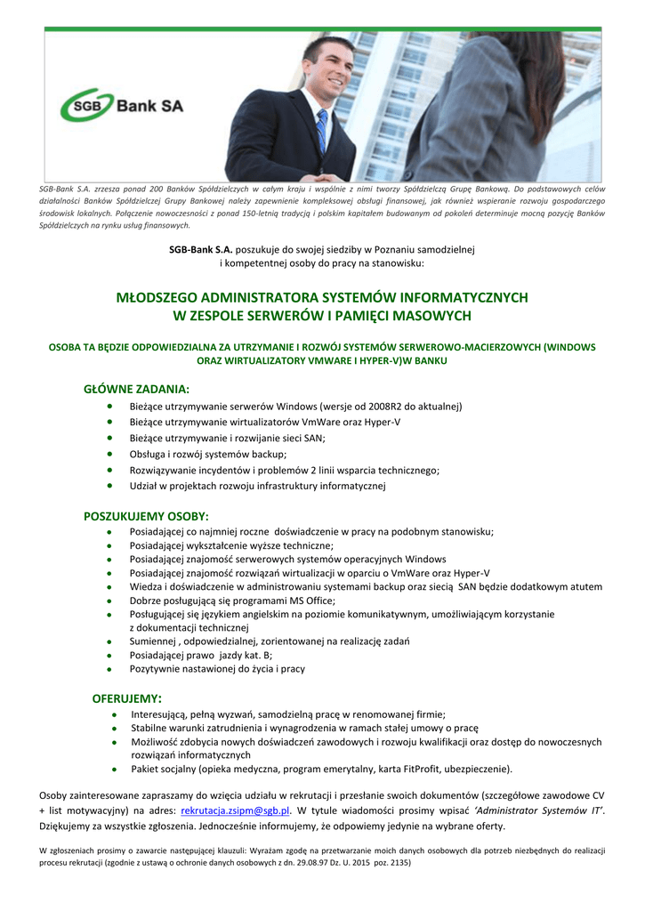 SGB-Bank S.A. zrzesza ponad 200 Banków Spółdzielczych w całym kraju i wspólnie z nimi tworzy Spółdzielczą Grupę Bankową. Do podstawowych celów działalności Banków Spółdzielczej Grupy Bankowej należy zapewnienie kompleksowej obsługi finansowej, jak również wspieranie rozwoju gospodarczego środowisk lokalnych. Połączenie nowoczesności z ponad 150-letnią tradycją i polskim kapitałem budowanym od pokoleń determinuje mocną pozycję Banków Spółdzielczych na rynku usług finansowych. SGB-Bank S.A. poszukuje do swojej siedziby w Poznaniu samodzielnej i kompetentnej osoby do pracy na stanowisku: MŁODSZEGO ADMINISTRATORA SYSTEMÓW INFORMATYCZNYCH W ZESPOLE SERWERÓW I PAMIĘCI MASOWYCH OSOBA TA BĘDZIE ODPOWIEDZIALNA ZA UTRZYMANIE I ROZWÓJ SYSTEMÓW SERWEROWO-MACIERZOWYCH (WINDOWS ORAZ WIRTUALIZATORY VMWARE I HYPER-V)W BANKU GŁÓWNE ZADANIA: Bieżące utrzymywanie serwerów Windows (wersje od 2008R2 do aktualnej) Bieżące utrzymywanie wirtualizatorów VmWare oraz Hyper-V Bieżące utrzymywanie i rozwijanie sieci SAN; Obsługa i rozwój systemów backup; Rozwiązywanie incydentów i problemów 2 linii wsparcia technicznego; Udział w projektach rozwoju infrastruktury informatycznej POSZUKUJEMY OSOBY: Posiadającej co najmniej roczne doświadczenie w pracy na podobnym stanowisku; Posiadającej wykształcenie wyższe techniczne; Posiadającej znajomość serwerowych systemów operacyjnych Windows Posiadającej znajomość rozwiązań wirtualizacji w oparciu o VmWare oraz Hyper-V Wiedza i doświadczenie w administrowaniu systemami backup oraz siecią SAN będzie dodatkowym atutem Dobrze posługującą się programami MS Office; Posługującej się językiem angielskim na poziomie komunikatywnym, umożliwiającym korzystanie z dokumentacji technicznej Sumiennej , odpowiedzialnej, zorientowanej na realizację zadań Posiadającej prawo jazdy kat. B; Pozytywnie nastawionej do życia i pracy OFERUJEMY: Interesującą, pełną wyzwań, samodzielną pracę w renomowanej firmie; Stabilne warunki zatrudnienia i wynagrodzenia w ramach stałej umowy o pracę Możliwość zdobycia nowych doświadczeń zawodowych i rozwoju kwalifikacji oraz dostęp do nowoczesnych rozwiązań informatycznych Pakiet socjalny (opieka medyczna, program emerytalny, karta FitProfit, ubezpieczenie). Osoby zainteresowane zapraszamy do wzięcia udziału w rekrutacji i przesłanie swoich dokumentów (szczegółowe zawodowe CV + list motywacyjny) na adres: [email protected]. W tytule wiadomości prosimy wpisać ‘Administrator Systemów IT’. Dziękujemy za wszystkie zgłoszenia. Jednocześnie informujemy, że odpowiemy jedynie na wybrane oferty. W zgłoszeniach prosimy o zawarcie następującej klauzuli: Wyrażam zgodę na przetwarzanie moich danych osobowych dla potrzeb niezbędnych do realizacji procesu rekrutacji (zgodnie z ustawą o ochronie danych osobowych z dn. 29.08.97 Dz. U. 2015 poz. 2135)