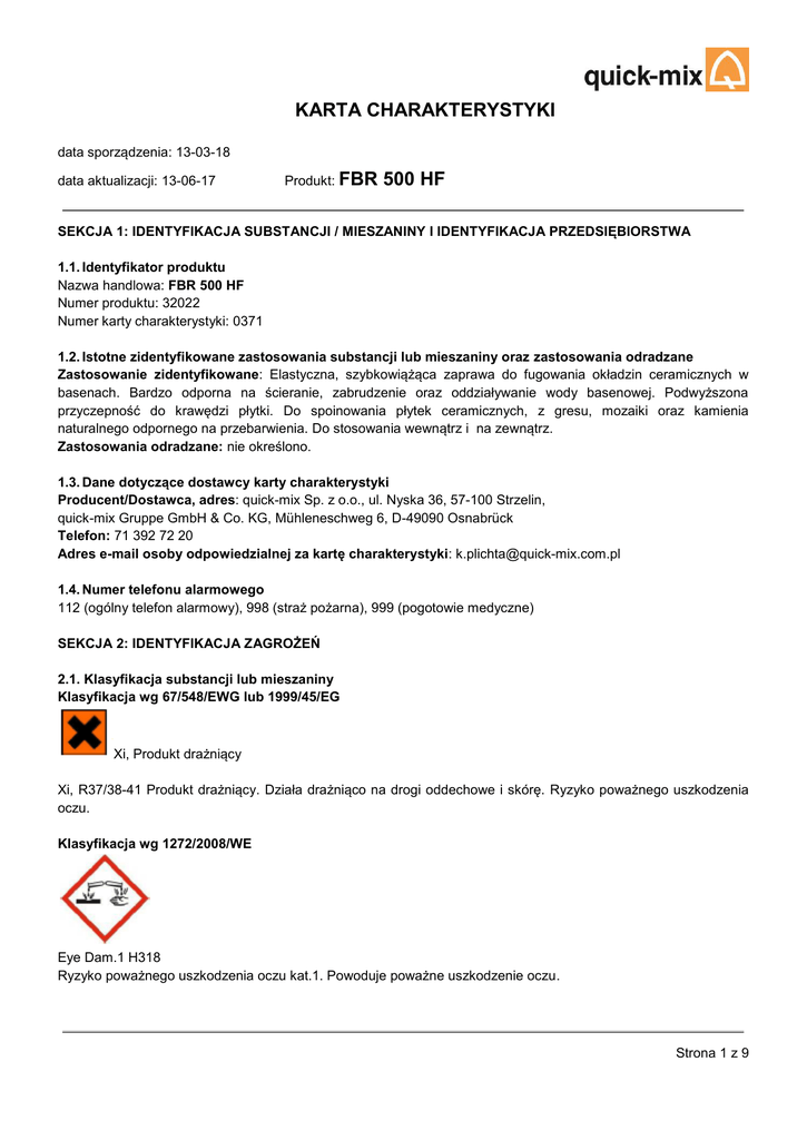 KARTA CHARAKTERYSTYKI Produkt: FBR 500 HF - quick-mix