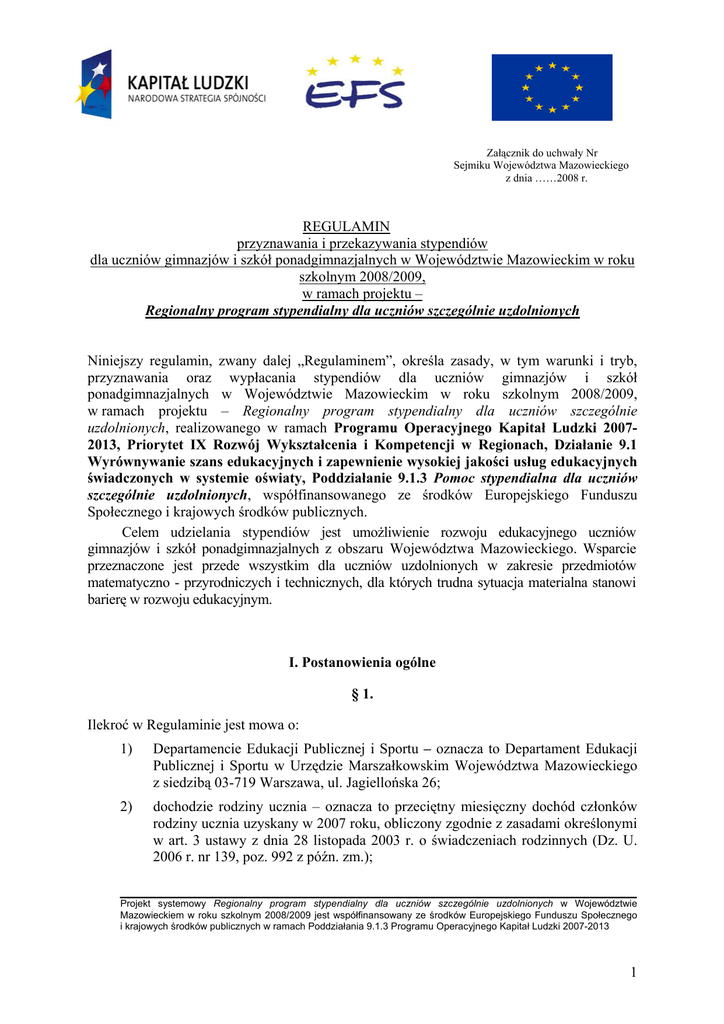 Załącznik do uchwały Nr Sejmiku Województwa Mazowieckiego z dnia ……2008 r. REGULAMIN przyznawania i przekazywania stypendiów dla uczniów gimnazjów i szkół ponadgimnazjalnych w Województwie Mazowieckim w roku szkolnym 2008/2009, w ramach projektu – Regionalny program stypendialny dla uczniów szczególnie uzdolnionych Niniejszy regulamin, zwany dalej „Regulaminem”, określa zasady, w tym warunki i tryb, przyznawania oraz wypłacania stypendiów dla uczniów gimnazjów i szkół ponadgimnazjalnych w Województwie Mazowieckim w roku szkolnym 2008/2009, w ramach projektu – Regionalny program stypendialny dla uczniów szczególnie uzdolnionych, realizowanego w ramach Programu Operacyjnego Kapitał Ludzki 20072013, Priorytet IX Rozwój Wykształcenia i Kompetencji w Regionach, Działanie 9.1 Wyrównywanie szans edukacyjnych i zapewnienie wysokiej jakości usług edukacyjnych świadczonych w systemie oświaty, Poddziałanie 9.1.3 Pomoc stypendialna dla uczniów szczególnie uzdolnionych, współfinansowanego ze środków Europejskiego Funduszu Społecznego i krajowych środków publicznych. Celem udzielania stypendiów jest umożliwienie rozwoju edukacyjnego uczniów gimnazjów i szkół ponadgimnazjalnych z obszaru Województwa Mazowieckiego. Wsparcie przeznaczone jest przede wszystkim dla uczniów uzdolnionych w zakresie przedmiotów matematyczno - przyrodniczych i technicznych, dla których trudna sytuacja materialna stanowi barierę w rozwoju edukacyjnym. I. Postanowienia ogólne § 1. Ilekroć w Regulaminie jest mowa o: 1) Departamencie Edukacji Publicznej i Sportu – oznacza to Departament Edukacji Publicznej i Sportu w Urzędzie Marszałkowskim Województwa Mazowieckiego z siedzibą 03-719 Warszawa, ul. Jagiellońska 26; 2) dochodzie rodziny ucznia – oznacza to przeciętny miesięczny dochód członków rodziny ucznia uzyskany w 2007 roku, obliczony zgodnie z zasadami określonymi w art. 3 ustawy z dnia 28 listopada 2003 r. o świadczeniach rodzinnych (Dz. U. 2006 r. nr 139, poz. 992 z późn. zm.); ___________________________________________________________ Projekt systemowy Regionalny program stypendialny dla uczniów szczególnie uzdolnionych w Województwie Mazowieckiem w roku szkolnym 2008/2009 jest współfinansowany ze środków Europejskiego Funduszu Społecznego i krajowych środków publicznych w ramach Poddziałania 9.1.3 Programu Operacyjnego Kapitał Ludzki 2007-2013 1 3) Indywidualnym planie rozwoju edukacyjnego ucznia – oznacza to indywidualny program edukacyjny opracowany przez nauczyciela – opiekuna stypendysty dla uzdolnionego ucznia, we współpracy z tym uczniem/rodzicem ucznia lub opiekunem prawnym, związany z rozwijaniem uzdolnień ucznia; 4) nauczycielu – opiekunie stypendysty – oznacza to nauczyciela zatrudnionego w szkole, sprawującego opiekę dydaktyczną nad uzdolnionym uczniem, któremu przyznano stypendium; 5) portalu informatycznym – oznacza to interaktywny portal informatyczny pod nazwą „Mazowsze – stypendia dla uczniów” utworzony na stronie internetowej www.mazovia.pl; 6) programie stypendialnym – oznacza to Regionalny program stypendialny dla uczniów szczególnie uzdolnionych; 7) przedmiotach matematyczno – przyrodniczych – oznacza to matematykę, fizykę, chemię, biologię, przyrodę, geografię, astronomię, informatykę; 8) przedmiotach technicznych/zawodowych – oznacza to przedmioty technicznozawodowe ujęte w programie nauczania; 9) rodzinie ucznia – oznacza to rodziców ucznia lub opiekuna prawnego ucznia oraz pozostające na utrzymaniu rodziców/opiekuna prawnego dzieci w wieku do ukończenia 18 roku życia, a w przypadku pobierania nauki do ukończenia 25 roku życia, a także niepełnosprawne dzieci bez względu na wiek; 10) stypendyście – oznacza to ucznia, któremu przyznano stypendium w ramach projektu Regionalny program stypendialny dla uczniów szczególnie uzdolnionych; 11) szkołach ponadgimazjalnych – oznacza to szkoły wymienione w art. 9 ust. 1 pkt 3 ustawy z dnia 7 września 1991 r. o systemie oświaty (Dz.U. z 2004 r. Nr 256 poz. 2572 z późn. Zm.), z wyłączeniem szkół dla dorosłych; 12) Urzędzie – oznacza to Urząd Marszałkowski Województwa Mazowieckiego; 13) Województwie – oznacza to Województwo Mazowieckie; 14) Wydziałach Centrum – oznacza to Wydziały Mazowieckiego Samorządowego Centrum Doskonalenia Nauczycieli. II. Warunki i tryb przyznawania stypendiów § 2. Program stypendialny realizowany jest w roku szkolnym 2008/2009 na obszarze Województwa Mazowieckiego przez Departament Edukacji Publicznej i Sportu. § 3. W ramach programu stypendialnego planuje się przyznanie nie więcej niż 716 stypendiów dla uczniów gimnazjów i szkół ponadgimnazjalnych. § 4. 1. O stypendium w ramach programu stypendialnego mogą ubiegać się uczniowie, którzy spełniają łącznie następujące warunki: 2 1a. 2. 1) są uczniami gimnazjów lub szkół ponadgimnazjalnych zlokalizowanych na obszarze Województwa; 2) pochodzą z rodzin, w których dochód rodziny ucznia w przeliczeniu na osobę nie przekracza dwukrotności kwoty uprawniającej do uzyskania świadczeń rodzinnych określonej w art. 5 ust. 1 i 2 ustawy z dnia 28 listopada 2003 r. o świadczeniach rodzinnych (Dz. U. 2006 r. Nr 139, poz. 992 z późn. Zm.), tj. 1008 zł lub 1166 zł w przypadku, gdy członkiem rodziny jest dziecko niepełnosprawne tj. dziecko legitymujące się orzeczeniem o niepełnosprawności lub orzeczeniem o umiarkowanym albo o znacznym stopniu niepełnosprawności. Uczniowie ubiegający się o stypendium muszą spełniać także co najmniej jeden z poniższych warunków: 1) w roku szkolnym 2007/08 są laureatami konkursów przedmiotowych organizowanych lub współorganizowanych przez Mazowieckiego Kuratora Oświaty na podstawie rozporządzenia Ministra Edukacji Narodowej i Sportu z dnia 29 stycznia 2002 r. w sprawie organizacji oraz sposobu przeprowadzania konkursów, turniejów i
