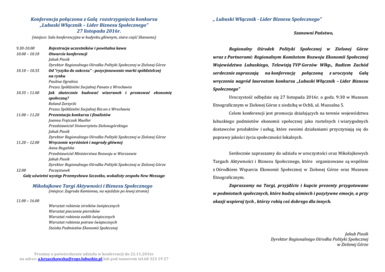Konferencja połączona z Galą rozstrzygnięcia konkursu „Lubuski Włącznik – Lider Biznesu Społecznego” 27 listopada 2016r. „ Lubuski Włącznik - Lider Biznesu Społecznego” Szanowni Państwo, (miejsce: Sala konferencyjna w budynku głównym, stara część Skansenu) 9.30-10.00 10.00 – 10.10 Rejestracja uczestników i powitalna kawa Otwarcie konferencji Jakub Piosik Dyrektor Regionalnego Ośrodka Polityki Społecznej w Zielonej Górze 10.10 – 10.35 Od "ryzyka do sukcesu” - pozycjonowanie marki spółdzielczej na rynku Paulina Ograbisz Prezes Spółdzielni Socjalnej Panato z Wrocławia 10.35 – 11.00 Jak skutecznie budować wizerunek i promować ekonomię społeczną? Roland Zarzycki Prezes Spółdzielni Socjalnej Biz:on z Wrocławia 11.00 – 11.20 Prezentacja konkursu i finalistów Joanna Frątczak Mueller Przedstawiciel Uniwersytetu Zielonogórskiego Jakub Piosik Dyrektor Regionalnego Ośrodka Polityki Społecznej w Zielonej Górze 11.20 – 12.00 Wręczenie wyróżnień i nagrody głównej Anna Bugalska Przedstawiciel Ministerstwa Rozwoju w Warszawie Jakub Piosik Dyrektor Regionalnego Ośrodka Polityki Społecznej w Zielonej Górze 12.00 Poczęstunek Galę uświetni występ Przemysława Szczotko, wokalisty zespołu New Message Mikołajkowe Targi Aktywności i Biznesu Społecznego (miejsce: Zagroda Kamienna, na wjeździe po lewej stronie) 11.00 – 16.00 Warsztat robienia stroików świątecznych Warsztat pieczenia pierników Warsztat robienia ozdób świątecznych Warsztat robienia potraw świątecznych Stoiska Podmiotów Ekonomii Społecznej Regionalny Ośrodek Polityki Społecznej w Zielonej Górze wraz z Partnerami: Regionalnym Komitetem Rozwoju Ekonomii Społecznej Województwa Lubuskiego, Telewizją TVP Gorzów Wlkp., Radiem Zachód serdecznie zapraszają na konferencję połączoną z uroczystą Galą wręczenia nagród laureatom konkursu „Lubuski Włącznik – Lider Biznesu Społecznego” Uroczystość odbędzie się 27 listopada 2016r. o godz. 9:30 w Muzeum Etnograficznym w Zielonej Górze z siedzibą w Ochli, ul. Muzealna 5. Celem konferencji jest promocja działających na terenie województwa lubuskiego podmiotów ekonomii społecznej jako rzetelnych i wiarygodnych dostawców produktów i usług, które swoimi działaniami przyczyniają się do poprawy jakości życia społeczności lokalnych. Serdecznie zapraszamy do udziału w uroczystości oraz Mikołajkowych Targach Aktywności i Biznesu Społecznego, które organizowane są wspólnie z Ośrodkiem Wsparcia Ekonomii Społecznej w Zielonej Górze oraz Muzeum Etnograficznym. Zapraszamy na Targi, przyjdźcie i kupcie prezenty przygotowane w podmiotach społecznych, które budzą uśmiech i pozytywne emocje, a przy okazji wspieraj tych , którzy robią coś dobrego dla innych. Jakub Piosik Dyrektor Regionalnego Ośrodka Polityki Społecznej w Zielonej Górze Prosimy o potwierdzenie udziału w konferencji do 22.11.2016r na adres: [email protected] lub pod numerem tel.68 323 19 27