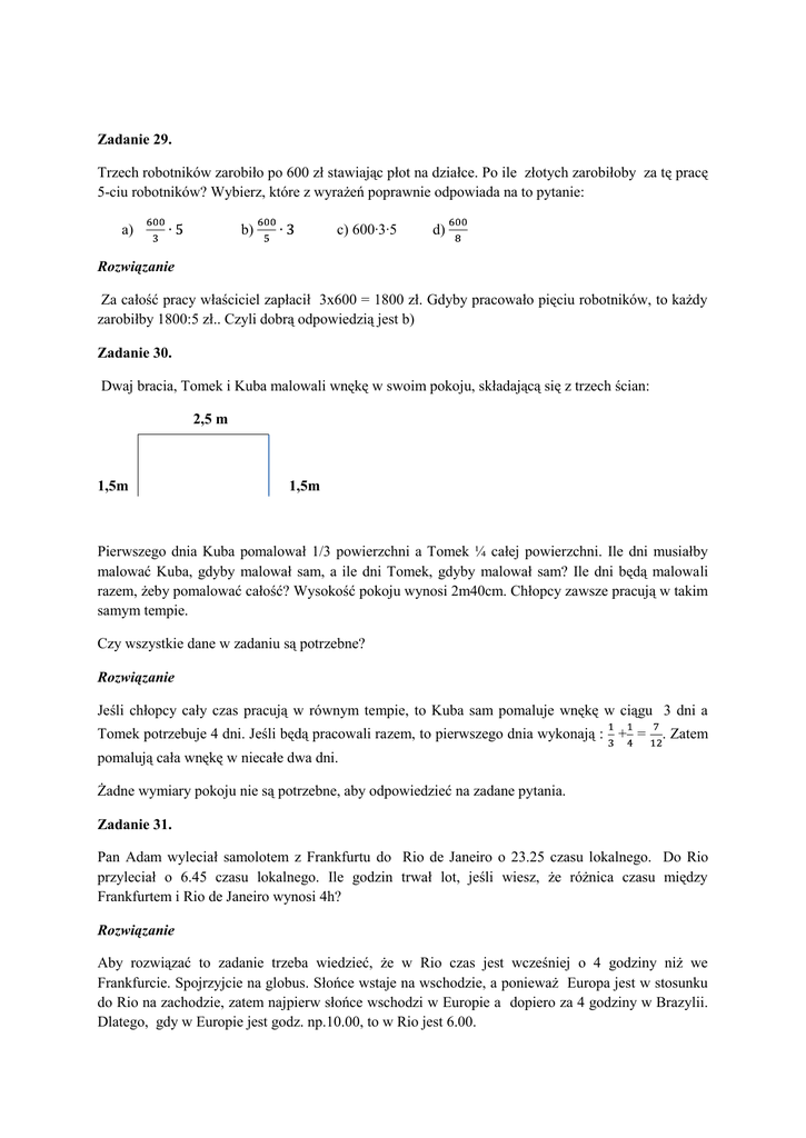Zadanie 29. Trzech robotników zarobiło po 600 zł stawiając płot na działce. Po ile złotych zarobiłoby za tę pracę 5-ciu robotników? Wybierz, które z wyrażeń poprawnie odpowiada na to pytanie: a) c) 600∙3∙5 b) d) Rozwiązanie Za całość pracy właściciel zapłacił 3x600 = 1800 zł. Gdyby pracowało pięciu robotników, to każdy zarobiłby 1800:5 zł.. Czyli dobrą odpowiedzią jest b) Zadanie 30. Dwaj bracia, Tomek i Kuba malowali wnękę w swoim pokoju, składającą się z trzech ścian: 2,5 m 1,5m 1,5m Pierwszego dnia Kuba pomalował 1/3 powierzchni a Tomek ¼ całej powierzchni. Ile dni musiałby malować Kuba, gdyby malował sam, a ile dni Tomek, gdyby malował sam? Ile dni będą malowali razem, żeby pomalować całość? Wysokość pokoju wynosi 2m40cm. Chłopcy zawsze pracują w takim samym tempie. Czy wszystkie dane w zadaniu są potrzebne? Rozwiązanie Jeśli chłopcy cały czas pracują w równym tempie, to Kuba sam pomaluje wnękę w ciągu 3 dni a Tomek potrzebuje 4 dni. Jeśli będą pracowali razem, to pierwszego dnia wykonają : + = . Zatem pomalują cała wnękę w niecałe dwa dni. Żadne wymiary pokoju nie są potrzebne, aby odpowiedzieć na zadane pytania. Zadanie 31. Pan Adam wyleciał samolotem z Frankfurtu do Rio de Janeiro o 23.25 czasu lokalnego. Do Rio przyleciał o 6.45 czasu lokalnego. Ile godzin trwał lot, jeśli wiesz, że różnica czasu między Frankfurtem i Rio de Janeiro wynosi 4h? Rozwiązanie Aby rozwiązać to zadanie trzeba wiedzieć, że w Rio czas jest wcześniej o 4 godziny niż we Frankfurcie. Spojrzyjcie na globus. Słońce wstaje na wschodzie, a ponieważ Europa jest w stosunku do Rio na zachodzie, zatem najpierw słońce wschodzi w Europie a dopiero za 4 godziny w Brazylii. Dlatego, gdy w Europie jest godz. np.10.00, to w Rio jest 6.00. Zatem pan Adam przyleciał do Rio o 10.45 czasu europejskiego, więc leciał 11h i 20min. Zadanie 32. Ania przeczytała na opakowaniu jogurtu, że w 125 g ten jogurt zawiera 69 kcal. składników odżywczych. Ile kcal będzie się zawierać w opakowaniu 200 gramowym? Ania znalazła też informację, że w jednym opakowaniu zwiera się 4% tych składników. (RWS-składniki odżywcze, które powinny być spożywane przez większość osób). Ile procent RWS zawiera się w dwóch takich samych opakowaniach? Rozwiązanie. Odpowiedź na pierwsze pytanie jest prosta, polega na obliczeniu: 200 g = 125∙ . W opakowaniu 200 gramowym będzie więc 69∙ =110,4 g≈ 110g składników odżywczych. W drugim pytaniu jest mały haczyk. Procent zawsze odnosi się do jakiejś całości, więc w każdej ilości ten procent musi być taki sam- w tym przypadku zawsze 4.