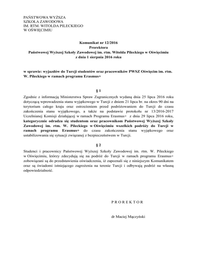 PAŃSTWOWA WYŻSZA SZKOŁA ZAWODOWA IM. RTM. WITOLDA PILECKIEGO W OŚWIĘCIMIU Komunikat nr 12/2016 Prorektora Państwowej Wyższej Szkoły Zawodowej im. rtm. Witolda Pileckiego w Oświęcimiu z dnia 1 sierpnia 2016 roku w sprawie: wyjazdów do Turcji studentów oraz pracowników PWSZ Oświęcim im. rtm. W. Pileckiego w ramach programu Erasmus+ §1 Zgodnie z informacją Ministerstwa Spraw Zagranicznych wydaną dnia 25 lipca 2016 roku dotyczącą wprowadzenia stanu wyjątkowego w Turcji z dniem 21 lipca br. na okres 90 dni na terytorium całego kraju oraz ostrzeżeniem przed podróżowaniem do Turcji do czasu zakończenia stanu wyjątkowego, a także na podstawie protokołu nr 13/2016-2017 Uczelnianej Komisji działającej w ramach Programu Erasmus+ z dnia 29 lipca 2016 roku, kategorycznie odradza się studentom oraz pracownikom Państwowej Wyższej Szkoły Zawodowej im. rtm. W. Pileckiego w Oświęcimiu wszelkich podróży do Turcji w ramach programu Erasmus+ do czasu zakończenia stanu wyjątkowego oraz ustabilizowania się sytuacji związanej z bezpieczeństwem w Turcji. §2 Studenci i pracownicy Państwowej Wyższej Szkoły Zawodowej im. rtm. W. Pileckiego w Oświęcimiu, którzy zdecydują się na podróż do Turcji w ramach programu Erasmus+ zobowiązani są do przedstawienia oświadczenia, iż zapoznali się z niniejszym Komunikatem oraz są świadomi istniejącego zagrożenia na terenie Turcji i odbywają podróż na własną odpowiedzialność. PROREKTOR dr Maciej Mączyński