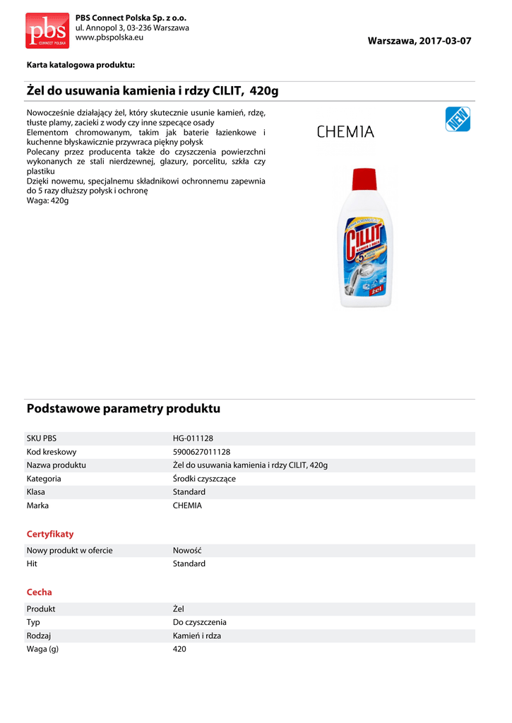 PBS Connect Polska Sp. z o.o. ul. Annopol 3, 03-236 Warszawa www.pbspolska.eu Karta katalogowa produktu: Żel do usuwania kamienia i rdzy CILIT, 420g Nowocześnie działający żel, który skutecznie usunie kamień, rdzę, tłuste plamy, zacieki z wody czy inne szpecące osady Elementom chromowanym, takim jak baterie łazienkowe i kuchenne błyskawicznie przywraca piękny połysk Polecany przez producenta także do czyszczenia powierzchni wykonanych ze stali nierdzewnej, glazury, porcelitu, szkła czy plastiku Dzięki nowemu, specjalnemu składnikowi ochronnemu zapewnia do 5 razy dłuższy połysk i ochronę Waga: 420g Podstawowe parametry produktu SKU PBS HG-011128 Kod kreskowy 5900627011128 Nazwa produktu Żel do usuwania kamienia i rdzy CILIT, 420g Kategoria Środki czyszczące Klasa Standard Marka CHEMIA Certyfikaty Nowy produkt w ofercie Nowość Hit Standard Cecha Produkt Żel Typ Do czyszczenia Rodzaj Kamień i rdza Waga (g) 420 Warszawa, 2017-03-07 PBS Connect Polska Sp. z o.o. ul. Annopol 3, 03-236 Warszawa www.pbspolska.eu Karta katalogowa produktu cd. Żel do usuwania kamienia i rdzy CILIT, 420g Podstawowe parametry produktu W ofercie od 2017-02 Wspólny słownik zamówień CPV 39830000-9 Środki czyszczące Warszawa, 2017-03-07