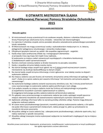 II Otwarte Mistrzostwa Śląska w Kwalifikowanej Pierwszej Pomocy Strażaków Ochotników 2015 Załącznik 2 II OTWARTE MISTRZOSTWA ŚLĄSKA w Kwalifikowanej Pierwszej Pomocy Strażaków Ochotników 2015 REGULAMIN MISTRZOSTW Warunki ogólne 1. W mistrzostwach muszą uczestniczyć 6-cio osobowe zespoły, złożone z członków Ochotniczych Straży Pożarnych (po ukończeniu kursu strażaka - ratownika lub równorzędnego). 2. Co najmniej 2 członków zespołu winno posiadać aktualne zaświadczenie potwierdzające posiadanie tytułu ratownika. 3. W Mistrzostwach nie mogą uczestniczyć osoby z wykształceniem medycznym m. in. lekarza, pielęgniarki/ pielęgniarza ratunkowego i ratownika medycznego. 4. Oficjalnymi językami ćwiczeń są: polski i dla zespołów zagranicznych - angielski. 5. Każdy etap części praktycznej składa się z następujących elementów: a) przejazdu trasy wg mapy lub mapki trasy rajdowej , b) wykonania na miejscu zadań ratowniczych wynikających z charakteru konkurencji, c) dodatkowych zadań sprawnościowych. 6. Numery startowe zostaną nadane w drodze losowania na początku zawodów. 7. Każdy z zespołów otrzyma tabelę czasów startu. 8. Na starcie każdego etapu zespół musi zgłosić się na 5 minut przed wyznaczonym czasem; niestawienie się skutkuje dyskwalifikacją na danym etapie. 9. Na starcie każdy zespół otrzyma informację o treści zgłoszenia oraz tabelę czasów na dojazd i wykonanie zadania. 10. Na miejscu zadania czas jest liczony od momentu otrzymania ustnej informacji od sędziego "czas start", chyba że w opisie zadania jest zawarta informacja "od momentu zatrzymania pojazdu ratowniczego". 11. Na wykonanie każdego zadania zostanie wyznaczony określony czas. Na 2 minuty przed końcem czasu wyznaczonego na wykonanie zadania sędzia poinformuje o tym załogę. 12. Czas pobytu zespołu na miejscu zadania może być krótszy od maksymalnego w przypadku: a) wypełnienia wszystkich czynności zaplanowanych w zadaniu, b) osiągnięcia końcowego punktu zadania (zależnie od konstrukcji zadania). 13. Po upływie czasu przeznaczonego na wykonanie zadania (po znaku sędziego) zespół opuszcza miejsce zdarzenia niezależnie od zaawansowania wykonanych czynności ratowniczych. 14. Sędziowie udzielają informacji tylko na wyraźną prośbę członków załogi. Pytania mogą dotyczyć wyłącznie realizacji zadania. 15. W czasie oceny poszkodowanego (pozorant, manekin) podczas wykonywania zadania, o ile sędzia nie poda informacji o parametrach medycznych, należy przyjąć te, jakie są symulowane na manekinie lub przez pozoranta. 16. Wszystkie zabiegi w czasie zadania (np.: zabezpieczenie poszkodowanego, założenie opatrunku, itp.) należy wykonać w sposób rzeczywisty. 17. Wszelkie zabiegi inwazyjne można wykonywać wyłącznie na manekinach znajdujących się na miejscu zdarzenia. Wszelkie prawa zastrzeżone. Kopiowanie, przetwarzanie, modyfikowanie i wykorzystywanie w innych publikacjach bez zgody organizatora surowo zabronione. II Otwarte Mistrzostwa Śląska w Kwalifikowanej Pierwszej Pomocy Strażaków Ochotników 2015 Załącznik 2 18. Zabrania się używania urządzeń do mechanicznego uciskania klatki piersiowej i wentylacji mechanicznej. 19. Organizatorzy nie ponoszą odpowiedzialności za uszkodzenie lub utratę sprzętu przez zespół. 20. Sprzęt konieczny do wykonania zadania, a wykraczający poza wytyczne KSRG dla zespołów zapewnia organizator. 21. Zespół posiada ekwipunek w postaci pełnego zestawu ratownictwa medycznego R1 tj. deska ortopedyczna kompletna, torba ratownicza wraz z butlą tlenową 2,7 l. i reduktorem, komplet szyn ortopedycznych ( szyny Kramera). 22. Wyposażenie osobiste zawodników : a) Pełne umundurowanie bojowe min. 2 osoby. b) Lekkie ubrania ratownicze typu koszarowego 4 zawodników - wyposażeni w hełmy lub kaski ratownicze np. typ TYTAN , PETZL etc. 23. Załogi zobowiązane są do podporządkowania się poleceniom wydawanym przez sędziów. 24. W miejscu zadania (w oznaczonym terenie) znajdować się mogą jedynie zawodnicy, sędziowie i osoby dopuszczone przez organizatorów. 25. Punktacja każdego zadania będzie opierać się na tabelach oceny (do wglądu po zakończeniu mistrzostw). 26. Klasyfikacja końcowa jest oparta na sumie punktów zdobytych przez zespół podczas wykonywania wszystkich zadań, po odjęciu punktów karnych. 27. Spóźnienie na miejsce wykonywania zadania przekraczające czas 5 min. ponad dopuszczalny limit powoduje dyskwalifikację spóźnionego zespołu na danym punkcie. Jeśli spóźnienie wynika z winy organizatorów punkt ten nie ma zastosowania. 28. W czasie wykonywania zadania zabrania się zespołowi korzystania z urządzeń do rejestracji dźwięku i obrazu oraz z telefonów komórkowych (chyba że charakter zadania tego wymaga). Bezpieczeństwo 29. Mistrzostwa odbywają się w miejscach publicznych i na drogach publicznych, w związku z tym startujące załogi obowiązuje przestrzeganie przepisów o ruchu drogowym, zachowanie szczególnej ostrożności podczas realizacji zadań oraz podczas poruszania się po drogach. 30. W trakcie Mistrzostw NIE WOLNO używać sygnałów świetlno-dźwiękowych z wyjątkiem sytuacji, w których: a) w mapie znajduje się odpowiednia dyspozycja, b) ich użycie jest konieczne do zabezpieczenia miejsca zdarzenia, c) zespół w trakcie wykonywania zadania napotkał rzeczywiste zdarzenie, wymagające użycia sygnalizacji. 31. Kierowcy pojazdów ratowniczych są zobowiązani do posiadania przy sobie kompletu dokumentów wymaganych do prowadzenia pojazdu ratowniczego. 32. Na trasie rajdu mogą znaleźć się patrole Policji mierzące prędkość oraz sprawdzające przestrzeganie przepisów o ruchu drogowym tak samo jak trzeźwość kierowców, wszelkie naruszenia będą skutkować ukaraniem zgodnie z postanowieniami Kodeksu Ruchu Drogowego . 33. Do startu w ćwiczeniach będą dopuszczone tylko oznakowane w sygnały świetlne i dźw