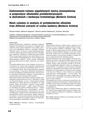&ARM0RZEGL.AUK :ASTOSOWANIEKOLUMNWYPENIONYCHYWICJONOWYMIENN WPREPARATYCEALKALOIDÌWPROTOBERBERYNOWYCH WEKSTRAKTACHZBERBERYSUKRETEÊSKIEGO"ERBERIS#RETICA 2ESINCOLUMNSINANALYSISOFPROTOBERBERINEALKALOIDS FROMDIFFERENTEXTRACTSOFCRETANBARBERRY"ERBERIS#RETICA 7IRGINIA+UKUA.EKTARIOS!LIGIANNIS!LEXIOS,EANDROS3KALTSOUNIS+AZIMIERZ'OWNIAK +ATEDRAI:AKAD&ARMAKOGNOZJIZ0RACOWNI2OuLIN,ECZNICZYCH5NIWERSYTET-EDYCZNYW,UBLINIE $EPARTMENTOF0HARMACOGNOSYAND0HARMACEUTICAL#HEMISTRY .ATIONALAND+APODISTRIAN5NIVERSITYOF!THENS'REECE Streszczenie Badania fitochemiczne ekstraktów roślinnych, będących bogatymi mieszaninami ciał czynnych, wymagają wprowadzenia wielu metod rozdzielania oraz analizy zawartych w nich składników. Obecne w materiale roślinnym chlorofile, cukry, czy tłuszcze często utrudniają przeprowadzenie analizy jakościowej bądź ilościowej. Występując w nadmiarze, substancje te zafałszowują obraz badań. Wobec powyższego konieczne jest wprowadzenie do nowych technik chromatograficznych celem postępowania laboratoryjnego szybkiej i łatwej metody rozdzielenia substancji aktywnych od cukrów, tłuszczów oraz chlorofili. W przeprowadzonej pracy użyto kolumny żywicowe jonowymienne do oczyszczenia ekstraktów pochodzących z różnych części berberysu kreteńskiego (Berberis cretica) z nadmiaru cukrów. Jako cząsteczki polarne, stanowią one przeszkodę w oznaczeniu alkaloidów protoberberynowych posiadających podobną polarność. Dotychczasowe doniesienia literaturowe traktują o wykorzystaniu tej metody jedynie dla rozdzielenia flawonoidów. Skuteczność metody sprawdzono, stosując technikę chromatografii cienkowarstwowej (TLC). Procedura ta miała na celu potwierdzenie, iż wraz z zastosowaniem kolumn amberlitowych, skład jakościowy ekstraktów nie uległ zmianie. Strata ciał czynnych – głównie z grupy alkaloidów protoberberynowych - byłaby wysoce niekorzystna. Warunkują one główne działania berberysu – między innymi: przeciwmalaryczne, przeciwbólowe, przeciwbakteryjne, przeciwarytmiczne, żółciotwórcze czy przeciwdepresyjne. Niniejsza praca potwierdziła skuteczność wprowadzonej metody oczyszczania. Dzięki zastosowaniu kolumn z żywicą jonowymienną otrzymano ekstrakt pozbawiony cukrów bez istotnego wpływu na skład jakościowy pozostałych metabolitów wtórnych. Słowa kluczowe: alkaloidy, berberys, chromatografia cienkowarstwowa. Summary Phytochemical analysis of plant extracts, which are rich mixtures of active compounds, employs different separative and analytical methods. Chlorofiles, sugars or fats present in plant material make both the qualitative and quantitaive analisis difficult. Being in excess, they falsify the results. In that case it is advisable to introduce to analytical procedures a fast and easy method to separate the active compounds from the disturbing agents. Research presented in the current paper is focused on purification of extracts coming from different parts of Cretan barberry (Berberis cretica) from excess sugars using resin columns. Sugars, polar molecules, disturb in the analysis of protoberberine alkaloids, which are substances of similar polarity. According to current research, amberlite columns are commonly used in plants reach in flavonoids. Separation of Cretan barberry’s extracts on resin columns is the first trial. Efficacy of this method was controlled using thin-layer chromatography – on TLC plates. The procedure above was employed to check, whether there is no loss in active compounds’ concentration after the separation on resin columns. The propable loss of active constituents, mainly those belonging to protoberberine alkaloids, would be highly unfavourable. Just because they determine berberry’s properties: antimalarial, antibacterial, antiarrhytmic, cholagogic or antidepressive. Current study confirmed the efficacy of introduced method. Usage of resin columns helps to get rid of sugars without any significant difference in qualitative composition of barberry’s extract. Key words: alkaloids, barberry, ion-exchange resins, thin layer chromatography. COPYRIGHT'RUPADR!2+WIECIÊSKIEGO)33. Wstęp Metody oczyszczania próbek wykorzystują mechanizmy adsorpcji, filtracji, sedymentacji, osmozy, utleniania, czy też wymiany jonowej. Do najbardziej popularnych należy adsorpcja zanieczyszczeń lub substancji niepożądanych na cząstkach węgla aktywnego. Kolumny węglowe skutecznie usuwają chlorofil z ekstraktów roślinnych. Należy jednak nadmienić, iż proces regeneracji złoża jest kosztowny. Rozwiązaniem powyższego problemu było wprowadzenie żywic jonowymiennych. Możliwość łatwej modyfikacji ich powierzchni oraz porowatości wpływa na zwiększenie selektywności jonitu [1,2]. Żywice jonowymienne to nierozpuszczalne polimery, które cechuje zdolność do wymiany jonów z roztworem – anionów lub kationów. Posiadają one w swojej strukturze grupy jonogenne, które wiążą określone składniki mieszaniny, uwalniając je pod wpływem zmiany pH eluentu [3]. Stosowane obecnie żywice mogą być pochodzenia naturalnego (zeolity, glaukonity, torf, celuloza, glinka czerwona, węgiel) lub też syntetycznego (polimery styrenu, diwinylobenzenu, pirydyny, polietylenoimina, żywica fenolowoformaldehydowa). Tych ostatnich używa się na szerszą skalę zarówno w przemyśle, jak i w laboratoriach analitycznych [4,5]. Uformowane w postaci perełek syntetyczne jonity pęcznieją po zanurzeniu w roztworze wodnym. Duża powierzchnia całkowita żywic warunkuje sprawną separację. Żywice jonowymienne wykorzystuje się między innymi podczas usuwania przeszkadzających jonów oraz trucizn (np. dioksyn) z roztworów, zagęszczania próbek, koncentracji związków fenolowych, a także podczas ekstrakcji olejków eterycznych z ekstraktów roślinnych [6,7]. W przeprowadzonym badaniu wykorzystano właściwości jonowymienne żywic w celu wyeliminowania z ekstraktów roślinnych niepożądanych związków