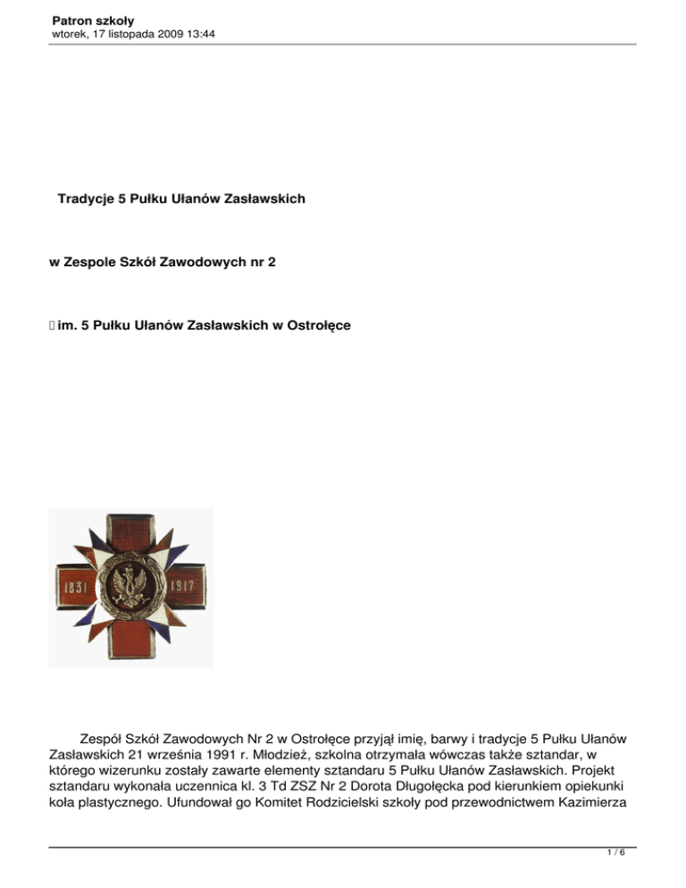 Patron szkoły wtorek, 17 listopada 2009 13:44 Tradycje 5 Pułku Ułanów Zasławskich w Zespole Szkół Zawodowych nr 2 im. 5 Pułku Ułanów Zasławskich w Ostrołęce Zespół Szkół Zawodowych Nr 2 w Ostrołęce przyjął imię, barwy i tradycje 5 Pułku Ułanów Zasławskich 21 września 1991 r. Młodzież, szkolna otrzymała wówczas także sztandar, w którego wizerunku zostały zawarte elementy sztandaru 5 Pułku Ułanów Zasławskich. Projekt sztandaru wykonała uczennica kl. 3 Td ZSZ Nr 2 Dorota Długołęcka pod kierunkiem opiekunki koła plastycznego. Ufundował go Komitet Rodzicielski szkoły pod przewodnictwem Kazimierza 1/6 Patron szkoły wtorek, 17 listopada 2009 13:44 Ogrodzińskiego. Przekazanie tradycji 5 Pułku szkole powstało z inspiracji Społecznego Komitetu Obchodów 70 Rocznicy Przybycia 5 Pułku Ułanów Zasławskich do Ostrołęki. Komitet powstał w 1989 r. na plebani p. w. św. Wojciecha w Ostrołęce-Wojciechowicach, kierowanej przez proboszcza honorowego kapelana 5 Pułku Ułanów Zasławskich, ks. Antoniego Pęksę. W skład Komitetu wchodzili weterani 5 Pułku, m.i.n. por. Grzegorz Płodowski, rtm. Marian Michniewicz, historycy – Henryk Maćkowiak, Jerzy Dziewirski, Jerzy Kijowski, nauczyciele ZSZ nr 2 – dyrektor Czesław Kisiel, Wiesława Gałka, Roman Filipowicz, Zdzisław Kozłowski oraz ostrołęccy społecznicy. Przewodniczącym Komitetu został Henryk Maćkowiak, sekretarzem Wiesława Gałka. Głównym celem pracy Komitetu było przywrócenie Ostrołęce pięknych kart historii związanych z 5 Pułkiem, który w latach 1921-1939 stacjonował w Ostrołęce oraz upamiętnienie czynu bojowego jego poległych żołnierzy i żyjących weteranów od 1931 – wojny obronnej 1939 r. Z tej okazji powstał pomnik-głaz, odsłonięty 22 września 1991 r. w pobliżu dawnego kościoła Garnizonowego, w miejscu dawnej bramy głównej koszar. Pomyślna realizacja wszelkich przedsięwzięć Komitetu była możliwa dzięki ks. Antoniemu Pęksie, który w środowisku ostrołęckim cieszył się wyjątkowo wysokim autorytetem. Posiadał dar zjednywania ludzi poprzez ojcowski stosunek do nich, emanujący troską i miłością. Odnosiło się to także do młodego pokolenia, ,,nadziei dla Polski’’, jak to często mawiał. Liczną społeczność ZSZ Nr 2 upodobał sobie szczególnie. Wierzył, że jedynie młodzież, która obecnie uczy się w miejscu pobytu dawnych żołnierzy 5 Pułku, może być spadkobiercą jego pięknych tradycji. Ks. Antoni Pęksa przyczynił się bezpośrednio do przeniesienia tradycji 5 Pułku Ułanów Zasławskich z zacisza swojej plebani do szkoły leżącej w jej pobliżu. Podczas uroczystości Święta Pułku 21-22 września 1991r. po raz pierwszy od 1939 r zabrzmiał marsz 5 Pułku w wykonaniu orkiestry wojskowej i odbył się apel poległych, podczas którego Kompania Honorowa Wojska Polskiego oddała salwy honorowe. Na boisku szkolnym ZSZ Nr 2, podczas Mszy św. Polowej w intencji – poległych i zmarłych żołnierzy 5 Pułku wspólnie modlili się weterani, ich rodziny, oficerowie, żołnierze wojska, władze miasta i województwa, duchowni, młodzież, nauczyciele oraz społeczeństwo Ostrołęki. Piękne patriotyczne kazanie do zgromadzonych wygłosił ks. Henryk Kietliński. S.A.C. z Warszawy. Organizacja uroczystości w całości została oparta o ZSZ Nr 2. Od 1991 r. weszła ona na 2/6 Patron szkoły wtorek, 17 listopada 2009 13:44 stałe do planu pracy szkoły. Komitet Obchodów 70 rocznicy .. w 1991 r. przekształcił się w Koło Przyjaciół 5 Pułku Ułanów Zasławskich przy ZSZ Nr 2. Liczba członków koła stopniowo zwiększała się o nauczycieli-wychowawców ZSZ Nr 2. W planach pracy wychowawców klasowych coraz więcej miejsca zajmowała praca wychowawcza związana z patronem szkoły – jego tradycjami, historią oraz organizowano spotkania z weteranami. Nad realizacją tych planów czuwała do 1998 r. Bożena Szajkowska – wicedyrektor ds. wychowawczych. Każdy kolejny rok pielęgnowania tradycji 5 Pułku przez młodzież ZSZ Nr 2 wzbogacał scenariusz uroczystości wrześniowych o nowe elementy. Z każdym rokiem też wzrastało zainteresowanie społeczeństwa, a szczególnie młodzieży. Trzecia niedziela września stała się już hasłem, znanym w środowisku ostrołęckim i poza nim. Jest datą oczekiwaną i stanowi wielkie wydarzenie dla miasta. Zawsze uczestniczą w nim władze miasta i województwa, weterani i ich rodziny., których krąg się rozszerza – z polski i zza granicy, duchowni i młodzież szkolna, wojsko, społeczeństwo Ostrołęki i okolic. Rangę uroczystości podnosi udział Kampanii Honorowej i Orkiestry Wojskowej, o których zapewnienie od samego początku organizowania świąt pułkowych troszczy się Dowództwo Garnizonu i WKU Ostrołęka współpracujące ze szkołą. Przez te wszystkie lata społeczność szkolna ZSZ Nr 2 w Ostołęce wypracowała własne tradycje w oparciu o historię patrona i przy pomocy żyjących jego przedstawicieli. Niedzielne święta pułkowe poprzedzają akademie szkolne o randze spektakli teatralnych, tak w zakresie treści, jak i scenografii, gdzie dominują symbole i barwy 5 Pułku. W maju każdego roku następuje finał konkursu. Spośród jego uczestników wyłaniają się uczniowie szczególnie zainteresowani historią patrona szkoły. Zainspirowało to opiekunkę Izby Tradycji do utworzenia w 1996 r. Młodzieżowego Koła Przyjaciół 5 Pułku Ułanów Zasławskich. Członkowie koła pomagają w opracowaniu informacji o patronie, zamieszczanych w gablotach w holu szkoły i na specjalnych tablicach w świetlicy szkolnej. Prowadzą korespondencję z weteranami. Pracują przy konserwacji niektórych eksponatów. Służą pomocą gościom przybywającym na święto wrześniowe. Z tej okazji też organizują miejsca wystaw dla kolekcjonerów militariów i innych, prezentujących swoje zbiory. Uczestniczą w wycieczkach związanych z miejscami pami