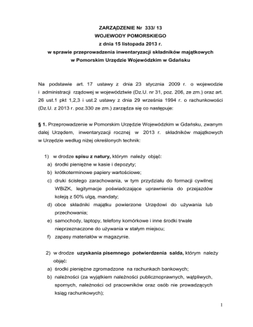 ZARZĄDZENIE Nr 333/ 13 WOJEWODY POMORSKIEGO z dnia 15 listopada 2013 r. w sprawie przeprowadzenia inwentaryzacji składników majątkowych w Pomorskim Urzędzie Wojewódzkim w Gdańsku Na podstawie art. 17 ustawy z dnia 23 stycznia 2009 r. o wojewodzie i administracji rządowej w województwie (Dz.U. nr 31, poz. 206, ze zm.) oraz art. 26 ust.1 pkt 1,2,3 i ust.2 ustawy z dnia 29 września 1994 r. o rachunkowości (Dz.U. z 2013 r. poz.330 ze zm.) zarządza się co następuje: § 1. Przeprowadzenie w Pomorskim Urzędzie Wojewódzkim w Gdańsku, zwanym dalej Urzędem, inwentaryzacji rocznej w 2013 r. składników majątkowych w Urzędzie według niżej określonych technik: 1) w drodze spisu z natury, którym należy objąć: a) środki pieniężne w kasie i depozyty; b) krótkoterminowe papiery wartościowe; c) druki ścisłego zarachowania, w tym przydziału do formacji cywilnej WBiZK, legitymacje poświadczające uprawnienia do przejazdów koleją z 50% ulgą, mandaty; d) obce składniki majątku powierzone Urzędowi do używania lub przechowania; e) samochody, laptopy, telefony komórkowe i inne środki trwałe nieprzeznaczone do używania w stałym miejscu; f) zapasy materiałów w magazynie. 2) w drodze uzyskania pisemnego potwierdzenia salda, którym należy objąć: a) środki pieniężne zgromadzone na rachunkach bankowych; b) należności (za wyjątkiem należności publicznoprawnych, wątpliwych, spornych, należności od pracowników oraz osób nie prowadzących ksiąg rachunkowych); 1 c)swłasne składniki majątku powierzone kontrahentom. 3) w drodze porównania stanu ewidencyjnego z dokumentacją oraz w drodze analizy i weryfikacji, którym należy objąć: a) grunty, budowle i budynki; b) środki trwałe w budowie; c) wartości niematerialne i prawne; d) należności sporne i wątpliwe, także dochodzone w drodze sądowej oraz te, co do których niemożliwe było uzyskanie potwierdzenia sald; e) należności i zobowiązania wobec pracowników; f) zobowiązania wobec kontrahentów; g) sprzęt i wyposażenie przekazane pracownikom za potwierdzeniem; h) należności i zobowiązania z tytułu rozrachunków publiczno-prawnych; i) fundusz jednostki i fundusze specjalne; l) materiały i towary w drodze, dostawy niefakturowane; m) rozliczenia międzyokresowe kosztów; n) środki pieniężne w drodze. §2.1. Do przeprowadzenia spisu z natury składników majątkowych Urzędu powołuje się komisję w składzie: 1) przewodniczący komisji inwentaryzacyjnej – Karolina Golińska 2) zastępca przewodniczącego komisji do przeprowadzenia inwentaryzacji w Gdańsku – Mariola Pionkowska 3) zastępca przewodniczącego komisji do przeprowadzenia inwentaryzacji w Słupsku – Jadwiga Borowińska 4) sekretarz komisji inwentaryzacyjnej – Hanna Łada 5) członek komisji – Kamil Miecznikowski 6) członek komisji – Elżbieta Paprocka 7) członek komisji – Bernadeta Staniuk 8) członek komisji – Weronika Dąbska 9) członek komisji - Agnieszka Banaszewska 2 2. Do przeprowadzenia porównań stanu ewidencyjnego z dokumentacją oraz w drodze analizy i weryfikacji składników majątkowych Urzędu powołuję zespoły weryfikacji aktywów i pasywów: 1) przewodniczący zespołu przeprowadzenia weryfikacji aktywów i pasywów PUW w Gdańsku – Karolina Zimniewicz 2) członek zespołu – Marzena Jędrzejewska 3) członek komisji – Anna Gruszka 4) członek komisji – Michał Joszczak 5) przewodniczący zespołu przeprowadzenia weryfikacji aktywów i pasywów PUW w Słupsku – Ewa Gzela 6) członek komisji – Joanna Dmytrów 7) członek komisji – Joanna Kokosińska 3. Do sporządzenia potwierdzeń sald z tytułu umów użyczenia i należności Urzędu powołuję zespoły: 1) przewodniczący zespołu potwierdzeń sald z tytułu umów użyczenia i należności PUW w Gdańsku – Anna Gąsiorowska 2) członek zespołu – Anna Kowalczyk-Chmielewska 3) członek zespołu – Danuta Kułak 4) członek zespołu – Jolanta Kondrat 5) przewodniczący zespołu potwierdzeń sald z tytułu umów użyczenia i należności PUW w Słupsku – Kwarta Bożena 6) członek komisji – Joanna Dmytrów 7) członek komisji – Wiesława Ragin §4. Szczegółowe zasady i sposób wykonania czynności inwentaryzacyjnych określa przewodniczący komisji inwentaryzacyjnej zgodnie z instrukcją inwentaryzacyjną § 5. Nazwa obiektu i oznaczenie obiektu, w którym przeprowadza się spis: 1. magazyn artykułów biurowych 2. magazyn artykułów spożywczych 3. magazyn środków czystości itp. 4. magazyn konserwatorów 3 5. magazyn sprzętu biurowego nowego 6. magazyn Oddziału Transportu 7. kasa 1 – PUW w Gdańsku 8. kasa 2- PUW w Gdańsku 9. kasa – PUW w Słupsku 10. obce składniki majątku powierzone Urzędowi do używania lub przechowywania – według miejsca użytkowania §6. Rodzaj inwentaryzacji: okresowa §7. Spis należy przeprowadzić według stanu na dzień: 31.12.2013 r. §8. Terminem rozpoczęcia inwentaryzacji ustala się dzień 20 listopada 2013 r., z terminem przeprowadzenia do dnia 15 stycznia 2014 r. i zakończenia inwentaryzacji dzień 21 marca 2014 r. §9. Za sprawny, terminowy i prawidłowy przebieg czynności inwentaryzacyjnych odpowiedzialny jest przewodniczący komisji inwentaryzacyjnej. Natomiast za prawidłowe rozliczanie inwentaryzacji odpowiedzialny jest główny księgowy. §10. Zarządzenie należy podać do wiadomości komórek organizacyjnych Urzędu, w których będzie przeprowadzana inwentaryzacja oraz osobom powołanym do komisji inwentaryzacyjnej i zespołów spisowych. §11. Zarządzenie wchodzi w życie z dniem podpisania. WOJEDA POMORSKI /-/ Ryszard Stachurski 4