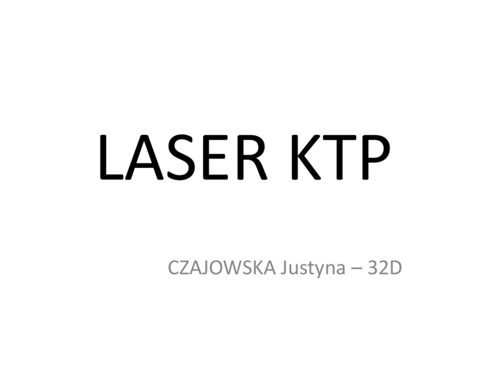 LASER KTP CZAJOWSKA Justyna – 32D WSTĘP • Lasery coraz częściej są stosowne we współczesnej medycynie. Efekt oddziaływania światła laserowego na organizm jest wypadkową właściwości fizycznych światła lasera i właściwości fizyko-chemicznych komórki, do której światło dociera, co daje w sumie olbrzymią różnorodnośd efektów laseroterapii. Laser Nd:Yag z II harmoniczną (KTP) CHARAKTERYSTYKA • Laser Nd:YAG emituje promieniowanie o długości fali 1064 nm. Obecnie stosuje się różne techniki mające na celu poszerzenie zakresu emitowanego promieniowania, czyli tzw. generowanie wyższych harmonicznych. W tym celu wykorzystuje się kryształy nieliniowe (np. KTP; K - potas, T -tytan, P - fosfor), które pobudzone dużą energią, w wydajny sposób pozwalają generowad kolejne harmoniczne. W ten sposób laser Nd:YAG pozwala na uzyskanie kolejno II (532 nm), III (335 nm) i IV (266 nm) harmonicznej. ZASADA DZIAŁANIA • Laser Nd - Yag z II harmoniczną (KTP) generuje promieniowanie o długości fali 532 nm. Promieniowanie o takiej długości fali jest intensywnie pochłaniane przez fotochrom, jakim jest hemoglobina, zawarty w czerwonych krwinkach (erytrocytach). W wyniku tej reakcji następuje zlepianie się tych krwinek w konglomeraty, które „czopują” naczynie krwionośne i hamują w nim przepływ. ZASTOSOWANIE • Dlatego laser KTP jest predysponowany do usuwania wszelkich zmian naczyniowych z powierzchni skóry, bez uszkodzenia jej ciągłości w następujących przypadkach klinicznych: znamiona naczyniowe płaskie, rumieo naczyniowy, teleangiektazje i wenektazje (do 1 mm średnicy), zmiany naczyniowe posłoneczne, trądzik różowaty. ZASTOSOWANIE – cd. • Do leczenia znamion naczyniowych płaskich stosujemy następujące lasery: laser argonowy, barwnikowy, laser KTP oraz system IPL. Laseroterapia znamion naczyniowych płaskich polega na denaturacji hemoglobiny w erytrocytach wypełniających drobne naczynia krwionośne tworzące znamię naczyniowe, a w efekcie zmniejszenie liczby naczyo i zblednięcie naczyniaka. Teleangiektazje - rozszerzone powierzchowne naczynia krwionośne czyli tzw. „pajączki” • Teleangiektazje - rozszerzone powierzchowne naczynia krwionośne, czyli tzw. „pajączki naczyniowe”, są to zmiany nabyte i powstają w przebiegu różnych schorzeo, np. w trądziku różowatym, toczniu rumieniowatym, w ciąży czy w wyniku zmian towarzyszących starzeniu się skóry. TELEANGIEKTAZJE • Najczęściej są one zlokalizowane na skórze twarzy w obrębie policzków i nosa, a także na udach i podudziach (zwłaszcza w przebiegu ciąży i w przewlekłej niewydolności żylnej). Dotychczas stosowane metody terapeutyczne, takie jak krioterapia czy elektrokoagulacja, często nie przynosiły pożądanych efektów i obarczone były możliwością powikłao. NACZYNIAKI • Do zamykania rozszerzonych naczyo krwionośnych stosujemy: laser argonowy, barwnikowy, laser KTP, laser Nd:YAG oraz system IPL. W przypadku zmian naczyniowych światło lasera zamieniane jest w ciepło, co powoduje termiczną koagulację, a w jej wyniku - zamknięcie naczyo krwionośnych w skórze właściwej. Naczyniaki jamiste • Naczyniaki jamiste często występują w obrębie błon śluzowych lub czerwieni wargowej, gdzie zmiana jest głębsza i wymaga większej energii użytego lasera. Głębokie naczyniaki jamiste twarzy stanowią duży problem terapeutyczny. Próby leczenia chirurgicznego nie powodują ustąpienia zmian. Zastosowanie promieniowania laserowego o dużej mocy umożliwiło skuteczne leczenie tego typu zmian. METODA • Zabiegi wykonuje się metodą bezkontaktową, pod kontrolą kliniczną polegającą na ocenie zbielenia zmiany chorobowej i zmniejszenia objętości naczyniaka. W leczeniu bardzo rozległych naczyniaków jamistych wymagane jest kilkakrotne powtórzenie zabiegu. Ze względu na uszkodzenie termiczne proces gojenia przebiega powoli, aż do zamknięcia światła rozszerzonych naczyo krwionośnych SPRZĘT LASEROWY • Do ich usuwania stosujemy lasery: argonowy, barwnikowy, laser KTP, laser Nd:YAG oraz system IPL. FOTO-ODMŁADZANIE • Do głównych aplikacji wykonywanych przy pomocy tego lasera należą: zamykanie naczyo o średnicach do 1,0 mm, usuwanie pajączków i naczyniaków oraz zabiegi foto-odmładzania