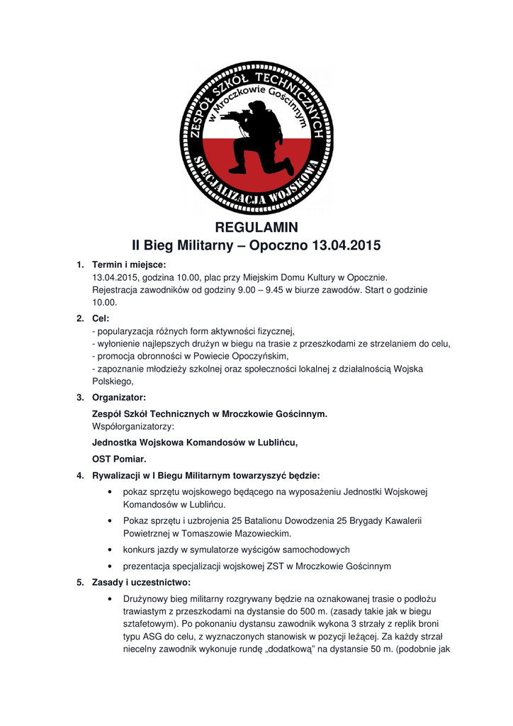 REGULAMIN II Bieg Militarny – Opoczno 13.04.2015 1. Termin i miejsce: 13.04.2015, godzina 10.00, plac przy Miejskim Domu Kultury w Opocznie. Rejestracja zawodników od godziny 9.00 – 9.45 w biurze zawodów. Start o godzinie 10.00. 2. Cel: popularyzacja różnych form aktywności fizycznej, wyłonienie najlepszych drużyn w biegu na trasie z przeszkodami ze strzelaniem do celu, promocja obronności w Powiecie Opoczyńskim, zapoznanie młodzieży szkolnej oraz społeczności lokalnej z działalnością Wojska Polskiego, 3. Organizator: Zespół Szkół Technicznych w Mroczkowie Gościnnym. Współorganizatorzy: Jednostka Wojskowa Komandosów w Lublińcu, OST Pomiar. 4. Rywalizacji w I Biegu Militarnym towarzyszyć będzie: pokaz sprzętu wojskowego będącego na wyposażeniu Jednostki Wojskowej Komandosów w Lublińcu. Pokaz sprzętu i uzbrojenia 25 Batalionu Dowodzenia 25 Brygady Kawalerii Powietrznej w Tomaszowie Mazowieckim. konkurs jazdy w symulatorze wyścigów samochodowych prezentacja specjalizacji wojskowej ZST w Mroczkowie Gościnnym 5. Zasady i uczestnictwo: Drużynowy bieg militarny rozgrywany będzie na oznakowanej trasie o podłożu trawiastym z przeszkodami na dystansie do 500 m. (zasady takie jak w biegu sztafetowym). Po pokonaniu dystansu zawodnik wykona 3 strzały z replik broni typu ASG do celu, z wyznaczonych stanowisk w pozycji leżącej. Za każdy strzał niecelny zawodnik wykonuje rundę „dodatkową” na dystansie 50 m. (podobnie jak w biathlonie). Po zakończeniu rundy następuje zmiana zawodnika poprzez dotknięcie w ramię (zawodnicy biegną bez pałeczek sztafetowych i bez broni). Drużyna składa się z 4 zawodników lub zawodniczek. O wyniku końcowym decyduje suma czasów 4 zawodników. W biegu prowadzony będzie elektroniczny pomiar czasu. Drużyny otrzymają numery startowe z chipem. Zawodnicy mogą startować w strojach sportowych lub w umundurowaniu. Kategorie: I gimnazja dziewczęta, gimnazja chłopcy, rocznik 1999 – 2001 (1416 lat) II open kobiety, open mężczyźni (szkoły ponadgimnazjalne dziewczęta, szkoły ponadgimnazjalne chłopcy, dorośli, drużyny klubowe, instytucje, koleżeńskie). III mundurowe (w kategorii open będzie przeprowadzona również dodatkowa klasyfikacja dla drużyn startujących w umundurowaniu). W biegu mogą startować drużyny szkolne, klubowe, reprezentujące instytucje lub stowarzyszenia. Klasyfikacja prowadzona będzie oddzielnie dla każdej kategorii. Drużyny szkolne i złożone z osób niepełnoletnich startują pod opieką osoby dorosłej. Zawodnicy podczas biegu nie mogą celowo utrudniać pokonywania przeszkód innym zawodnikom. Sędzia główny zawodów może zarządzić dyskwalifikację zawodnika, a co za tym idzie całej drużyny jeżeli zawodnik: celowo doprowadzi do upadku innego zawodnika, nie wykona zadania w całości: skróci trasę, ominie przeszkodę wychodząc poza trasę, nie wykona strzałów do celu, nie wykona odpowiedniej ilości karnych rund w przypadku oddania strzału niecelnego. zgubi numer startowy z chipem co uniemożliwi odczyt czasu przez urządzenie pomiarowe. wykaże się wysoce niesportowym zachowaniem podczas wyścigu oraz w miejscu zawodów. 6. Nagrody: Drużyny za miejsca od I do III w poszczególnych kategoriach otrzymają puchary, za dalsze miejsca dyplomy. 7. Bezpieczeństwo: Drużyny szkolne: opiekunowie posiadają zgody rodziców na udział w zawodach, które przekazują organizatorowi zawodów lub zobowiązani są do ich okazania na prośbę organizatora (wzór zgody rodziców znajduje się na stronie www.zst mroczkow.pl). Strzały do celu będą wykonywane z replik broni typu ASG (plastikowe kulki) z pozycji leżącej na wyznaczonych stanowiskach. Stanowiska o podłożu miękkim (materace). Zawodnik podchodzący do próby strzeleckiej przed przystąpieniem do niej musi założyć okulary ochronne i przyjąć pozycję na stanowisku. Po tych czynnościach instruktor – osoba zabezpieczająca stanowisko podaje zawodnikowi replikę broni i zezwala na oddanie strzału. Po wykonaniu trzech strzałów zawodnik odkłada broń, zdejmuje okulary. Stopień trudności zostanie dostosowany do umiejętności zawodników (wielkość celu i odległość). Każdy z uczestników startuje na własną odpowiedzialność i organizator nie ponosi winy za wypadki oraz zagubione rzeczy osobiste. 8. Zgłoszenia. Organizator prosi o zgłaszanie drużyn pod adresem [email protected] lub tel. 602511900 do dnia poprzedzającego zawody czyli do 12.04.2015, godz. 20.00. Szczegółowe informacje pod podanym nr telefonu (Damian Pietrasik) lub www.zstmroczkow.pl. Służby mundurowe, drużyny strzeleckie, klasy mundurowe szczegółowe info pod nr tel. 609563594 (Paweł Wiktorowicz). 9. Organizator zapewnia: miejsce do przebrania (namioty), w przypadku niekorzystnej aury możliwość przebrania w budynku, wojskową grochówkę, elektroniczny pomiar czasu. 10. Opłaty. Organizator nie pobiera opłaty startowej. 11. Numery startowe. Numery startowe po zakończeniu rywalizacji kierownik/opiekun drużyny oddaje organizatorowi.