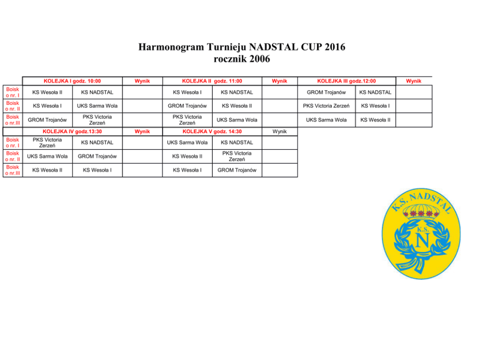 Harmonogram Turnieju NADSTAL CUP 2016 rocznik 2006 KOLEJKA I godz. 10:00 Boisk o nr. I Boisk o nr. II Boisk o nr.III Boisk o nr.III KOLEJKA II godz. 11:00 Wynik KOLEJKA III godz.12:00 KS Wesoła II KS NADSTAL KS Wesoła I KS NADSTAL GROM Trojanów KS NADSTAL KS Wesoła I UKS Sarma Wola GROM Trojanów KS Wesoła II PKS Victoria Zerzeń KS Wesoła I GROM Trojanów PKS Victoria Zerzeń PKS Victoria Zerzeń UKS Sarma Wola UKS Sarma Wola KS Wesoła II KOLEJKA IV godz.13:30 Boisk o nr. I Boisk o nr. II Wynik Wynik KOLEJKA V godz. 14:30 PKS Victoria Zerzeń KS NADSTAL UKS Sarma Wola KS NADSTAL UKS Sarma Wola GROM Trojanów KS Wesoła II PKS Victoria Zerzeń KS Wesoła II KS Wesoła I KS Wesoła I GROM Trojanów Wynik Wynik
