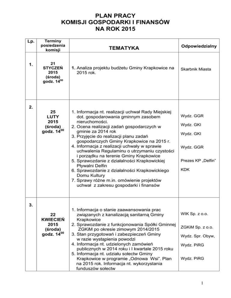 PLAN PRACY KOMISJI GOSPODARKI I FINANSÓW NA ROK 2017