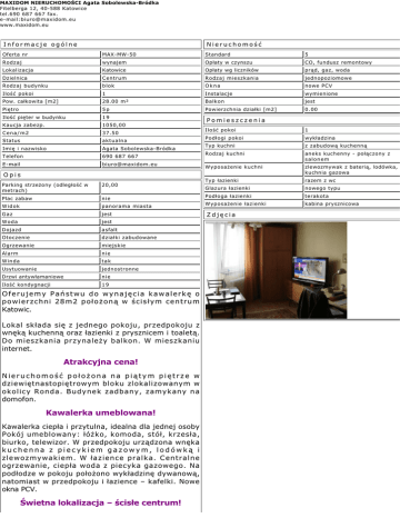 MAXIDOM NIERUCHOMOŚCI Agata Sobolewska-Bródka Fitelberga 12, 40-588 Katowice tel.690 687 667 fax. e-mail:[email protected] www.maxidom.eu Informacje ogólne Nieruchomość Oferta nr MAX-MW-50 Standard 5 Rodzaj wynajem Opłaty w czynszu CO, fundusz remontowy Lokalizacja Katowice Opłaty wg liczników prąd, gaz, woda Dzielnica Centrum Rodzaj mieszkania jednopoziomowe Rodzaj budynku blok Okna nowe PCV Ilość pokoi 1 Instalacje wymienione Pow. całkowita [m2] 28.00 m² Balkon jest Piętro 5p Powierzchnia działki [m2] 0.00 Ilość pięter w budynku 19 Kaucja zabezp. 1050,00 Cena/m2 37.50 Pomieszczenia Ilość pokoi 1 Podłogi pokoi wykładzina Typ kuchni z zabudową kuchenną Rodzaj kuchni aneks kuchenny - połączony z salonem Wyposażenie kuchni zlewozmywak z baterią, lodówka, kuchnia gazowa Typ łazienki razem z wc Glazura łazienki nowego typu nie Podłoga łazienki terakota Widok panorama miasta Wyposażenie łazienki kabina prysznicowa Gaz jest Zdjęcia Woda jest Dojazd asfalt Otoczenie działki zabudowane Ogrzewanie miejskie Alarm nie Winda tak Usytuowanie jednostronne Drzwi antywłamaniowe nie Ilość kondygnacji 19 Status aktualna Imię i nazwisko Agata Sobolewska-Bródka Telefon 690 687 667 E-mail [email protected] Opis Parking strzeżony (odległość w metrach) Plac zabaw 20,00 Oferujemy Państwu do wynajęcia kawalerkę o powierzchni 28m2 położoną w ścisłym centrum Katowic. Lokal składa się z jednego pokoju, przedpokoju z wnęką kuchenną oraz łazienki z prysznicem i toaletą. Do mieszkania przynależy balkon. W mieszkaniu internet. Atrakcyjna cena! Nieruchomość położona na piątym piętrze w dziewiętnastopiętrowym bloku zlokalizowanym w okolicy Ronda. Budynek zadbany, zamykany na domofon. Kawalerka umeblowana! Kawalerka ciepła i przytulna, idealna dla jednej osoby Pokój umeblowany: łóżko, komoda, stół, krzesła, biurko, telewizor. W przedpokoju urządzona wnęka kuchenna z piecykiem gazowym, lodówką i zlewozmywakiem. W łazience pralka. Centralne ogrzewanie, ciepła woda z piecyka gazowego. Na podłodze w pokoju położono wykładzinę dywanową, natomiast w przedpokoju i łazience – kafelki. Nowe okna PCV. Świetna lokalizacja – ścisłe centrum! Bardzo dogodna lokalizacja, ścisłe centrum miasta, zaraz przy Rondzie, 3 min. piechotą do rynku. W bezpośrednim sąsiedztwie znajdują się sklepy, punkty usługowe, przystanki komunikacji miejskiej. Doskonałe połączenie komunikacyjne z głównymi arteriami Śląska, co jest dużym ułatwieniem dla osób zmotoryzowanych. Czynsz najmu wynosi 1050zł miesięcznie p l u s media wg zużycia oraz wywóz śmieci. Kaucja zwrotna wynosi 1050zł. Dziękujemy za zainteresowanie i zapraszamy do oglądania! Opis nieruchomości zestawiono na podstawie wypowiedzi lub dokumentacji przedstawionej przez Właściciela i nie ponosimy odpowiedzialności za jego prawdziwość, kompletność i aktualność. Wszelkie podane w niniejszym ogłoszeniu informacje nie stanowią oferty handlowej w rozumieniu Kodeksu Cywilnego. © Wszelkie prawa zastrzeżone - Maxidom