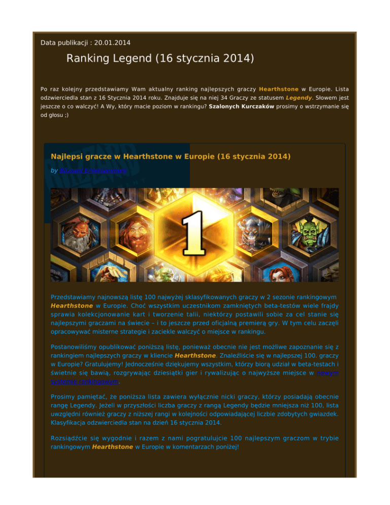 Data publikacji : 20.01.2014 Ranking Legend (16 stycznia 2014) Po raz kolejny przedstawiamy Wam aktualny ranking najlepszych graczy Hearthstone w Europie. Lista odzwierciedla stan z 16 Stycznia 2014 roku. Znajduje się na niej 34 Graczy ze statusem Legendy. Słowem jest jeszcze o co walczyć! A Wy, który macie poziom w rankingu? Szalonych Kurczaków prosimy o wstrzymanie się od głosu ;) Najlepsi gracze w Hearthstone w Europie (16 stycznia 2014) by Blizzard Entertainment Przedstawiamy najnowszą listę 100 najwyżej sklasyfikowanych graczy w 2 sezonie rankingowym Hearthstone w Europie. Choć wszystkim uczestnikom zamkniętych beta-testów wiele frajdy sprawia kolekcjonowanie kart i tworzenie talii, niektórzy postawili sobie za cel stanie się najlepszymi graczami na świecie – i to jeszcze przed oficjalną premierą gry. W tym celu zaczęli opracowywać misterne strategie i zaciekle walczyć o miejsce w rankingu. Postanowiliśmy opublikować poniższą listę, ponieważ obecnie nie jest możliwe zapoznanie się z rankingiem najlepszych graczy w kliencie Hearthstone. Znaleźliście się w najlepszej 100. graczy w Europie? Gratulujemy! Jednocześnie dziękujemy wszystkim, którzy biorą udział w beta-testach i świetnie się bawią, rozgrywając dziesiątki gier i rywalizując o najwyższe miejsce w nowym systemie rankingowym. Prosimy pamiętać, że poniższa lista zawiera wyłącznie nicki graczy, którzy posiadają obecnie rangę Legendy. Jeżeli w przyszłości liczba graczy z rangą Legendy będzie mniejsza niż 100, lista uwzględni również graczy z niższej rangi w kolejności odpowiadającej liczbie zdobytych gwiazdek. Klasyfikacja odzwierciedla stan na dzień 16 stycznia 2014. Rozsiądźcie się wygodnie i razem z nami pogratulujcie 100 najlepszym graczom w trybie rankingowym Hearthstone w Europie w komentarzach poniżej! Miejsce w rankingu 1 2 3 4 5 6 7 8 9 10 11 12 13 14 15 16 17 18 19 20 21 22 23 24 25 26 27 28 29 30 31 32 33 34 35 36 37 38 39 40 41 42 43 44 45 46 47 48 49 50 BattleTag Kalle Guldor Ekop Honesty Necx Yliajo TikkiTavi Mats Neirea Accu Wampie Blooddragon Desis NabUttE Olinho vanistar SensoR Milan Kerber Arkanishu KrzyKillz TheEnclase Dotzgie Portex Darkwonyx FoxTheFeared balooni Kolento abzeror Nylaxina Lifecoach Garrickz Skip Marschak Thalai Stylo Relix PewQ Cipher f17antonio Pheldda basilis Lockas Shyntil I3luefox Xixo Iron ThePet ManuS Thaiboy Ranga L L L L L L L L L L L L L L L L L L L L L L L L L L L L L L L L L L 1 1 1 1 1 1 2 2 2 2 2 2 2 2 2 2 Miejsce w rankingu 51 52 53 54 55 56 57 58 59 60 61 62 63 64 65 66 67 68 69 70 71 72 73 74 75 76 77 78 79 80 81 82 83 84 85 86 87 88 89 90 91 92 93 94 95 96 97 98 99 100 BattleTag Skunkzy jussius JIsOrange P4wnyhof CoolGer Bestmarmotte Loriel Madrac00n Onespin Kreng03 hideki LeMonkeyFace Vuraz Zolano Predi RisingSun xinfyz Xeley WaRHaMeR Segismundo Sarkhan Azami cRuNk Dodje Spiritedaway Pemmin mkr olimp Sienestaja Broccoli Gnimsh Ozm0dia Upshot Style Ostkaka TheKossu Asharita Serpid Blew86 Slimmy Kaor Cassie julsn Konfu Abraham DiZ MaxApes teuaria Varaghar Joefernandes Ranga 2 2 2 2 2 2 2 3 3 3 3 3 3 3 3 3 3 3 3 3 3 3 3 3 3 3 3 3 3 3 3 3 3 3 3 3 3 3 3 3 3 3 3 3 3 4 4 4 4 4 Źródło: Battle.net Autor: Ch3rry Liczba wyświetleń strony: 2000 Data publikacji : 20.01.2014 Tagi: ranking, Legendy Komentarz (0) dodaj komentarz Brak komentarzy dodaj komentarz Pozostałe nowości Nowy bohater w Hearthstone - Lady Liadrin Blizzard postanowił zaskoczyć wszystkich udostępniając nowego bohatera do Hearthstone, którego zdobyć można grając w World of Warcraft. Nie macie się jednak co martwić, wystarczy zdobyć jedynie 20 poziom w popularnym MMO, aby Lady Liadrin zajęła miejsce Uthera jako paladyn w grze.Data publikacji: 15.03.20160 Zapowiedź nowości w Hearthstone Jeśli to co dzieje się w Hearthstone zaczynało was powoli nudzić, to mamy dobre informacje. Już wkrótce do gry zostanie wprowadzonych szeerg zmian, które odświeżą rozgrywkę w karczmie.Data publikacji: 02.02.20160 Nadchodzi Zimowa Uczta W zapowiedzi najnowszej aktualizacji pojawiła się wzmianka na temat Zimowej Uczty, która wkrótce ma rozpocząć się w Hearthstone. Dziś Blizzard ujawnia pierwsze niespodzianki związane z tym wydarzeniem.Data publikacji: 09.12.20150 Liga Odkrywców dostępna w aktualizacji 4.0 Najnowsza aktualizacja do Hearthstone wprowadza przygodę Liga Odkrywców, kilka nowych rewersów do kart oraz naprawia niewielką ilość błędów w grze. Więcej informacji znajdziecie w rozwinięciu newsa.Data publikacji: 12.11.20150 BlizzCon 2015 - karty z Ligi Odkrywców Na łamach serwisu HearthPwn pojawiły się wszystkie karty, które będą dostępne w przygodzie Liga Odkrywców - wygląda na to, że będą mogły sporo namieszać w karczmie Hearthstone.Data publikacji: 07.11.20150 Wszystkie nowości
