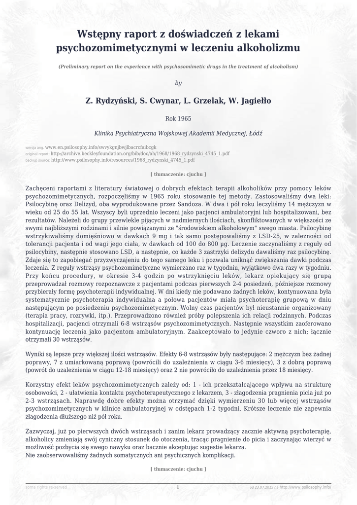Wstępny raport z doświadczeń z lekami psychozomimetycznymi w leczeniu alkoholizmu (Preliminary report on the experience with psychosomimetic drugs in the treatment of alcoholism) by Z. Rydzyński, S. Cwynar, L. Grzelak, W. Jagiełło Rok 1965 Klinika Psychiatryczna Wojskowej Akademii Medycznej, Łódź wersja ang. www.en.psilosophy.info/swvykgnjbwjlbacrcfaibcgk original report: http://archive.beckleyfoundation.org/bib/doc/ah/1968/1968_rydzynski_4745_1.pdf backup source: http://www.psilosophy.info/resources/1968_rydzynski_4745_1.pdf [ tłumaczenie: cjuchu ] Zachęceni raportami z literatury światowej o dobrych efektach terapii alkoholików przy pomocy leków psychozomimetycznych, rozpoczęliśmy w 1965 roku stosowanie tej metody. Zastosowaliśmy dwa leki: Psilocybinę oraz Delizyd, oba wyprodukowane przez Sandoza. W dwa i pół roku leczyliśmy 14 mężczyzn w wieku od 25 do 55 lat. Wszyscy byli uprzednio leczeni jako pacjenci ambulatoryjni lub hospitalizowani, bez rezultatów. Należeli do grupy przewlekle pijących w nadmiernych ilościach, skonfliktowanych w większości ze swymi najbliższymi rodzinami i silnie powiązanymi ze "środowiskiem alkoholowym" swego miasta. Psilocybinę wstrzykiwaliśmy domięśniowo w dawkach 9 mg i tak samo postępowaliśmy z LSD-25, w zależności od tolerancji pacjenta i od wagi jego ciała, w dawkach od 100 do 800 µg. Leczenie zaczynaliśmy z reguły od psilocybiny, następnie stosowano LSD, a następnie, co każde 3 zastrzyki delizydu dawaliśmy raz psilocybinę. Zdaje się to zapobiegać przyzwyczajeniu do tego samego leku i pozwala uniknąć zwiększania dawki podczas leczenia. Z reguły wstrząsy psychozomimetyczne wymierzano raz w tygodniu, wyjątkowo dwa razy w tygodniu. Przy końcu procedury, w okresie 3-4 godzin po wstrzyknięciu leków, lekarz opiekujący się grupą przeprowadzał rozmowy rozpoznawcze z pacjentami podczas pierwszych 2-4 posiedzeń, późniejsze rozmowy przybierały formę psychoterapii indywidualnej. W dni kiedy nie podawano żadnych leków, kontynuowana była systematycznie psychoterapia indywidualna a połowa pacjentów miała psychoterapię grupową w dniu następującym po posiedzeniu psychozomimetycznym. Wolny czas pacjentów był nieustannie organizowany (terapia pracy, rozrywki, itp.). Przeprowadzono również próby polepszenia ich relacji rodzinnych. Podczas hospitalizacji, pacjenci otrzymali 6-8 wstrząsów psychozomimetycznych. Następnie wszystkim zaoferowano kontynuację leczenia jako pacjentom ambulatoryjnym. Zaakceptowało to jedynie czworo z nich; łącznie otrzymali 30 wstrząsów. Wyniki są lepsze przy większej ilości wstrząsów. Efekty 6-8 wstrząsów były następujące: 2 mężczyzn bez żadnej poprawy, 7 z umiarkowaną poprawą (powrócili do uzależnienia w ciągu 3-6 miesięcy), 3 z dobrą poprawą (powrót do uzależnienia w ciągu 12-18 miesięcy) oraz 2 nie powróciło do uzależnienia przez 18 miesięcy. Korzystny efekt leków psychozomimetycznych zależy od: 1 - ich przekształcającego wpływu na strukturę osobowości, 2 - ułatwienia kontaktu psychoterapeutycznego z lekarzem, 3 - złagodzenia pragnienia picia już po 2-3 wstrząsach. Naprawdę dobre efekty można otrzymać dzięki wymierzeniu 30 lub więcej wstrząsów psychozomimetycznych w klinice ambulatoryjnej w odstępach 1-2 tygodni. Krótsze leczenie nie zapewnia złagodzenia dłuższego niż pół roku. Zazwyczaj, już po pierwszych dwóch wstrząsach i zanim lekarz prowadzący zacznie aktywną psychoterapię, alkoholicy zmieniają swój cyniczny stosunek do otoczenia, tracąc pragnienie do picia i zaczynając wierzyć w możliwość pozbycia się swego nawyku oraz bacznie akceptując sugestie lekarza. Nie zaobserwowaliśmy żadnych somatycznych ani psychicznych komplikacji. [ tłumaczenie: cjuchu ] soma rights re-served 1 od 23.07.2015 na http://www.psilosophy.info/