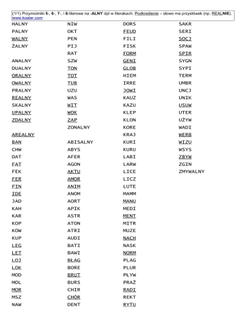 (1/1) Przymiotniki 5-, 6-, 7-, i 8-literowe na -ALNY dpl w literakach. Podkreślenie – słowo ma przysłówek (np. REALNIE). www.koalar.com HALNY PALNY WALNY ŻALNY ANALNY DUALNY ORALNY OWALNY PRALNY REALNY SKALNY UPALNY ZDALNY AREALNY BAN CHW DAT FAT FEK FER FIN IDE JAD KAH KAR KOP KOW KUP LEG LET LOJ LOK MOD MOL MOR MSZ NAW NIW OKT PEN PIJ RAT SZW TON TOT TUB UZU WAS WIT WOK ZAP ZONALNY ABISALNY ABYS AFER AGON AKTU AMOR ANIM ANOM AORT APIK ASTR ATON ATRI AUDI BATI BAWI BŁAG BORE BRUT BURS CHIR CHÓR DENT DORS FEUD FILI FISK FORM GENI GLOB HIEM IRRE JOWI KAUZ KAZU KLEP KLON KORE KRAJ KURI KURU LABI LARW LICE LICZ LUTE MAMM MANU MEDI MENT MITR MUZE NACH NASK NORM PLAG PLUR PŁYW PRAŻ RADI REKT RYTU SAKR SERI SOCJ SPAW SPIR SYGN SYPI TERM UMBR UNCJ UNIK USUW UTER UŻYW WADI WERB WIZU WSYS ZBYW ZGIN ZMYWALNY