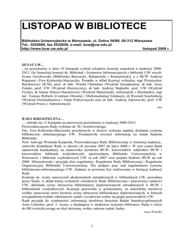 LISTOPAD W BIBLIOTECE Biblioteka Uniwersytecka w Warszawie, ul. Dobra 56/66, 00-312 Warszawa Tel.: 5525660, fax 5525659, e-mail: [email protected] http://www.buw.uw.edu.pl listopad 2008 r. SENAT UW... ...na posiedzeniu w dniu 19 listopada wybrał członków komisji senackich w kadencji 20082012. Do Senackiej komisji ds. Bibliotek i Systemów Informacyjnych z bibliotek UW weszli: Iwona Grzybowska (Biblioteka Iberystyki, Italianistyki i Romanistyki), a z BUW Andrzej Regmunt i Ewa Kobierska-Maciuszko. Ponadto w skład Komisji wchodzą: mgr Przemysław Baszkiewicz (ICM), prof. dr hab. Witold Chmielarz (Wydział Zarządzania), dr hab. Jerzy Franke, prof. UW (Wydział Historyczny), dr hab. Andrzej Majhofer, prof. UW (Wydział Fizyki), dr Janina Mincer-Daszkiewicz (Wydział Matematyki, Informatyki i Mechaniki), mgr inŜ. Tomasz Rybicki (Centrum Otwartej i Multimedialnej Edukacji), dr Ryszard Szarfenberg (Wydział Dziennikarstwa i Nauk Politycznych) oraz dr hab. Andrzej Zakrzewski, prof. UW (Wydział Prawa i Administracji). ekm RADA BIBLIOTECZNA… … zebrała się 13 listopada na pierwszym posiedzeniu w kadencji 2008-2012. Przewodniczącym Rady wybrano dr. M. Grochowskiego. Dyr. Ewa Kobierska-Maciuszko przedstawiła w skrócie wybrane aspekty działania systemu biblioteczno informacyjnego UW. Przedstawiła równieŜ informację na temat budŜetu Biblioteki. Prof. Jadwiga Woźniak-Kasperek, Przewodnicząca Rady Bibliotecznej w minionej kadencji,. omówiła działalność Rady w okresie od stycznia 2007 do lipca 2008 r. W tym czasie Rada opiniowała kandydatury na stanowiska dyrektora BUW, kierowników oddziałów BUW i kierowników bibliotek wydziałowych; sprawozdanie Biblioteki Uniwersyteckiej w Warszawie i bibliotek wydziałowych UW za rok 2007 oraz projekt budŜetu BUW na rok 2008. Sformułowała i przyjęła dwa regulaminy: Regulamin Rady Bibliotecznej i Regulamin Organizacyjny Biblioteki Uniwersyteckiej. Nie podjęto prac nad regulaminem systemu biblioteczno-informacyjnego UW. Zadanie to powinno być realizowane w bieŜącej kadencji Rady. Komisja ds. oceny nauczycieli akademickich zatrudnionych w bibliotekach UW, powołana przez Senat, w skład której wchodzili członkowie Rady Bibliotecznej i pracownicy naukowi UW, dokonała oceny okresowej bibliotekarzy dyplomowanych zatrudnionych w BUW i bibliotekach wydziałowych. Komisja pracowała w przekonaniu, Ŝe naleŜałoby moŜliwie szybko opracować nowe kryteria oceny okresowej bibliotekarzy dyplomowanych, w których uwzględniona byłaby odmienność zadań i oczekiwań wobec tej grupy pracowników UW. Rada przyjęła do wiadomości informację dyrektora Instytutu Badań Interdyscyplinarnych Artes Liberales, prof. J. Axera, o działającej w strukturze instytutu bibliotece. Rada w liście do IBI zwróciła uwagę na zbyt skromną, wobec zakresu zadań, kadrę. Anna Wołodko 1 MONUMENTA UNIVERSITATIS VARSOVIENSIS (MUV) A BUW 17 listopada dyr. Ewa Kobierska-Maciuszko wzięła udział w posiedzeniu Rady Wydawniczej wydawnictwa jubileuszowego UW przygotowywanego pod kierunkiem prof. Wojciecha Tygielskiego. Celem spotkania było omówienie udziału i wkładu BUW w jubileusz 200-lecia UW. Zaakceptowano wstępnie propozycję 3-częściowego wydawnictwa: 1) Słownik/leksykon/encyklopedia BUW – historia i współczesność BUW w formie haseł przedmiotowych i osobowych z dołączonym wstępem historycznym i kalendarium. 2) Najcenniejsze zabytki w kolekcjach historycznych BUW. 3) Źródła do dziejów UW w zbiorach jego Biblioteki – bibliografia adnotowana/katalog. Czwartym, niezaleŜnym od tych trzech, choć włączonym w serię tomem, będzie monografia Gabinetu Rycin BUW przygotowana przez zespół pracowników Gabinetu. ekm ŚWIĘTO UW W dniach 14-28 listopada w sali wystawowej Biblioteki Uniwersyteckiej w Warszawie prezentowana była wystawa Fundacja Uniwersytetu Warszawskiego 1988-2008, podsumowująca dwudziestolecie jednej z najwaŜniejszych instytucji wspomagających naszą Uczelnię. Dokumenty, wycinki prasowe i zdjęcia ukazywały m.in. trudne pierwsze lata działalności Fundacji UW, historię budowy kompleksu BUW i innych inwestycji, a takŜe zorganizowane dzięki wsparciu Fundacji konferencje, publikacje, koncerty i wystawy. Wystawę odwiedziła takŜe Jej Magnificencja Rektor UW, prof. Katarzyna ChałasińskaMacukow – stało się to 18 listopada, przy okazji uroczystego odsłonięcia tablicy w budynku BUW, upamiętniającej wkład Fundacji UW w budowę uniwersyteckiej ksiąŜnicy. Piotr Bocian, Biuro Promocji UW 20 listopada odbyła się prezentacja fragmentu spuścizny prof. Bogdana Czaykowskiego (poety, tłumacza, literaturoznawcy), którą zgodnie z jego testamentem Gabinet Rękopisów przejmuje partiami od lipca 2007 r. Osobą upowaŜnioną do realizacji testamentu jest BoŜena Karwowska, prof. slawistyki na Uniwersytecie w Vancouver. Z panią Profesor współpracujemy obecnie przy opracowywaniu materiałów, a w niedalekiej przyszłości konsultować będziemy sprawę sporządzenia formy wtórnej całości zespołu i przekazania do bibliotek w Kanadzie celem umoŜliwienia prowadzenia badań takŜe w tamtym środowisku naukowym. Korzystając z kilkudniowego pobytu prof. Karwowskiej w Polsce udało się zorganizować towarzyszący prezentacji wykład poświęcony osobie Czaykowskiego, a takŜe Ŝyciu artystyczno-literackiemu Polonii kanadyjskiej. Wykład był oparty na wspomnieniach osobistych, a takŜe wzbogacony krótkim filmem – nagraniem B. Czaykowskiego czytającego swoje wiersze. Spuścizna, obejmująca ok. 1200 listów, papiery archiwalne „Merkuriusza” i „Kontynentów”, a takŜe materiały związane z twórczością literacką i translatorską, zaprezentowana została w 4 gablotach. I. Niewątpliwie jednym z najciekawszych zespołów listów jest nigdy dotąd niepublikowana korespondencja z Jerzym Giedroyciem, prowadzona od 1955 aŜ do śmierci Redaktora w 2000 r. Giedroyc od momentu poznania młodego student