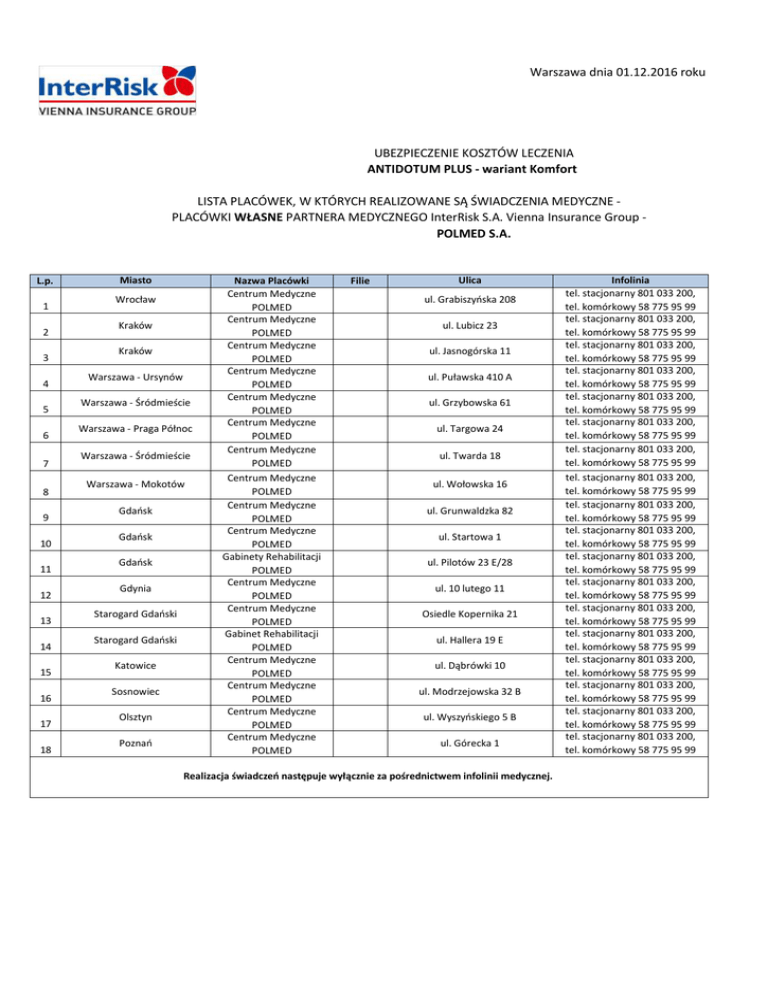 Warszawa dnia 01.12.2016 roku UBEZPIECZENIE KOSZTÓW LECZENIA ANTIDOTUM PLUS - wariant Komfort LISTA PLACÓWEK, W KTÓRYCH REALIZOWANE SĄ ŚWIADCZENIA MEDYCZNE PLACÓWKI WŁASNE PARTNERA MEDYCZNEGO InterRisk S.A. Vienna Insurance Group POLMED S.A. L.p. 1 2 3 4 5 6 7 8 9 10 11 12 13 14 15 16 17 18 Miasto Wrocław Kraków Kraków Warszawa - Ursynów Warszawa - Śródmieście Warszawa - Praga Północ Warszawa - Śródmieście Warszawa - Mokotów Gdańsk Gdańsk Gdańsk Gdynia Starogard Gdański Starogard Gdański Katowice Sosnowiec Olsztyn Poznań Nazwa Placówki Centrum Medyczne POLMED Centrum Medyczne POLMED Centrum Medyczne POLMED Centrum Medyczne POLMED Centrum Medyczne POLMED Centrum Medyczne POLMED Centrum Medyczne POLMED Centrum Medyczne POLMED Centrum Medyczne POLMED Centrum Medyczne POLMED Gabinety Rehabilitacji POLMED Centrum Medyczne POLMED Centrum Medyczne POLMED Gabinet Rehabilitacji POLMED Centrum Medyczne POLMED Centrum Medyczne POLMED Centrum Medyczne POLMED Centrum Medyczne POLMED Filie Ulica ul. Grabiszyńska 208 ul. Lubicz 23 ul. Jasnogórska 11 ul. Puławska 410 A ul. Grzybowska 61 ul. Targowa 24 ul. Twarda 18 ul. Wołowska 16 ul. Grunwaldzka 82 ul. Startowa 1 ul. Pilotów 23 E/28 ul. 10 lutego 11 Osiedle Kopernika 21 ul. Hallera 19 E ul. Dąbrówki 10 ul. Modrzejowska 32 B ul. Wyszyńskiego 5 B ul. Górecka 1 Realizacja świadczeń następuje wyłącznie za pośrednictwem infolinii medycznej. Infolinia tel. stacjonarny 801 033 200, tel. komórkowy 58 775 95 99 tel. stacjonarny 801 033 200, tel. komórkowy 58 775 95 99 tel. stacjonarny 801 033 200, tel. komórkowy 58 775 95 99 tel. stacjonarny 801 033 200, tel. komórkowy 58 775 95 99 tel. stacjonarny 801 033 200, tel. komórkowy 58 775 95 99 tel. stacjonarny 801 033 200, tel. komórkowy 58 775 95 99 tel. stacjonarny 801 033 200, tel. komórkowy 58 775 95 99 tel. stacjonarny 801 033 200, tel. komórkowy 58 775 95 99 tel. stacjonarny 801 033 200, tel. komórkowy 58 775 95 99 tel. stacjonarny 801 033 200, tel. komórkowy 58 775 95 99 tel. stacjonarny 801 033 200, tel. komórkowy 58 775 95 99 tel. stacjonarny 801 033 200, tel. komórkowy 58 775 95 99 tel. stacjonarny 801 033 200, tel. komórkowy 58 775 95 99 tel. stacjonarny 801 033 200, tel. komórkowy 58 775 95 99 tel. stacjonarny 801 033 200, tel. komórkowy 58 775 95 99 tel. stacjonarny 801 033 200, tel. komórkowy 58 775 95 99 tel. stacjonarny 801 033 200, tel. komórkowy 58 775 95 99 tel. stacjonarny 801 033 200, tel. komórkowy 58 775 95 99