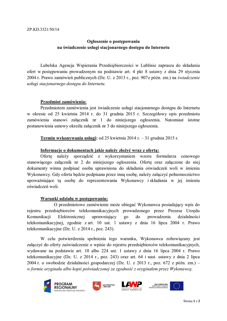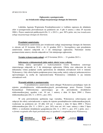 ZP.KD.3321/50/14 Ogłoszenie o postępowaniu na świadczenie usługi stacjonarnego dostępu do Internetu Lubelska Agencja Wspierania Przedsiębiorczości w Lublinie zaprasza do składania ofert w postępowaniu prowadzonym na podstawie art. 4 pkt 8 ustawy z dnia 29 stycznia 2004 r. Prawo zamówień publicznych (Dz. U. z 2013 r., poz. 907z późn. zm.) na świadczenie usługi stacjonarnego dostępu do Internetu. Przedmiot zamówienia: Przedmiotem zamówienia jest świadczenie usługi stacjonarnego dostępu do Internetu w okresie od 25 kwietnia 2014 r. do 31 grudnia 2015 r. Szczegółowy opis przedmiotu zamówienia stanowi załącznik nr 1 do niniejszego ogłoszenia. Natomiast istotne postanowienia umowy określa załącznik nr 3 do niniejszego ogłoszenia. Termin wykonywania usługi: od 25 kwietnia 2014 r. – 31 grudnia 2015 r. Informacje o dokumentach jakie należy złożyć wraz z ofertą: Ofertę należy sporządzić z wykorzystaniem wzoru formularza cenowego stanowiącego załącznik nr 2 do niniejszego ogłoszenia. Ofertę oraz załączone do niej dokumenty winna podpisać osoba uprawniona do składania oświadczeń woli w imieniu Wykonawcy. Gdy oferta będzie podpisana przez inną osobę, należy załączyć pełnomocnictwo upoważniające tą osobę do reprezentowania Wykonawcy i składania w jej imieniu oświadczeń woli. Warunki udziału w postępowaniu: O przedmiotowe zamówienie może ubiegać Wykonawca posiadający wpis do rejestru przedsiębiorców telekomunikacyjnych prowadzonego przez Prezesa Urzędu Komunikacji Elektronicznej uprawniający go do prowadzenia działalności telekomunikacyjnej, zgodnie z art. 10 ust. 1 ustawy z dnia 16 lipca 2004 r. Prawo telekomunikacyjne (Dz. U. z 2014 r., poz. 243). W celu potwierdzenia spełnienia tego warunku, Wykonawca zobowiązany jest załączyć do oferty zaświadczenie o wpisie do rejestru przedsiębiorców telekomunikacyjnych, wydawane na podstawie art. 10 albo 224 ust. 1 ustawy z dnia 16 lipca 2004 r. Prawo telekomunikacyjne (Dz. U. z 2014 r., poz. 243) oraz art. 64 i nast. ustawy z dnia 2 lipca 2004 r. o swobodzie działalności gospodarczej (Dz. U. z 2013 r., poz. 672 z późn. zm.) – w formie oryginału albo kopii poświadczonej za zgodność z oryginałem przez Wykonawcę. Strona 1 z 2 Kryteria wyboru oferty: Zamawiający wybierze ofertę najkorzystniejszą spośród ofert Wykonawców, którzy wykażą się spełnianiem warunku udziału w niniejszym postępowaniu. Przy wyborze oferty zostanie zastosowane kryterium 100% cena oferty. Termin oraz sposób złożenia oferty: 1) ofertę należy złożyć do dnia 4 kwietnia 2014 r. do godz. 1530 (oferty złożone po tym terminie nie będą rozpatrywane); 2) ofertę można złożyć według wyboru: a) za pośrednictwem poczty elektronicznej (e-mail: [email protected]), b) pocztą (adres: Lubelska Agencja Wspierania Przedsiębiorczości w Lublinie, ul. Wojciechowska 9a, 20-704 Lublin), c) osobiście w Kancelarii Ogólnej LAWP w Lublinie (adres jw.) 3) w przypadku składania oferty w sposób określony w pkt 2 lit. b lub lit. c, ofertę należy złożyć w kopercie (lub inny sposób uniemożliwiający zdekompletowanie składanych dokumentów), którą należy opisać: (nazwa i adres Wykonawcy) „Oferta w postępowaniu prowadzonym na podstawie art. 4 pkt 8 ustawy z dnia 29 stycznia 2004 r. Prawo zamówień publicznych na „świadczenie usługi stacjonarnego dostępu do Internetu”. Dostarczyć do 4 kwietnia 2014 r. do godz. 15.30, do Kancelarii Ogólnej LAWP w Lublinie, ul. Wojciechowska 9a, 20-704 Lublin”. Informacja o wyborze oferty: O wyborze najkorzystniejszej oferty, Zamawiający poinformuje Wykonawców, którzy złożyli oferty za pomocą poczty elektronicznej e-mail (na adres wskazany w ofercie). Załączniki: 1) opis przedmiotu zamówienia – załącznik nr 1 do ogłoszenia; 2) wzór formularza cenowego – załącznik nr 2 do ogłoszenia; 3) istotne postanowienia umowy – załącznik nr 3 do ogłoszenia. Osoba do kontaktu: Pan Szymon Sułkowski (tel. 81 46 23 888). Strona 2 z 2