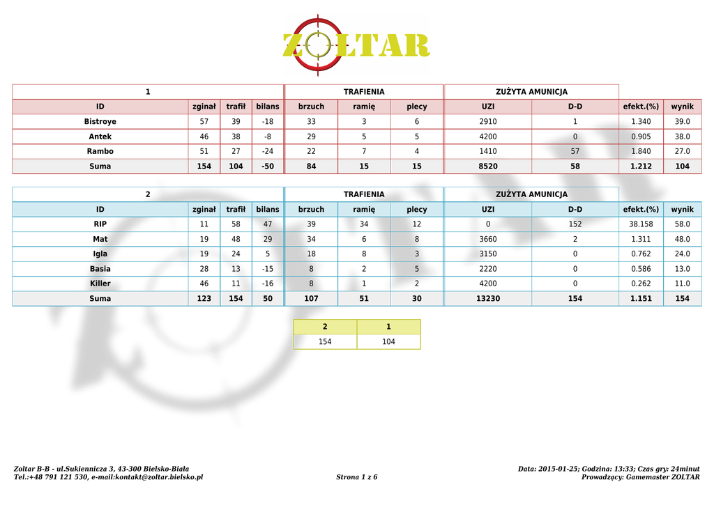 1 TRAFIENIA ZUŻYTA AMUNICJA ID zginał trafił bilans brzuch ramię plecy UZI D-D efekt.(%) wynik Bistroye 57 39 -18 33 3 6 2910 1 1.340 39.0 Antek 46 38 -8 29 5 5 4200 0 0.905 38.0 Rambo 51 27 -24 22 7 4 1410 57 1.840 27.0 Suma 154 104 -50 84 15 15 8520 58 1.212 104 2 TRAFIENIA ZUŻYTA AMUNICJA ID zginał trafił bilans brzuch ramię plecy UZI D-D efekt.(%) wynik RIP 11 58 47 39 34 12 0 152 38.158 58.0 Mat 19 48 29 34 6 8 3660 2 1.311 48.0 Igla 19 24 5 18 8 3 3150 0 0.762 24.0 Basia 28 13 -15 8 2 5 2220 0 0.586 13.0 Killer 46 11 -16 8 1 2 4200 0 0.262 11.0 Suma 123 154 50 107 51 30 13230 154 1.151 154 Zoltar B-B - ul.Sukiennicza 3, 43-300 Bielsko-Biała Tel.:+48 791 121 530, e-mail:[email protected] 2 1 154 104 Strona 1 z 6 Data: 2015-01-25; Godzina: 13:33; Czas gry: 24minut Prowadzący: Gamemaster ZOLTAR 1 TRAFIENIA ZUŻYTA AMUNICJA ID zginał trafił bilans brzuch ramię plecy UZI D-D efekt.(%) wynik Antek 27 44 17 34 6 8 3660 1 1.202 44.0 Bistroye 57 31 -26 24 2 7 1710 9 1.803 31.0 Rambo 37 30 -6 22 10 5 2340 47 1.257 30.0 Suma 121 105 -15 80 18 20 7710 57 1.352 105 2 TRAFIENIA ZUŻYTA AMUNICJA ID zginał trafił bilans brzuch ramię plecy UZI D-D efekt.(%) wynik Mat 19 50 31 46 3 1 3660 2 1.365 50.0 RIP 12 34 22 29 16 1 630 58 4.942 34.0 Igla 24 18 -6 11 13 0 1560 59 1.112 18.0 + 27 12 -15 9 4 1 1050 0 1.143 12.0 Basia 23 6 -17 4 1 2 1620 0 0.370 6.0 Suma 105 120 15 99 37 5 8520 119 1.389 120 Zoltar B-B - ul.Sukiennicza 3, 43-300 Bielsko-Biała Tel.:+48 791 121 530, e-mail:[email protected] 2 1 120 105 Strona 2 z 6 Data: 2015-01-25; Godzina: 12:41; Czas gry: 25minut Prowadzący: Gamemaster ZOLTAR Drużyny Miejsce Nazwa Zoltar B-B - ul.Sukiennicza 3, 43-300 Bielsko-Biała Tel.:+48 791 121 530, e-mail:[email protected] Rozgrywki 1 2 Suma 2 154 120 274 1 104 105 209 Strona 3 z 6 Data: 2015-01-25 Prowadzący: Gamemaster ZOLTAR Zestawienie wg wyniku Miejsce TRAFIENIA ZUŻYTA AMUNICJA ID zginał trafił bilans brzuch ramię plecy UZI D-D efekt.(%) wynik Mat 46.55 120.00 73.45 97.70 11.10 11.20 8967.00 4.90 1.338 120.00 RIP 28.15 113.30 85.15 83.55 61.70 16.20 756.00 259.60 11.156 113.30 Antek 89.90 100.30 10.40 77.05 13.45 15.85 9642.00 1.20 1.040 100.30 4 Bistroye 139.65 85.95 -53.70 70.05 6.15 15.90 5689.50 12.05 1.507 85.95 5 Rambo 108.15 69.75 -38.40 53.90 20.75 11.00 4570.50 127.65 1.485 69.75 6 Igla 52.55 51.60 -0.95 35.70 25.60 3.75 5809.50 70.80 0.878 51.60 7 + 64.80 28.80 -36.00 21.60 9.60 2.40 2520.00 0.00 1.143 28.80 8 Killer 115.00 27.50 -87.50 20.00 2.50 5.00 10500.00 0.00 0.262 27.50 9 Basia 62.60 23.45 -39.15 14.80 3.70 8.65 4719.00 0.00 0.497 23.45 Zoltar B-B - ul.Sukiennicza 3, 43-300 Bielsko-Biała Tel.:+48 791 121 530, e-mail:[email protected] Strona 4 z 6 Data: 2015-01-25 Prowadzący: Gamemaster ZOLTAR Zestawienie wg bilansu Miejsce TRAFIENIA ZUŻYTA AMUNICJA ID zginał trafił bilans brzuch ramię plecy UZI D-D efekt.(%) wynik RIP 28.15 113.30 85.15 83.55 61.70 16.20 756.00 259.60 11.156 113.30 Mat 46.55 120.00 73.45 97.70 11.10 11.20 8967.00 4.90 1.338 120.00 Antek 89.90 100.30 10.40 77.05 13.45 15.85 9642.00 1.20 1.040 100.30 4 Igla 52.55 51.60 -0.95 35.70 25.60 3.75 5809.50 70.80 0.878 51.60 5 + 64.80 28.80 -36.00 21.60 9.60 2.40 2520.00 0.00 1.143 28.80 6 Rambo 108.15 69.75 -38.40 53.90 20.75 11.00 4570.50 127.65 1.485 69.75 7 Basia 62.60 23.45 -39.15 14.80 3.70 8.65 4719.00 0.00 0.497 23.45 8 Bistroye 139.65 85.95 -53.70 70.05 6.15 15.90 5689.50 12.05 1.507 85.95 9 Killer 115.00 27.50 -87.50 20.00 2.50 5.00 10500.00 0.00 0.262 27.50 Zoltar B-B - ul.Sukiennicza 3, 43-300 Bielsko-Biała Tel.:+48 791 121 530, e-mail:[email protected] Strona 5 z 6 Data: 2015-01-25 Prowadzący: Gamemaster ZOLTAR Zestawienie wg efektywności Miejsce TRAFIENIA ZUŻYTA AMUNICJA ID zginał trafił bilans brzuch ramię plecy UZI D-D efekt.(%) wynik RIP 28.15 113.30 85.15 83.55 61.70 16.20 756.00 259.60 11.156 113.30 Bistroye 139.65 85.95 -53.70 70.05 6.15 15.90 5689.50 12.05 1.507 85.95 Rambo 108.15 69.75 -38.40 53.90 20.75 11.00 4570.50 127.65 1.485 69.75 4 Mat 46.55 120.00 73.45 97.70 11.10 11.20 8967.00 4.90 1.338 120.00 5 + 64.80 28.80 -36.00 21.60 9.60 2.40 2520.00 0.00 1.143 28.80 6 Antek 89.90 100.30 10.40 77.05 13.45 15.85 9642.00 1.20 1.040 100.30 7 Igla 52.55 51.60 -0.95 35.70 25.60 3.75 5809.50 70.80 0.878 51.60 8 Basia 62.60 23.45 -39.15 14.80 3.70 8.65 4719.00 0.00 0.497 23.45 9 Killer 115.00 27.50 -87.50 20.00 2.50 5.00 10500.00 0.00 0.262 27.50 Zoltar B-B - ul.Sukiennicza 3, 43-300 Bielsko-Biała Tel.:+48 791 121 530, e-mail:[email protected] Strona 6 z 6 Data: 2015-01-25 Prowadzący: Gamemaster ZOLTAR