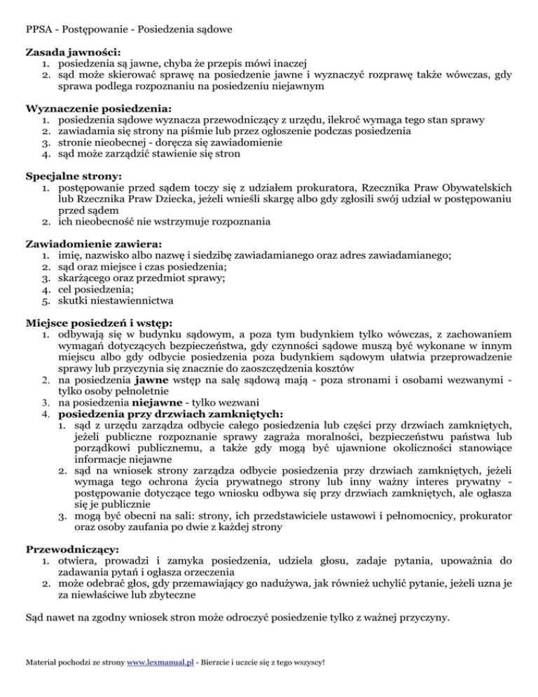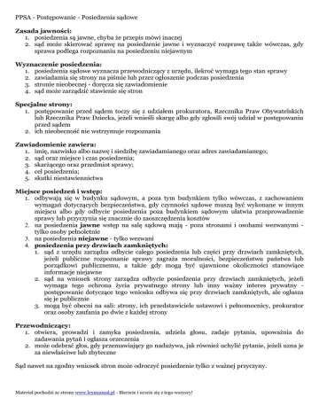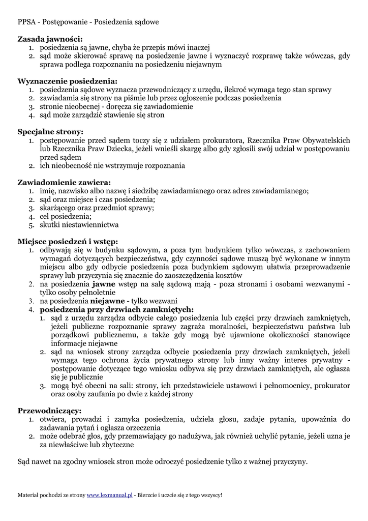 PPSA - Postępowanie - Posiedzenia sądowe Zasada jawności: 1. posiedzenia są jawne, chyba że przepis mówi inaczej 2. sąd może skierować sprawę na posiedzenie jawne i wyznaczyć rozprawę także wówczas, gdy sprawa podlega rozpoznaniu na posiedzeniu niejawnym Wyznaczenie posiedzenia: 1. posiedzenia sądowe wyznacza przewodniczący z urzędu, ilekroć wymaga tego stan sprawy 2. zawiadamia się strony na piśmie lub przez ogłoszenie podczas posiedzenia 3. stronie nieobecnej - doręcza się zawiadomienie 4. sąd może zarządzić stawienie się stron Specjalne strony: 1. postępowanie przed sądem toczy się z udziałem prokuratora, Rzecznika Praw Obywatelskich lub Rzecznika Praw Dziecka, jeżeli wnieśli skargę albo gdy zgłosili swój udział w postępowaniu przed sądem 2. ich nieobecność nie wstrzymuje rozpoznania Zawiadomienie zawiera: 1. imię, nazwisko albo nazwę i siedzibę zawiadamianego oraz adres zawiadamianego; 2. sąd oraz miejsce i czas posiedzenia; 3. skarżącego oraz przedmiot sprawy; 4. cel posiedzenia; 5. skutki niestawiennictwa Miejsce posiedzeń i wstęp: 1. odbywają się w budynku sądowym, a poza tym budynkiem tylko wówczas, z zachowaniem wymagań dotyczących bezpieczeństwa, gdy czynności sądowe muszą być wykonane w innym miejscu albo gdy odbycie posiedzenia poza budynkiem sądowym ułatwia przeprowadzenie sprawy lub przyczynia się znacznie do zaoszczędzenia kosztów 2. na posiedzenia jawne wstęp na salę sądową mają - poza stronami i osobami wezwanymi tylko osoby pełnoletnie 3. na posiedzenia niejawne - tylko wezwani 4. posiedzenia przy drzwiach zamkniętych: 1. sąd z urzędu zarządza odbycie całego posiedzenia lub części przy drzwiach zamkniętych, jeżeli publiczne rozpoznanie sprawy zagraża moralności, bezpieczeństwu państwa lub porządkowi publicznemu, a także gdy mogą być ujawnione okoliczności stanowiące informacje niejawne 2. sąd na wniosek strony zarządza odbycie posiedzenia przy drzwiach zamkniętych, jeżeli wymaga tego ochrona życia prywatnego strony lub inny ważny interes prywatny postępowanie dotyczące tego wniosku odbywa się przy drzwiach zamkniętych, ale ogłasza się je publicznie 3. mogą być obecni na sali: strony, ich przedstawiciele ustawowi i pełnomocnicy, prokurator oraz osoby zaufania po dwie z każdej strony Przewodniczący: 1. otwiera, prowadzi i zamyka posiedzenia, udziela głosu, zadaje pytania, upoważnia do zadawania pytań i ogłasza orzeczenia 2. może odebrać głos, gdy przemawiający go nadużywa, jak również uchylić pytanie, jeżeli uzna je za niewłaściwe lub zbyteczne Sąd nawet na zgodny wniosek stron może odroczyć posiedzenie tylko z ważnej przyczyny. Materiał pochodzi ze strony www.lexmanual.pl - Bierzcie i uczcie się z tego wszyscy! PPSA - Postępowanie - Posiedzenia sądowe Protokół: 1. z przebiegu posiedzenia jawnego protokolant pod kierunkiem przewodniczącego spisuje protokół 2. z posiedzenia niejawnego sporządza się notatkę urzędową, jeżeli nie wydano orzeczenia 3. zawartość protokołu: 1. oznaczenie sądu, miejsca i daty posiedzenia, imiona i nazwiska sędziów, protokolanta, prokuratora, stron, jak również obecnych na posiedzeniu przedstawicieli ustawowych i pełnomocników oraz oznaczenie sprawy i wzmiankę co do jawności 2. przebieg posiedzenia, w szczególności wnioski i twierdzenia stron, wymienienie zarządzeń i orzeczeń wydanych na posiedzeniu oraz stwierdzenie, czy zostały ogłoszone; jeżeli sporządzenie odrębnej sentencji orzeczenia nie jest wymagane, wystarcza zamieszczenie w protokole treści samego rozstrzygnięcia; zamiast podania wniosków i twierdzeń można w protokole powołać się na pisma przygotowawcze 3. czynności stron mające znaczenie dla rozstrzygnięcia sprawy 4. podpis przewodniczącego i protokolanta 4. przebieg czynności protokołowanych może być ponadto utrwalony za pomocą aparatury dźwiękowej, o czym należy przed uruchomieniem aparatury uprzedzić wszystkie osoby uczestniczące w czynności 5. sprostowanie - strony mogą żądać sprostowania lub uzupełnienia protokołu na następnym posiedzeniu, nie później jednak niż w terminie trzydziestu dni od dnia posiedzenia, z którego sporządzono protokół - od zarządzenia przewodniczącego strony mogą odwołać się do sądu w terminie siedmiu dni od doręczenia im zarządzenia 6. załącznik - w toku posiedzenia wnioski, oświadczenia, uzupełnienia i sprostowania wniosków i oświadczeń można zamieścić w załączniku do protokołu - gdy stronę zastępuje adwokat, radca prawny, doradca podatkowy lub rzecznik patentowy, przewodniczący może zażądać złożenia takiego załącznika w wyznaczonym terminie 7. uchybienie przepisom postępowania: 1. strony mogą w toku posiedzenia, a jeżeli nie były obecne, na najbliższym posiedzeniu, zwrócić uwagę sądu na uchybienia przepisom postępowania, wnosząc o wpisanie zastrzeżenia do protokołu 2. stronie, która zastrzeżenia nie zgłosiła, nie przysługuje prawo powoływania się na takie uchybienia w dalszym toku postępowania, chyba że chodzi o przepisy postępowania, których naruszenie sąd powinien wziąć pod rozwagę z urzędu, albo gdy strona uprawdopodobni, iż nie zgłosiła zastrzeżeń bez swojej winy Przebieg postępowania: 1. po wywołaniu sprawy rozprawa rozpoczyna się od sprawozdania sędziego, który zwięźle przedstawia na podstawie akt stan sprawy ze szczególnym uwzględnieniem zarzutów skargi 2. strony - najpierw skarżący, a potem organ - zgłaszają ustnie swoje żądania i wnioski oraz składają wyjaśnienia 3. strony mogą ponadto wskazywać podstawy prawne i faktyczne swych żądań i wniosków 4. przewodniczący udziela głosu pozostałym stronom według ustalonej przez siebie kolejności 5. sąd może z urzędu lub na wniosek stron przeprowadzić dowody uzupełniające z dokumentów, jeżeli jest to niezbędne do wyjaśnienia istotnych wątpliwości i nie sp