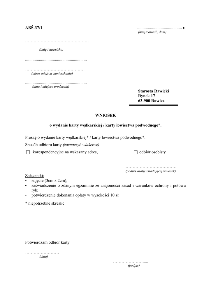 ABŚ-37/1 .......................................... r. (miejscowość, data) ……………………………………… (imię i nazwisko) .......................................................... …………………………………… (adres miejsca zamieszkania) .......................................................... (data i miejsce urodzenia) Starosta Rawicki Rynek 17 63-900 Rawicz WNIOSEK o wydanie karty wędkarskiej / karty łowiectwa podwodnego*. Proszę o wydanie karty wędkarskiej* / karty łowiectwa podwodnego*. Sposób odbioru karty (zaznaczyć właściwe) korespondencyjne na wskazany adres, odbiór osobisty ……………………………… (podpis osoby składającej wniosek) Załączniki: - zdjęcie (3cm x 2cm); - zaświadczenie o zdanym egzaminie ze znajomości zasad i warunków ochrony i połowu ryb; - potwierdzenie dokonania opłaty w wysokości 10 zł * niepotrzebne skreślić Potwierdzam odbiór karty …………………… (data) …………………..... (podpis)