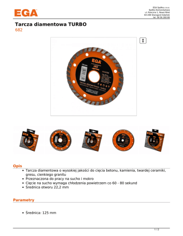 EGA Spółka z o.o. Spółka Komandytowa ul. Rzeczna 1, Nowa Wieś 83-200 Starogard Gdański tel. 58 56 300 80 Tarcza diamentowa TURBO 682 Opis Tarcza diamentowa o wysokiej jakości do cięcia betonu, kamienia, twardej ceramiki, gresu, cienkiego granitu Przeznaczona do pracy na sucho i mokro Cięcie na sucho wymaga chłodzenia powietrzem co 60 - 80 sekund Średnica otworu 22,2 mm Parametry Średnica: 125 mm 1/2 EGA Spółka z o.o. Spółka Komandytowa ul. Rzeczna 1, Nowa Wieś 83-200 Starogard Gdański tel. 58 56 300 80 Pakowanie Zbiorcze Karton: 100 szt. Warianty Lp. Nr katalogowy EAN Średnica (mm) 1 682 5905912676822 115 2 683 5905912676839 125 3 685 5905912676853 230 2/2 Powered by TCPDF (www.tcpdf.org)