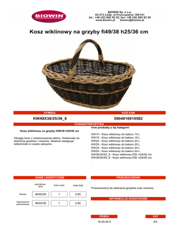 Kosz wiklinowy na grzyby fi49/38 h25/36 cm SYMBOL KOD EAN KW49X38/25/36_8 5904816910582 CHARAKTERYSTYKA Inne produkty z tej kategorii: Kosz wiklinowy na grzyby fi49/38 h25/36 cm KW10 - Kosz wiklinowy do balonu 10 L KW15 - Kosz wiklinowy do balonu 15 L Okrągły kosz z nieokorowanej wikliny. Doskonały do KW20 - Kosz wiklinowy do balonu 20 L zbierania grzybów i owoców. Idealnie zastępuje reklamówki w czasie zakupów. KW25 - Kosz wiklinowy do balonu 25 L KW34 - Kosz wiklinowy do balonu 34 L KW54 - Kosz wiklinowy do balonu 54 L KW30/24/42_8 - Kosz wiklinowy fi30, h24/42 cm KW36/25/50_8 - Kosz wiklinowy fi36, h25/50 cm . DANE LOGISTYCZNE Sztuka szer/gł/wys [cm] Ilość sztuk 49/40/39 1 PRZEZNACZENIE waga [kg] Przeznaczony do zbierania grzybów oraz owoców 0,95 INFORMACJE DODATKOWE Opakowanie jednostkowe 49/40/39 1 0,95 PKWiU VAT 16.29.25.0 8%