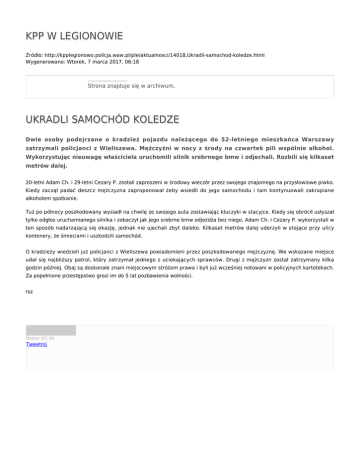 KPP W LEGIONOWIE Źródło: http://kpplegionowo.policja.waw.pl/ple/aktualnosci/14018,Ukradli-samochod-koledze.html Wygenerowano: Wtorek, 7 marca 2017, 06:18 Strona znajduje się w archiwum. UKRADLI SAMOCHÓD KOLEDZE Dwie osoby podejrzane o kradzież pojazdu należącego do 52-letniego mieszkańca Warszawy zatrzymali policjanci z Wieliszewa. Mężczyźni w nocy z środy na czwartek pili wspólnie alkohol. Wykorzystując nieuwagę właściciela uruchomili silnik srebrnego bmw i odjechali. Rozbili się kilkaset metrów dalej. 20-letni Adam Ch. i 29-letni Cezary P. zostali zaproszeni w środowy wieczór przez swojego znajomego na przysłowiowe piwko. Kiedy zaczął padać deszcz mężczyzna zaproponował żeby wsiedli do jego samochodu i tam kontynuowali zakrapiane alkoholem spotkanie. Tuż po północy poszkodowany wysiadł na chwilę ze swojego auta zostawiając kluczyki w stacyjce. Kiedy się obrócił usłyszał tylko odgłos uruchamianego silnika i zobaczył jak jego srebrne bmw odjeżdża bez niego. Adam Ch. i Cezary P. wykorzystali w ten sposób nadarzającą się okazję, jednak nie ujechali zbyt daleko. Kilkaset metrów dalej uderzyli w stojące przy ulicy kontenery, że śmieciami i uszkodzili samochód. O kradzieży wiedzieli już policjanci z Wieliszewa powiadomieni przez poszkodowanego mężczyznę. We wskazane miejsce udał się najbliższy patrol, który zatrzymał jednego z uciekających sprawców. Drugi z mężczyzn został zatrzymany kilka godzin później. Obaj są doskonale znani miejscowym stróżom prawa i byli już wcześniej notowani w policyjnych kartotekach. Za popełnione przestępstwo grozi im do 5 lat pozbawienia wolności. rsz Ocena: 0/5 (0) Tweetnij