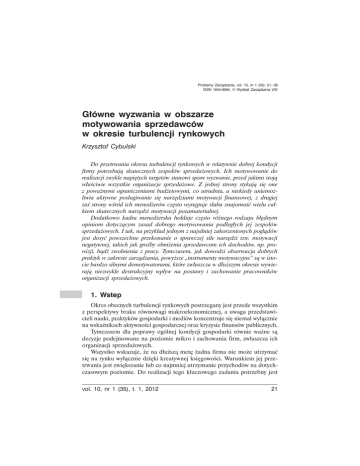 Problemy ZarzÈdzania, vol. 10, nr 1 (35): 21 – 36 ISSN 1644-9584, © Wydziaï ZarzÈdzania UW Gïówne wyzwania w obszarze motywowania sprzedawców w okresie turbulencji rynkowych Krzysztof Cybulski Do przetrwania okresu turbulencji rynkowych w relatywnie dobrej kondycji firmy potrzebujÈ skutecznych zespoïów sprzedaĝowych. Ich motywowanie do realizacji zwykle napiÚtych targetów stanowi spore wyzwanie, przed jakimi stojÈ wïaĂciwie wszystkie organizacje sprzedaĝowe. Z jednej strony stykajÈ siÚ one zb powaĝnymi ograniczeniami budĝetowymi, co utrudnia, a niekiedy uniemoĝliwia aktywne posïugiwanie siÚ narzÚdziami motywacji finansowej, z drugiej zaĂ strony wĂród ich menedĝerów czÚsto wystÚpuje sïaba znajomoĂÊ wielu caïkiem skutecznych narzÚdzi motywacji pozamaterialnej. Dodatkowo kadra menedĝerska hoïduje czÚsto róĝnego rodzaju bïÚdnym opiniom dotyczÈcym zasad dobrego motywowania podlegïych jej zespoïów sprzedaĝowych. I tak, na przykïad jednym z najsilniej zakorzenionych poglÈdów jest dosyÊ powszechne przekonanie o sprawczej sile narzÚdzi tzw. motywacji negatywnej, takich jak groěby obniĝenia sprzedawcom ich dochodów, np. prowizji, bÈdě zwolnienia z pracy. Tymczasem, jak dowodzi obserwacja dobrych praktyk w zakresie zarzÈdzania, powyĝsze „instrumenty motywacyjne” sÈ wbistocie bardzo silnymi demotywatorami, które zwïaszcza w dïuĝszym okresie wywierajÈ niezwykle destrukcyjny wpïyw na postawy i zachowanie pracowników organizacji sprzedaĝowych. 1. Wstep Okres obecnych turbulencji rynkowych postrzegany jest przede wszystkim z perspektywy braku równowagi makroekonomicznej, a uwaga przedstawicieli nauki, praktyków gospodarki i mediów koncentruje siÚ niemal wyïÈcznie na wskaěnikach aktywnoĂci gospodarczej oraz kryzysie finansów publicznych. Tymczasem dla poprawy ogólnej kondycji gospodarki równie waĝne sÈ decyzje podejmowane na poziomie mikro i zachowania firm, zwïaszcza ich organizacji sprzedaĝowych. Wszystko wskazuje, ĝe na dïuĝszÈ metÚ ĝadna firma nie moĝe utrzymaÊ siÚ na rynku wyïÈcznie dziÚki kreatywnej ksiÚgowoĂci. Warunkiem jej przetrwania jest zwiÚkszanie lub co najmniej utrzymanie przychodów na dotychczasowym poziomie. Do realizacji tego kluczowego zadania potrzebny jest vol. 10, nr 1 (35), t. 1, 2012 21 Krzysztof Cybulski zaĂ zespóï skutecznych i naleĝycie motywowanych sprzedawców (Zoltners, Singha i Lorimer 2009). Motywowanie sprzedawców stanowi jeden z trudniejszych problemów, jakie w praktyce przychodzi rozwiÈzywaÊ menedĝerom ds. sprzedaĝy. Jego znaczenie w szczególny sposób wzrasta w okresie znaczÈcego spowolnienia gospodarki, a utrzymanie wysokiej aktywnoĂci specjalistów ds. sprzedaĝy wbistotny sposób decyduje o zachowaniu przez organizacjÚ pïynnoĂci finansowej i znaczÈco zwiÚksza jej szanse na przetrwanie (Albrecht, Manoogian i Shastri 2010; Boyle 2009; Cora 2010). Motywacja personelu organizacji sprzedaĝowych zdaje siÚ nie tylko kluczem do przetrwania przez firmÚ trudnego okresu turbulencji, ale ponadto moĝe staÊ siÚ ěródïem jej unikalnej przewagi konkurencyjnej (Mansoat i Mobus 2006: 5; Wilson 2004; Wellins, Cosentiono i Thomas 2004; Fairchild 2010). JednoczeĂnie wystÚpujÈce w warunkach turbulencji ograniczenia budĝetowe powodujÈ, ĝe firmy, aby skutecznie motywowaÊ swoje zespoïy sprzedaĝowe, muszÈ siÚgaÊ po bardziej nowatorskie rozwiÈzania wychodzÈce poza pakiet narzÚdzi motywacji materialnej (Wakeling 2010). 2. Turbulencje rynkowe, ich przejawy oraz waĝne konsekwencje Zarówno przedstawiciele nauki, jak teĝ praktycy gospodarki nie sÈ do koñca zgodni co do charakteru aktualnych zmian rynkowych. Spór dotyczy fundamentalnej w istocie kwestii, czy obecne turbulencje to jedynie chwilowa dekoniunktura, a moĝe faza gïÚbszej recesji, czy moĝe jedynie preludium do naprawdÚ wielkiego kryzysu (Kotler i Caslione 2009: 28–33). CechÈ charakterystycznÈ obecnych turbulencji jest to, ĝe nie moĝna ich odwzorowaÊ ani przewidywaÊ, a pierwotnie drobne zmiany w zewnÚtrznym bÈdě w wewnÚtrznym otoczeniu firmy bardzo silnie wpïywajÈ na jej wyniki (Kotler i Caslione 2009: 28–33). ObecnÈ sytuacjÚ rynkowa charakteryzujÈ równieĝ inne negatywne symptomy, takie jak (Organizacje sprzedaĝowe wb okresie recesji… 2010): – zmiennoĂÊ i nieprzewidywalnoĂÊ otoczenia utrudniajÈca racjonalne planowanie i realizacjÚ jakiejkolwiek dïugofalowej strategii; – bardzo szybkie rozprzestrzenianie siÚ negatywnych zachowañ i zjawisk oraz opinii, postaw i nastrojów; – przesadna ostroĝnoĂÊ oraz brak zaufania wystÚpujÈce wĂród partnerów rynkowych, a w konsekwencji niepewnoĂÊ co do planów i intencji biznesowych; – ogromna iloĂÊ czÚsto sprzecznych informacji, a jednoczeĂnie utrudniony dostÚp do danych naleĝycie opisujÈcych rzeczywistoĂÊ; – ograniczenie do minimum wszelkich inwestycji – zarówno wĂród firm prywatnych, jak teĝ w sektorze publicznym – i jednoczesne spowolnienie procedur zakupowych u klientów instytucjonalnych; 22 Problemy ZarzÈdzania Gïówne wyzwania w obszarze motywowania sprzedawców w okresie turbulencji... – spadek sprzedaĝy wywoïany przez zmniejszanie siÚ grup docelowych oraz generalnie zïÈ sytuacjÚ finansowa klientów i dystrybutorów; – konkurencja wymuszajÈca redukcjÚ kosztów, obniĝanie cen i marĝy; – presja wywierana na menedĝerów ze strony wïaĂcicieli i zarzÈdów firm na zmniejszenie rozmiarów zatrudnienia – takĝe w dziaïach sprzedaĝy; – wyraěne pogorszenie siÚ warunków zatrudnienia, równieĝ w dziaïach sprzedaĝy, czego symptomami sÈ niekorzystne dla sprzedawców umowy o pracÚ, wyĝsze niĝ zwykle targety, a przede wszystkim mordercza presja na realizacjÚ wïaĂciwie niewykonalnych zadañ sprzedaĝowych. Generalnie moĝna zauwaĝyÊ, ĝe warunki, jakie istniejÈ w okresie turbulencji, nie sprzyjajÈ w jakiĂ szczególny sposób efektywnej polityce m
