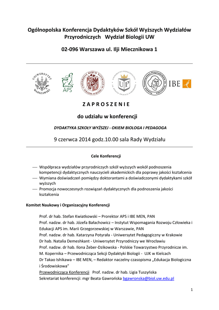 Ogólnopolska Konferencja Dydaktyków Szkół Wyższych Wydziałów Przyrodniczych Wydział Biologii UW 02-096 Warszawa ul. Ilji Miecznikowa 1 ZAPROSZENIE do udziału w konferencji DYDAKTYKA SZKOŁY WYŻSZEJ - OKIEM BIOLOGA I PEDAGOGA 9 czerwca 2014 godz.10.00 sala Rady Wydziału Cele Konferencji Współpraca wydziałów przyrodniczych szkół wyższych wokół podnoszenia kompetencji dydaktycznych nauczycieli akademickich dla poprawy jakości kształcenia Wymiana doświadczeń pomiędzy doktorantami a doświadczonymi dydaktykami szkół wyższych Promocja nowoczesnych rozwiązań dydaktycznych dla podnoszenia jakości kształcenia Komitet Naukowy i Organizacyjny Konferencji Prof. dr hab. Stefan Kwiatkowski – Prorektor APS i IBE MEN, PAN Prof. nadzw. dr hab. Józefa Bałachowicz – Instytut Wspomagania Rozwoju Człowieka i Edukacji APS im. Marii Grzegorzewskiej w Warszawie, PAN Prof. nadzw. dr hab. Katarzyna Potyrała - Uniwersytet Pedagogiczny w Krakowie Dr hab. Natalia Demeshkant - Uniwersytet Przyrodniczy we Wrocławiu Prof. nadzw. dr hab. Ilona Żeber-Dzikowska - Polskie Towarzystwo Przyrodnicze im. M. Kopernika – Przewodnicząca Sekcji Dydaktyki Biologii - UJK w Kielcach Dr Takao Ishikawa – IBE MEN, – Redaktor naczelny czasopisma „Edukacja Biologiczna i Środowiskowa” Przewodnicząca Konferencji Prof. nadzw. dr hab. Ligia Tuszyńska Sekretariat konferencji: mgr Beata Gawrońska [email protected] 1 Program Konferencji - 9 czerwca 2014 godz. 10.00 Powitanie uczestników konferencji przez Dziekana Wydziału Biologii UW – otwarcie konferencji I. II. Promocja książki pt. „O dydaktyce szkoły wyższej zdaniem biologa i pedagoga” Wyd. APS 2014 Książka pod redakcją Ligi Tuszyńskiej jest zbiorem esejów napisanych przez doktorantów Wydziału Biologii UW i Wydziału Nauk Pedagogicznych APS, którzy odbyli zajęcia z przedmiotu Dydaktyka Szkoły Wyższej na pierwszym roku studiów doktoranckich w 2013 roku. wystąpienia dwóch autorów esejów 2 x 10 min. (pedagog i biolog) Dydaktyka szkoły wyższej okiem wykładowcy uniwersyteckiego Dr Andrzej Rozmus - autor książki: Wykładowca Doskonały „Drogi doskonalenia indywidualnego stylu prowadzenia zajęć dydaktycznych” Dr Łukasz Błąd "Antywykład" - czyli jak na pewno nie można prowadzić zajęć dydaktycznych • Wystąpienia dotyczące realizacji programów przedmiotu Dydaktyka Szkoły Wyższej na studiach III stopnia - prezentacje 10 minutowe tytuły wybrane spośród zgłoszonych przez uczestników konferencji. • Dyskusja Przerwa obiadowa III. Nauczyciel akademicki jako przywódca edukacyjny wśród społeczności lokalnej Wykład wprowadzający wygłosi prof. dr hab. Stefan Kwiatkowski – APS, IBE. Wystąpienia uczestników konferencji (10 minutowe) na temat: Kompetencje nauczyciela akademickiego w zakresie edukacji na rzecz lokalnego środowiska; Założenia i praktyka dydaktycznej transformacji wiedzy Godz. 16.30 Podsumowanie konferencji Przewidujemy publikację artykułów zakwalifikowanych po recenzjach w czasopiśmie „Edukacja Biologiczna i Środowiskowa” (5 pkt. MNiSW) 2