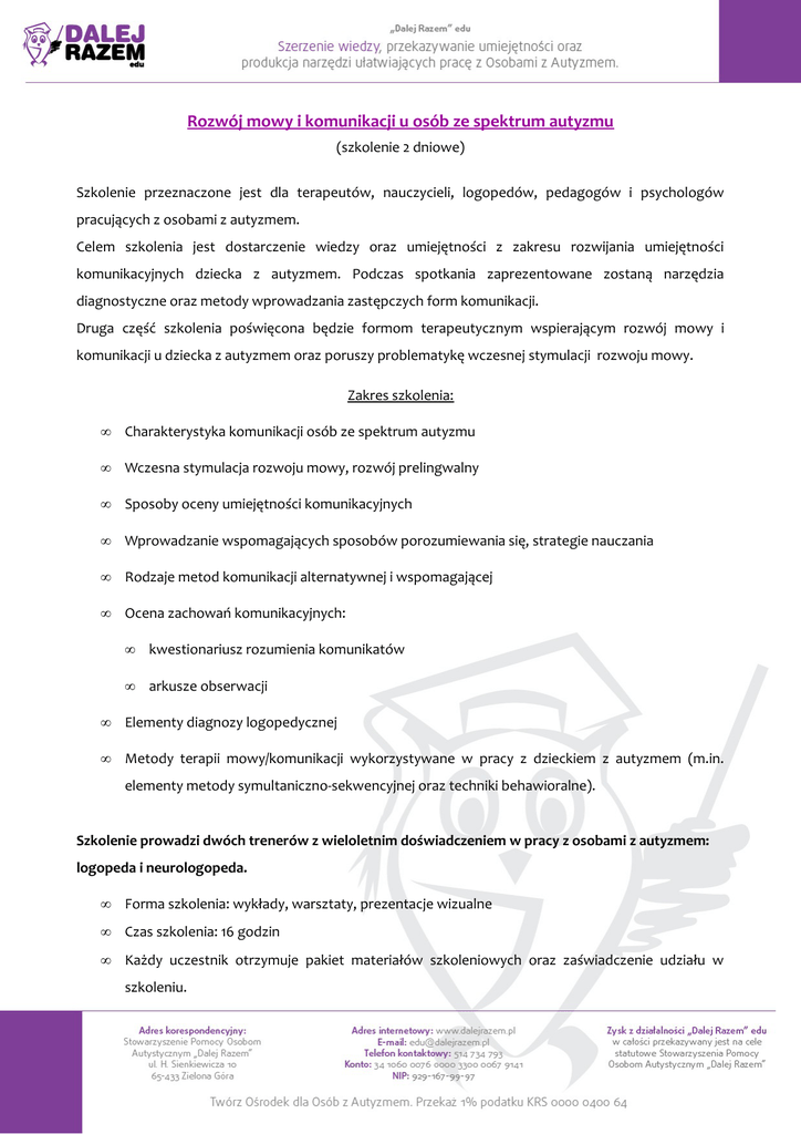 Rozwój mowy i komunikacji u osób ze spektrum autyzmu (szkolenie 2 dniowe) Szkolenie przeznaczone jest dla terapeutów, nauczycieli, logopedów, pedagogów i psychologów pracujących z osobami z autyzmem. Celem szkolenia jest dostarczenie wiedzy oraz umiejętności z zakresu rozwijania umiejętności komunikacyjnych dziecka z autyzmem. Podczas spotkania zaprezentowane zostaną narzędzia diagnostyczne oraz metody wprowadzania zastępczych form komunikacji. Druga część szkolenia poświęcona będzie formom terapeutycznym wspierającym rozwój mowy i komunikacji u dziecka z autyzmem oraz poruszy problematykę wczesnej stymulacji rozwoju mowy. Zakres szkolenia: • Charakterystyka komunikacji osób ze spektrum autyzmu • Wczesna stymulacja rozwoju mowy, rozwój prelingwalny • Sposoby oceny umiejętności komunikacyjnych • Wprowadzanie wspomagających sposobów porozumiewania się, strategie nauczania • Rodzaje metod komunikacji alternatywnej i wspomagającej • Ocena zachowań komunikacyjnych: • kwestionariusz rozumienia komunikatów • arkusze obserwacji • Elementy diagnozy logopedycznej • Metody terapii mowy/komunikacji wykorzystywane w pracy z dzieckiem z autyzmem (m.in. elementy metody symultaniczno-sekwencyjnej oraz techniki behawioralne). Szkolenie prowadzi dwóch trenerów z wieloletnim doświadczeniem w pracy z osobami z autyzmem: logopeda i neurologopeda. • Forma szkolenia: wykłady, warsztaty, prezentacje wizualne • Czas szkolenia: 16 godzin • Każdy uczestnik otrzymuje pakiet materiałów szkoleniowych oraz zaświadczenie udziału w szkoleniu.