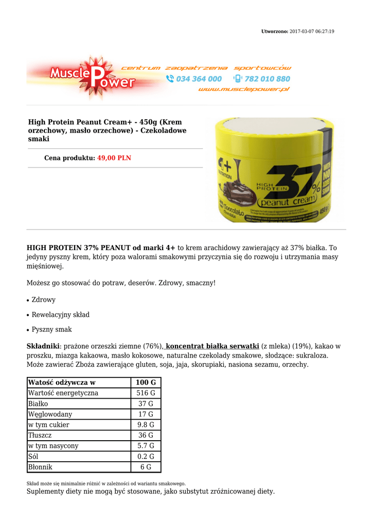 Utworzono: 2017-03-07 06:27:19 High Protein Peanut Cream+ - 450g (Krem orzechowy, masło orzechowe) - Czekoladowe smaki Cena produktu: 49,00 PLN HIGH PROTEIN 37% PEANUT od marki 4+ to krem arachidowy zawierający aż 37% białka. To jedyny pyszny krem, który poza walorami smakowymi przyczynia się do rozwoju i utrzymania masy mięśniowej. Możesz go stosować do potraw, deserów. Zdrowy, smaczny! ● Zdrowy ● Rewelacyjny skład ● Pyszny smak Składniki: prażone orzeszki ziemne (76%), koncentrat białka serwatki (z mleka) (19%), kakao w proszku, miazga kakaowa, masło kokosowe, naturalne czekolady smakowe, słodzące: sukraloza. Może zawierać Zboża zawierające gluten, soja, jaja, skorupiaki, nasiona sezamu, orzechy. Watość odżywcza w 100 G Wartość energetyczna 516 G Białko 37 G Węglowodany 17 G w tym cukier 9.8 G Tłuszcz 36 G w tym nasycony 5.7 G Sól 0.2 G Błonnik 6G Skład może się minimalnie różnić w zależności od wariantu smakowego. Suplementy diety nie mogą być stosowane, jako substytut zróżnicowanej diety. Pamiętaj, że tylko zdrowy tryb życia i zrównoważony sposób odżywiania zapewniają prawidłowe funkcjonowanie organizmu i zachowanie dobrej kondycji. Sposób użycia: Spożywać według własnego zapotrzebowania. Nie przekraczać zalecanej porcji do spożycia w ciągu dnia. Produkt nie może być stosowany przez osoby uczulone na którykolwiek z jego składników. Najlepiej spożyć przed końcem: miesiąc, rok pod kodem kreskowym Numer partii produkcyjnej: pod kodem kreskowym Przechowywać w miejscu niedostępnym dla małych dzieci. Przechowywać w miejscu suchym w temperaturze pokojowej w szczelnie zamkniętych opakowaniach. Masa netto opakowania: 450g Adres: http://www.muscle.trustnet.pl/ Telefon: 34 36 43 000, 782 010 880 Email: [email protected]